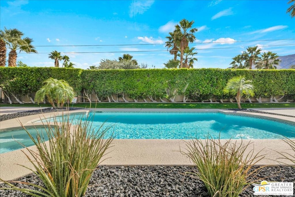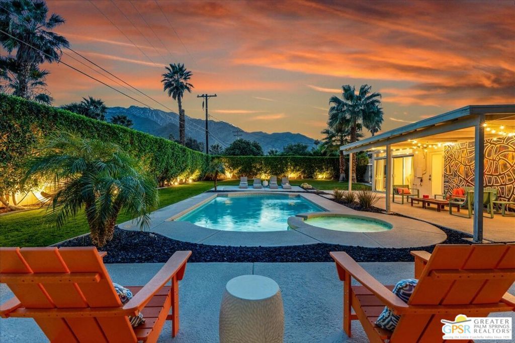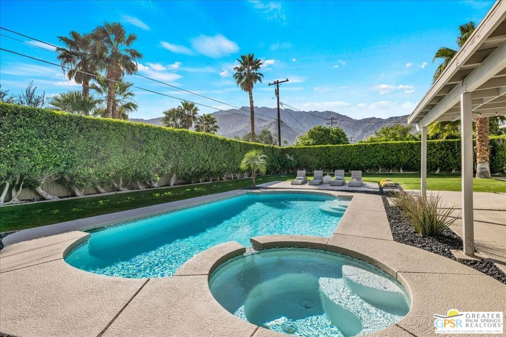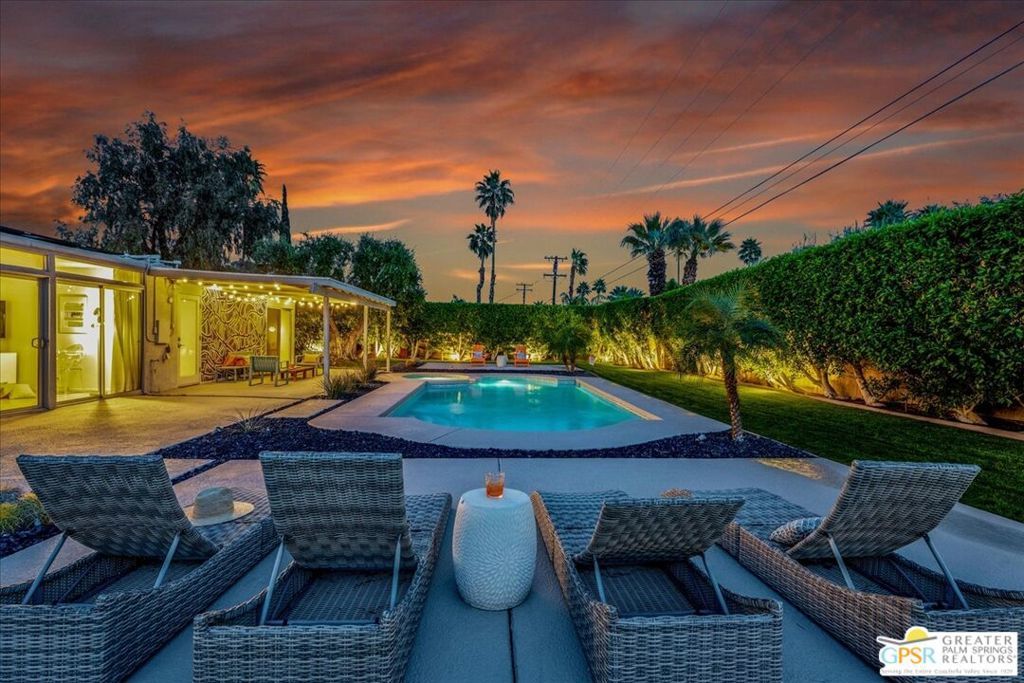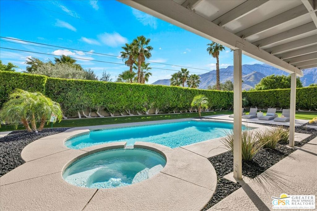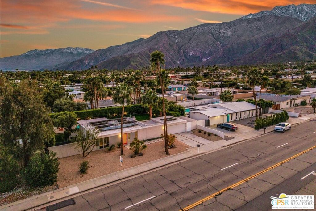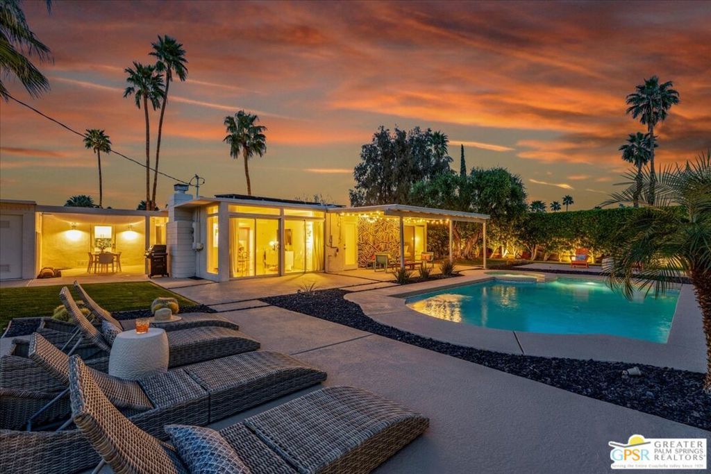 A "Palmer & Krisel" Original. Nestled in the historic and iconic Racquet Club Estates, this Mid-Century stunner designed by Palmer & Krisel and built by Alexander Construction Co. perfectly captures the innovative spirit of desert modernism. This neighborhood is a true reminder of the importance of design, famous for its five distinct rooflines and architectural pedigree highlighted by open floor plans, atriums, and breezeways. Inside, the signature post-and-beam construction is flooded with California sunshine via breathtaking walls of glass and strategically placed clerestory windows that frame the incredible San Jacinto mountain views. While retaining its 1959 soul, this residence has been meticulously updated for the 21st century to blend vintage charm with modern luxury. The unique, restored floating iron and tile fireplace serves as a stunning focal point for cool desert nights, complemented by glossy tile floors. The kitchen features Caesarstone counters, custom cabinetry, and sleek stainless steel appliances. Even the bathrooms have been thoughtfully coordinated with modern mosaic accent tiles that feel authentically Palm Springs. Practical updates like OWNED solar, an EV charger in the garage, updated plumbing, and dual-pane windows ensure this classic home functions with contemporary efficiency. Designed for the quintessential indoor-outdoor living experience, the spacious south-facing backyard is a private resort and the ultimate Palm Springs lifestyle. A gorgeous swimming pool invites you to float for hours, while a jetted spa helps you de-stress under the starry desert nights. The outdoor space is an entertainer's dream, featuring a custom sunshade canopy and a covered patio defined by a vibrant artist-curated mural. Whether you're sipping cocktails by the mural wall or rinsing off in the tiled outdoor shower, every inch is framed by beautiful landscaping and striking views. Located just blocks from the chic downtown area and all things cool Palm Springs has to offer. This home is a magnet for architecture fans seeking a sophisticated second home or a full-time residence. Welcome to Racquet Club Estates, stop dreaming and start living the life you've always imagined.