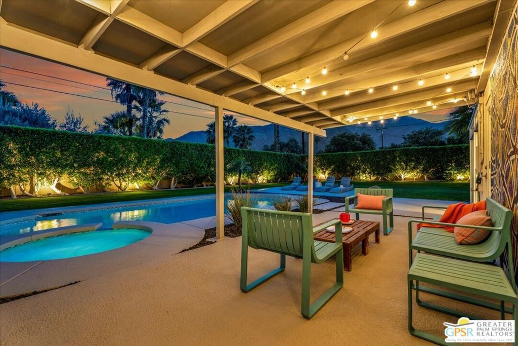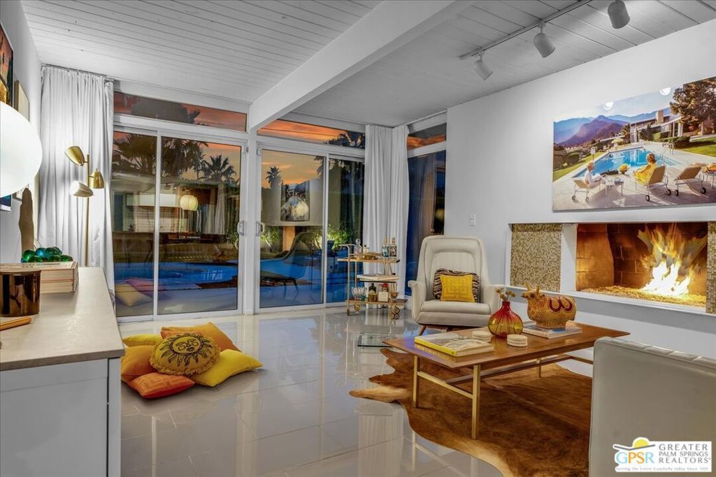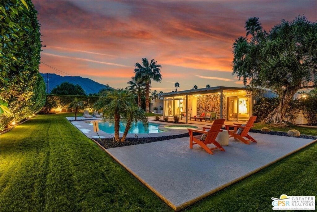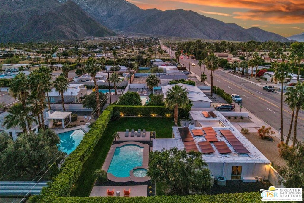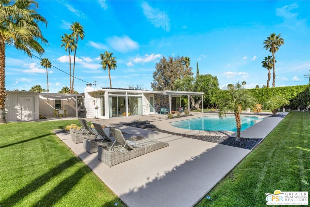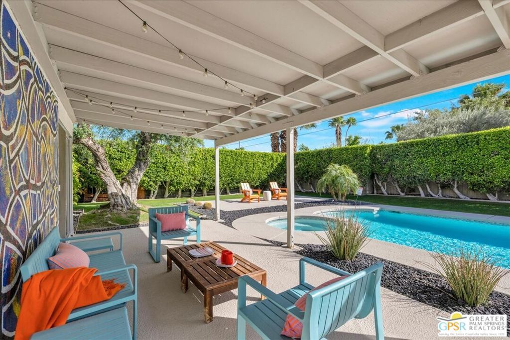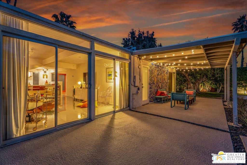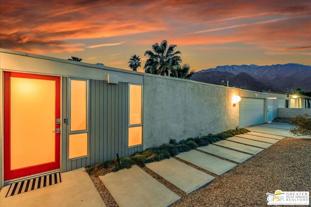 A "Palmer & Krisel" Original. Nestled in the historic and iconic Racquet Club Estates, this Mid-Century stunner designed by Palmer & Krisel and built by Alexander Construction Co. perfectly captures the innovative spirit of desert modernism. This neighborhood is a true reminder of the importance of design, famous for its five distinct rooflines and architectural pedigree highlighted by open floor plans, atriums, and breezeways. Inside, the signature post-and-beam construction is flooded with California sunshine via breathtaking walls of glass and strategically placed clerestory windows that frame the incredible San Jacinto mountain views. While retaining its 1959 soul, this residence has been meticulously updated for the 21st century to blend vintage charm with modern luxury. The unique, restored floating iron and tile fireplace serves as a stunning focal point for cool desert nights, complemented by glossy tile floors. The kitchen features Caesarstone counters, custom cabinetry, and sleek stainless steel appliances. Even the bathrooms have been thoughtfully coordinated with modern mosaic accent tiles that feel authentically Palm Springs. Practical updates like OWNED solar, an EV charger in the garage, updated plumbing, and dual-pane windows ensure this classic home functions with contemporary efficiency. Designed for the quintessential indoor-outdoor living experience, the spacious south-facing backyard is a private resort and the ultimate Palm Springs lifestyle. A gorgeous swimming pool invites you to float for hours, while a jetted spa helps you de-stress under the starry desert nights. The outdoor space is an entertainer's dream, featuring a custom sunshade canopy and a covered patio defined by a vibrant artist-curated mural. Whether you're sipping cocktails by the mural wall or rinsing off in the tiled outdoor shower, every inch is framed by beautiful landscaping and striking views. Located just blocks from the chic downtown area and all things cool Palm Springs has to offer. This home is a magnet for architecture fans seeking a sophisticated second home or a full-time residence. Welcome to Racquet Club Estates, stop dreaming and start living the life you've always imagined.