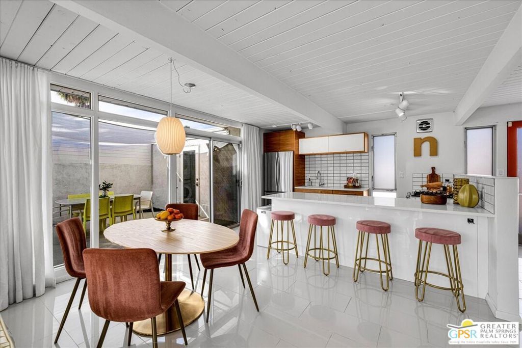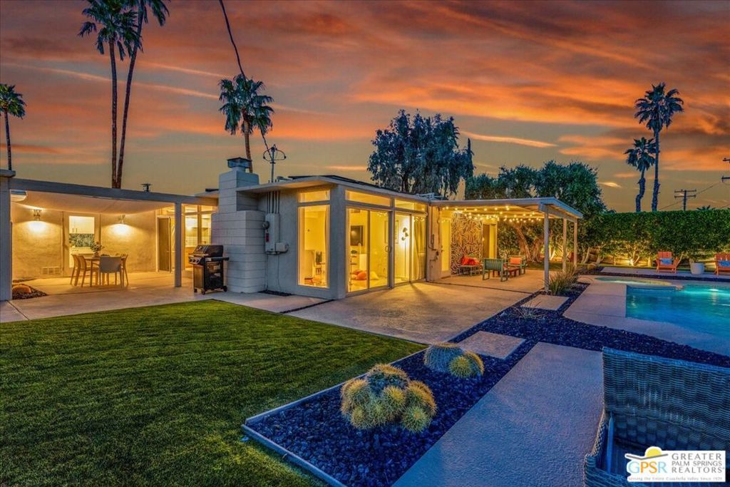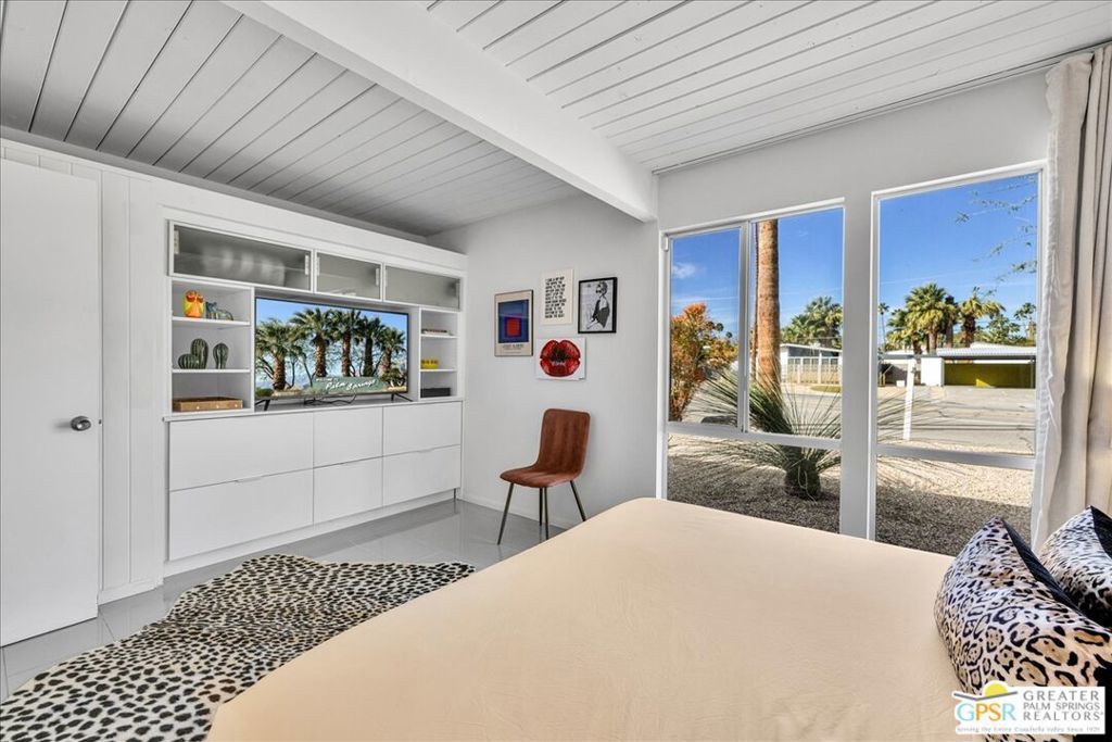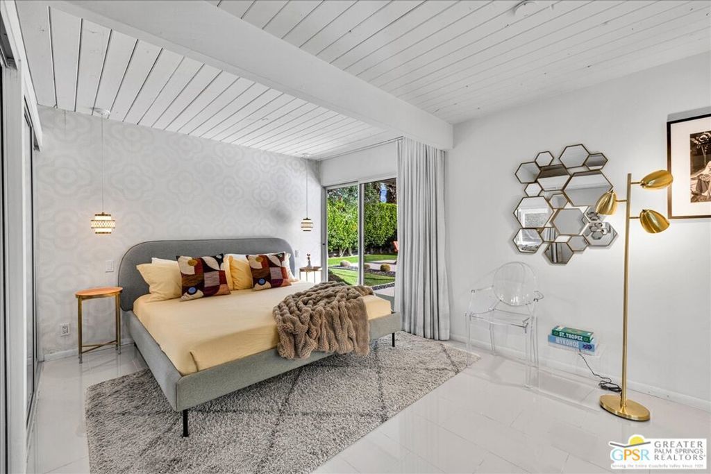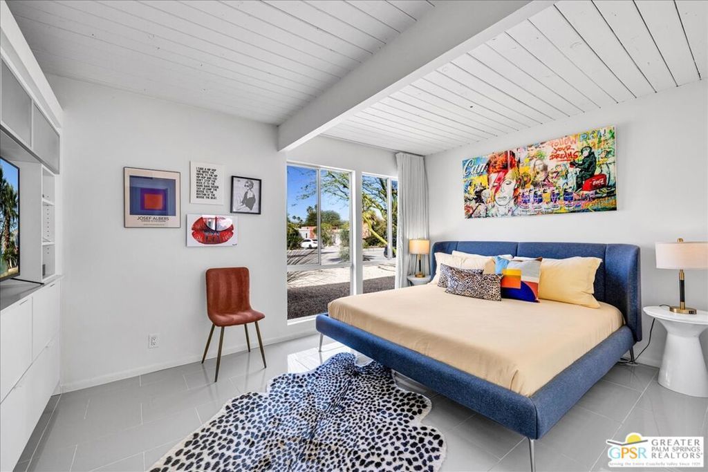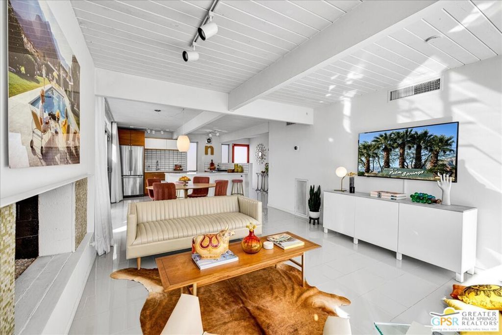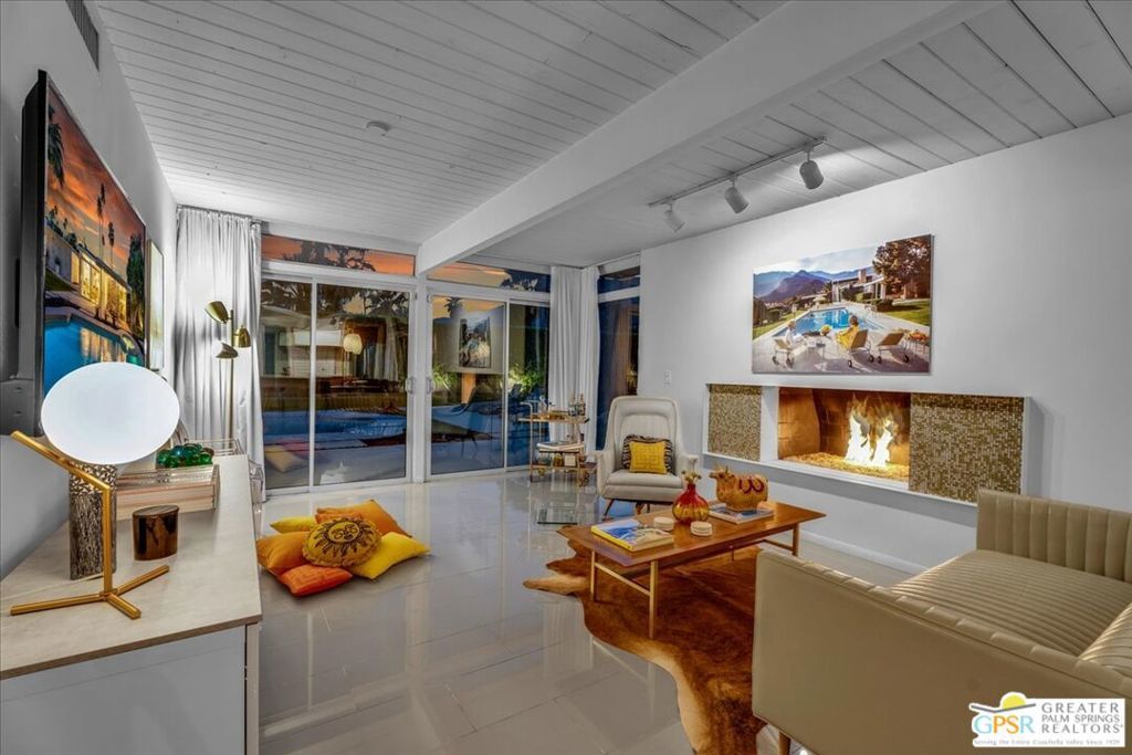 A "Palmer & Krisel" Original. Nestled in the historic and iconic Racquet Club Estates, this Mid-Century stunner designed by Palmer & Krisel and built by Alexander Construction Co. perfectly captures the innovative spirit of desert modernism. This neighborhood is a true reminder of the importance of design, famous for its five distinct rooflines and architectural pedigree highlighted by open floor plans, atriums, and breezeways. Inside, the signature post-and-beam construction is flooded with California sunshine via breathtaking walls of glass and strategically placed clerestory windows that frame the incredible San Jacinto mountain views. While retaining its 1959 soul, this residence has been meticulously updated for the 21st century to blend vintage charm with modern luxury. The unique, restored floating iron and tile fireplace serves as a stunning focal point for cool desert nights, complemented by glossy tile floors. The kitchen features Caesarstone counters, custom cabinetry, and sleek stainless steel appliances. Even the bathrooms have been thoughtfully coordinated with modern mosaic accent tiles that feel authentically Palm Springs. Practical updates like OWNED solar, an EV charger in the garage, updated plumbing, and dual-pane windows ensure this classic home functions with contemporary efficiency. Designed for the quintessential indoor-outdoor living experience, the spacious south-facing backyard is a private resort and the ultimate Palm Springs lifestyle. A gorgeous swimming pool invites you to float for hours, while a jetted spa helps you de-stress under the starry desert nights. The outdoor space is an entertainer's dream, featuring a custom sunshade canopy and a covered patio defined by a vibrant artist-curated mural. Whether you're sipping cocktails by the mural wall or rinsing off in the tiled outdoor shower, every inch is framed by beautiful landscaping and striking views. Located just blocks from the chic downtown area and all things cool Palm Springs has to offer. This home is a magnet for architecture fans seeking a sophisticated second home or a full-time residence. Welcome to Racquet Club Estates, stop dreaming and start living the life you've always imagined.