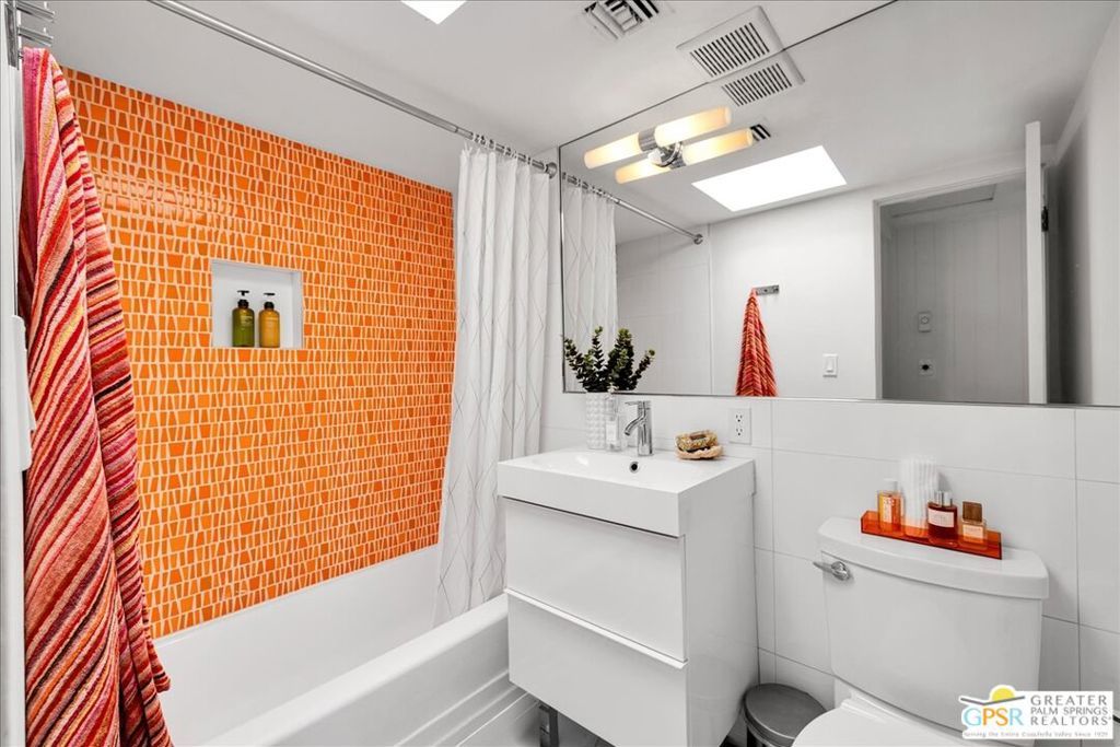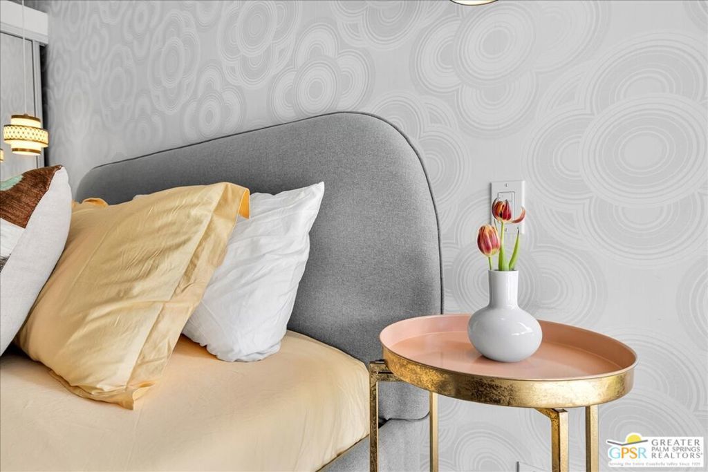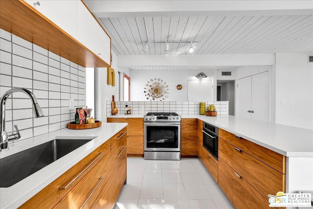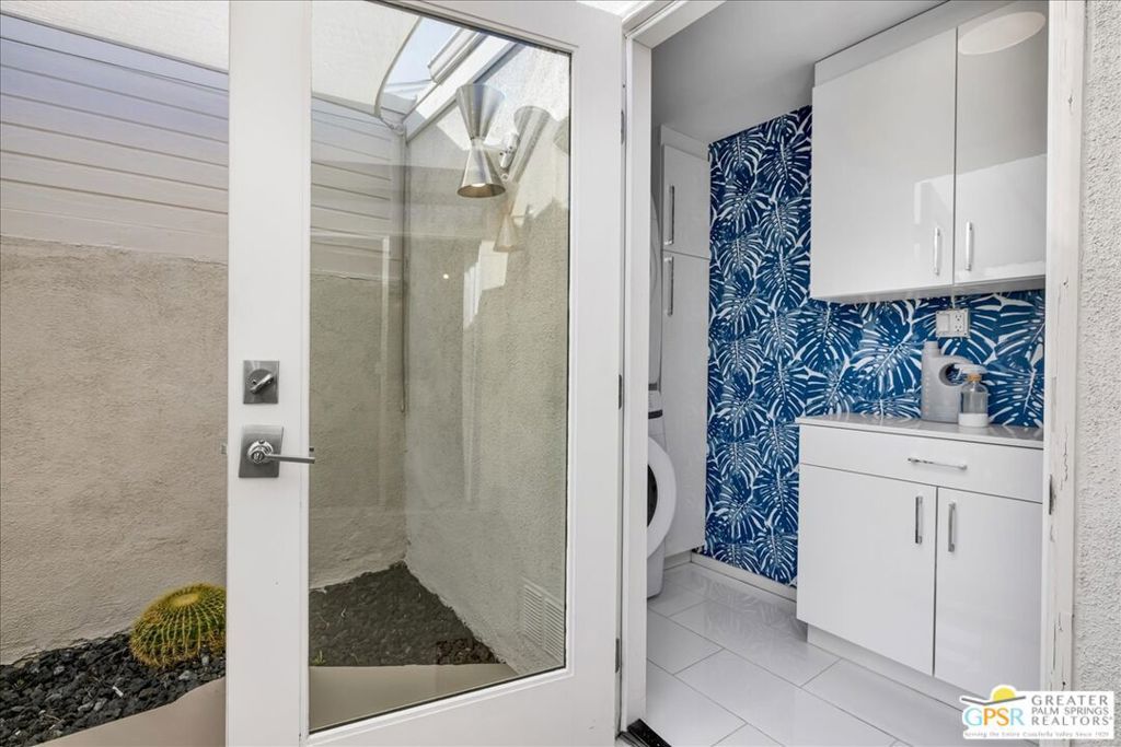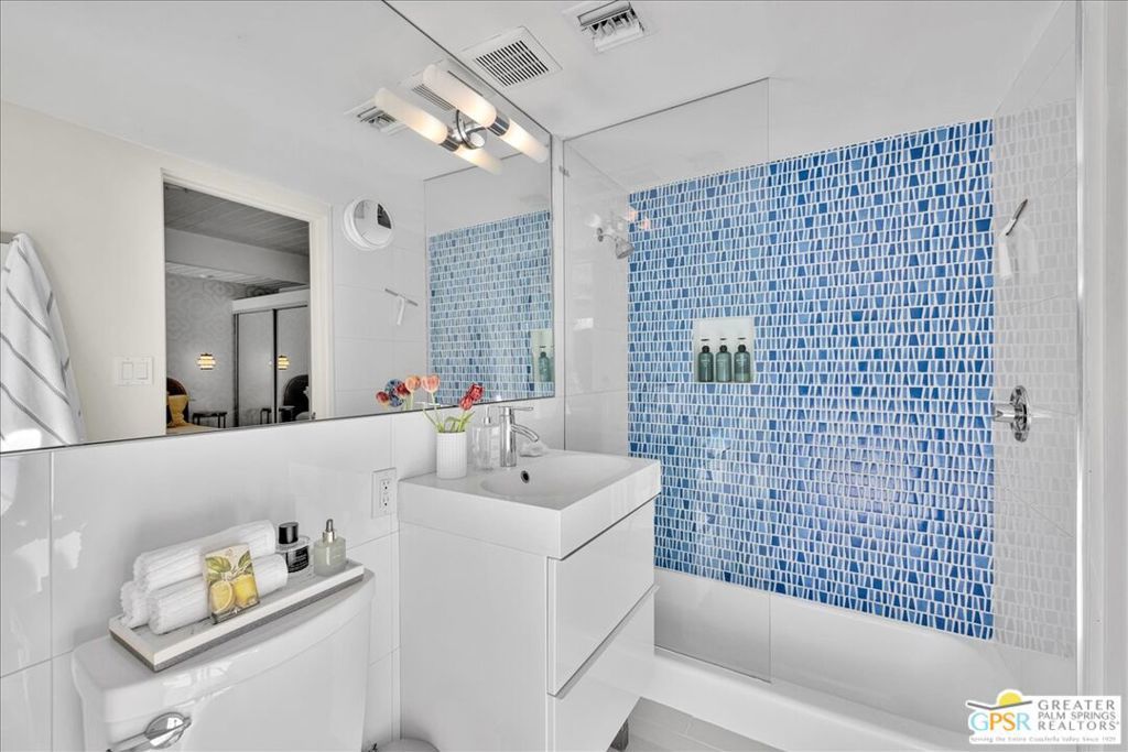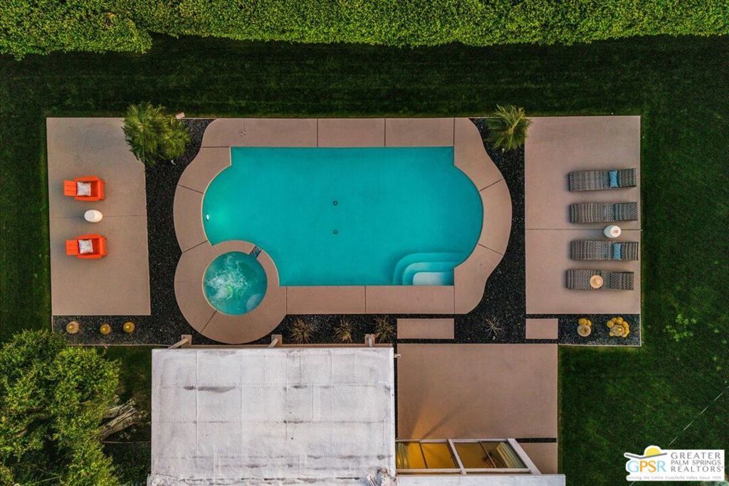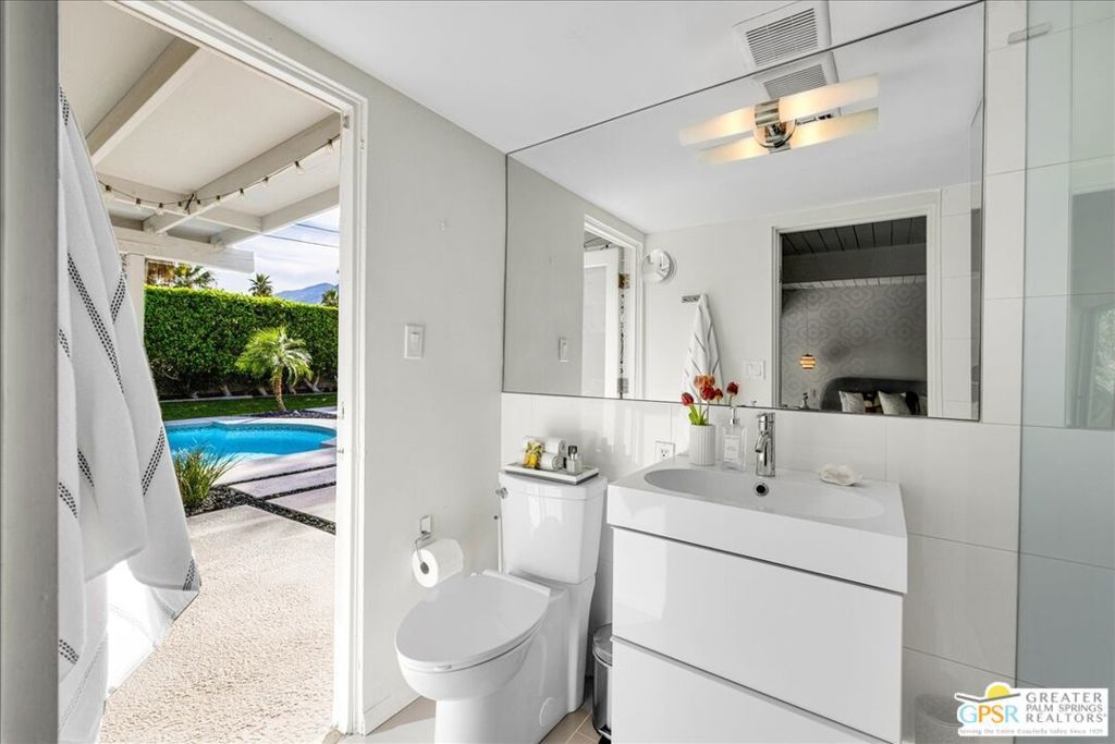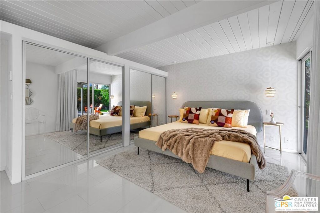 A "Palmer & Krisel" Original. Nestled in the historic and iconic Racquet Club Estates, this Mid-Century stunner designed by Palmer & Krisel and built by Alexander Construction Co. perfectly captures the innovative spirit of desert modernism. This neighborhood is a true reminder of the importance of design, famous for its five distinct rooflines and architectural pedigree highlighted by open floor plans, atriums, and breezeways. Inside, the signature post-and-beam construction is flooded with California sunshine via breathtaking walls of glass and strategically placed clerestory windows that frame the incredible San Jacinto mountain views. While retaining its 1959 soul, this residence has been meticulously updated for the 21st century to blend vintage charm with modern luxury. The unique, restored floating iron and tile fireplace serves as a stunning focal point for cool desert nights, complemented by glossy tile floors. The kitchen features Caesarstone counters, custom cabinetry, and sleek stainless steel appliances. Even the bathrooms have been thoughtfully coordinated with modern mosaic accent tiles that feel authentically Palm Springs. Practical updates like OWNED solar, an EV charger in the garage, updated plumbing, and dual-pane windows ensure this classic home functions with contemporary efficiency. Designed for the quintessential indoor-outdoor living experience, the spacious south-facing backyard is a private resort and the ultimate Palm Springs lifestyle. A gorgeous swimming pool invites you to float for hours, while a jetted spa helps you de-stress under the starry desert nights. The outdoor space is an entertainer's dream, featuring a custom sunshade canopy and a covered patio defined by a vibrant artist-curated mural. Whether you're sipping cocktails by the mural wall or rinsing off in the tiled outdoor shower, every inch is framed by beautiful landscaping and striking views. Located just blocks from the chic downtown area and all things cool Palm Springs has to offer. This home is a magnet for architecture fans seeking a sophisticated second home or a full-time residence. Welcome to Racquet Club Estates, stop dreaming and start living the life you've always imagined.