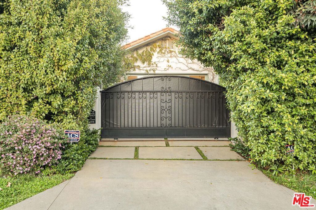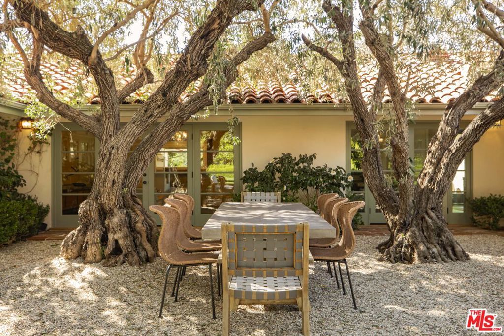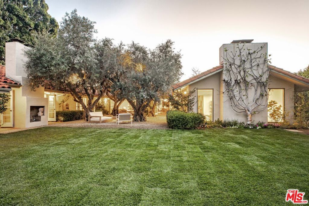 Set on a rare half-acre lot just moments from the Riviera Country Club, 1296 Capri Drive is an extensively renovated single-story estate that seamlessly blends European character with the ease of California indoor-outdoor living. Gated and private, the property opens to a serene front courtyard anchored by an outdoor fireplace and lush, mature plantings that diverge into various walkpaths. An antique bronze and glass front door welcomes you into expansive interiors where every room connects directly to the surrounding gardens. Old-world craftsmanship is evident throughout, with 15th-century Italian doors sourced from Milan, a carved Louis XV marble fireplace, and two antique French stone fountains that define both the courtyard and the backyard with timeless elegance. The thoughtfully designed floor plan is organized into two distinct wings. The private wing is home to the primary suite, which opens directly to the gardens and features dual bathrooms complete with a smart toilet, dry sauna, and two walk-in closets. Three additional en-suite bedrooms complete this side of the home, offering comfort and flexibility for families and guests alike. The entertaining wing centers around a den with a built-in bar, surround sound, built-in book shelf display, and a climate-controlled wine closet. The main living room features a carved marble fireplace beneath vaulted, beamed ceilings, with a full wall of French doors that open to the gardens and flood the space with natural light throughout the day. The Cooper Pacific chef's kitchen is truly in a class of its own. Italian feather walnut travertine counters anchor the space, while the professional appliance suite includes a 64-inch Wolf range with French top and grill, two Wolf ovens (one steam), Le Cornue rotisserie, Sub-Zero refrigeration, dual Miele dishwashers, Wolf refrigerator drawers and ice maker, Irinox flash freezer and sous vide, and a built-in Natufia hydroponic grower. A walk-in pantry and separate china closet provide generous storage without compromising the design. The backyard is a true standout and one of the property's most compelling features. A sprawling, grassy flat lawn offers exceptional space for children to play, pets to roam, and entertainment on any scale. A grove of 100-year-old olive trees creates a natural canopy over a gravel outdoor living area with overhead lighting, making it an ideal setting for casual family dinners to larger gatherings. The grounds were designed by Garett Carlson of Landarc and Stephen Block of Inner Gardens, with organically treated soil and plantings throughout. Raised vegetable garden beds and a working orchard of lemon, orange, peach, plum, fig, mulberry, yuzu, Australian finger lime, and avocado trees make the property as functional as it is beautiful. A rose-covered gazebo adds charm and a dedicated area is well suited for a dog run. Additional highlights include a 2,500-bottle refrigerated wine cellar, built-in outdoor speakers, two new HVAC systems with HEPA filtration, all-new attic ducting and insulation, three water heaters (two tankless), and full security cameras throughout the property. A rare opportunity to own a truly special family home in one of the Pacific Palisades most sought-after pockets.