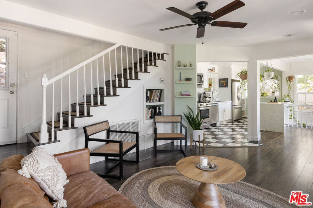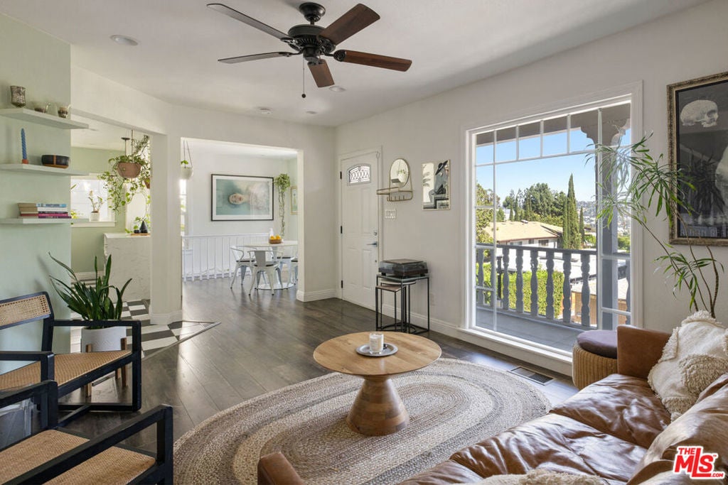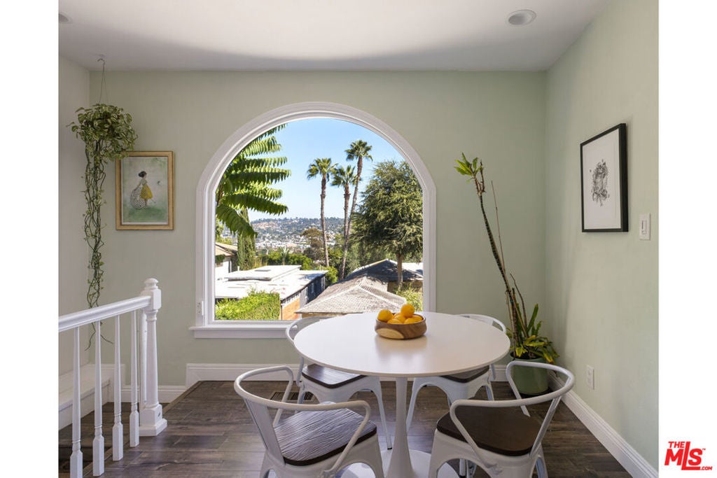 Silver Lake living feels exquisite in this 1930 Spanish, reimagined with modern sensibility and enjoying sweeping hillside views. The tri-level layout balances original charm and smart updates, featuring bright, airy rooms with effortless flow. In the living room, a large picture window frames the hills in golden light; the dining room centers on a grand arched window, a perfect backdrop for gatherings. The open kitchen is finished with waterfall quartz counters, stainless appliances, counter seating, and abundant storage. Three bedrooms and two updated baths provide versatility, including a lower-level suite with private entrance, full bath, and laundry, ideal for guests or creative work.Lush outdoor space expands across multiple terraces: a deck above the garage for sunset cocktails, a rustic stone patio for relaxing, and a serene garden retreat.From this street-to-street lot, enjoy proximity to the Reservoir, Meadow, Silver Lake Wine, Whole Foods, and local favorites along Glendale Boulevard.
