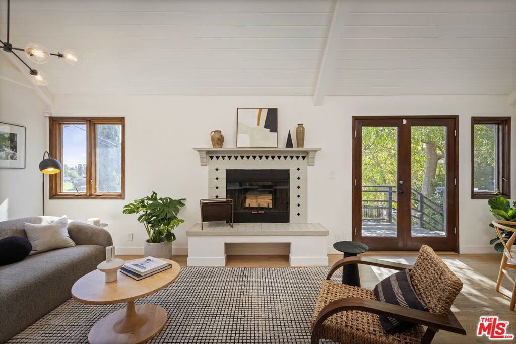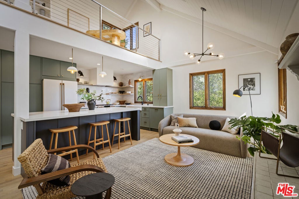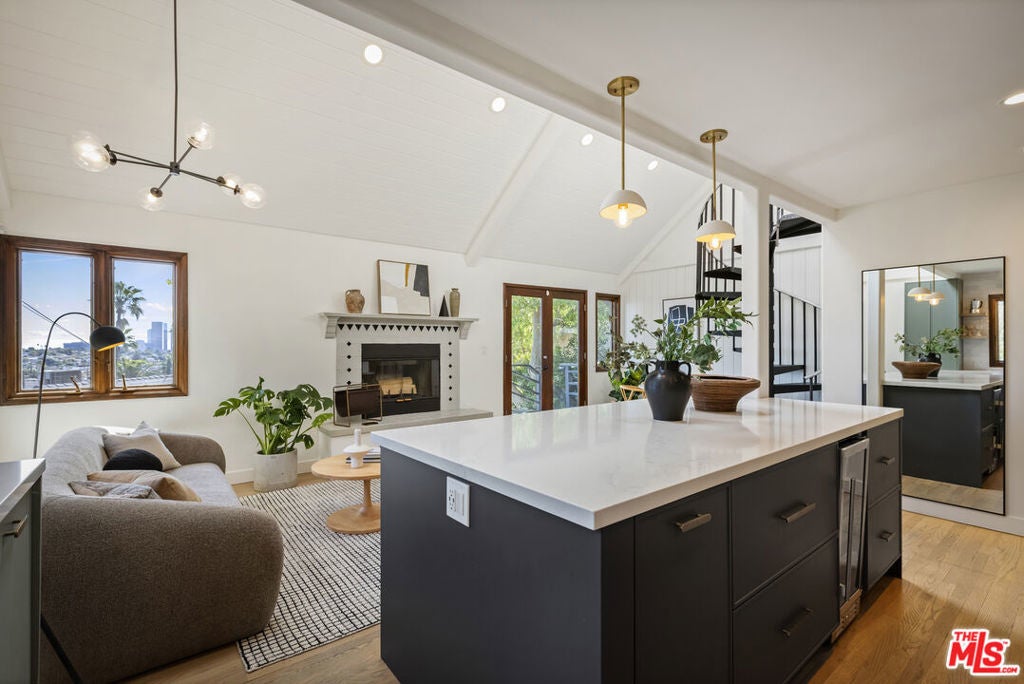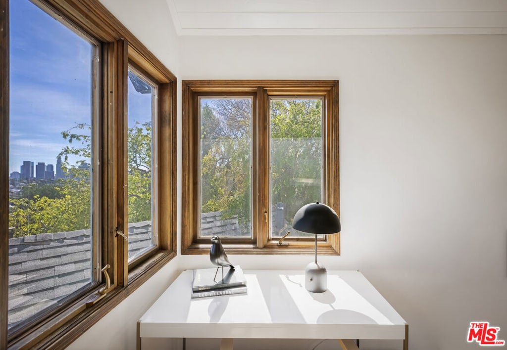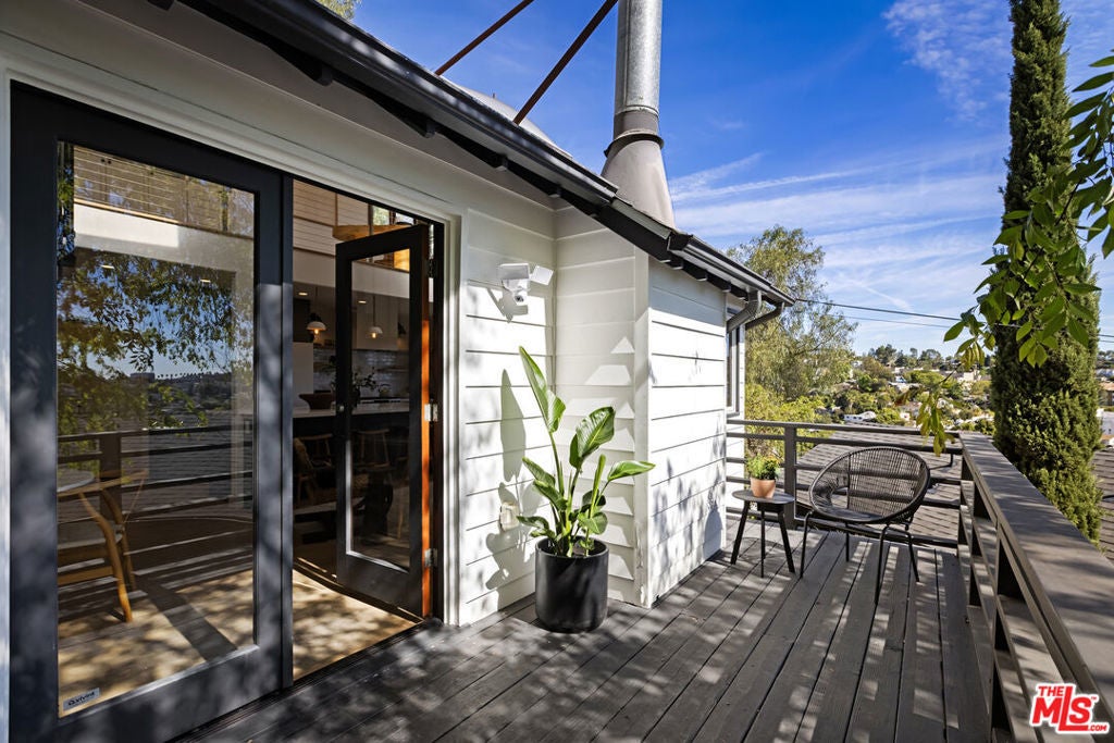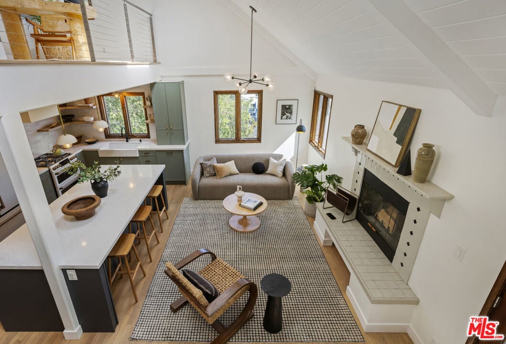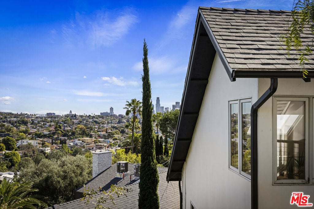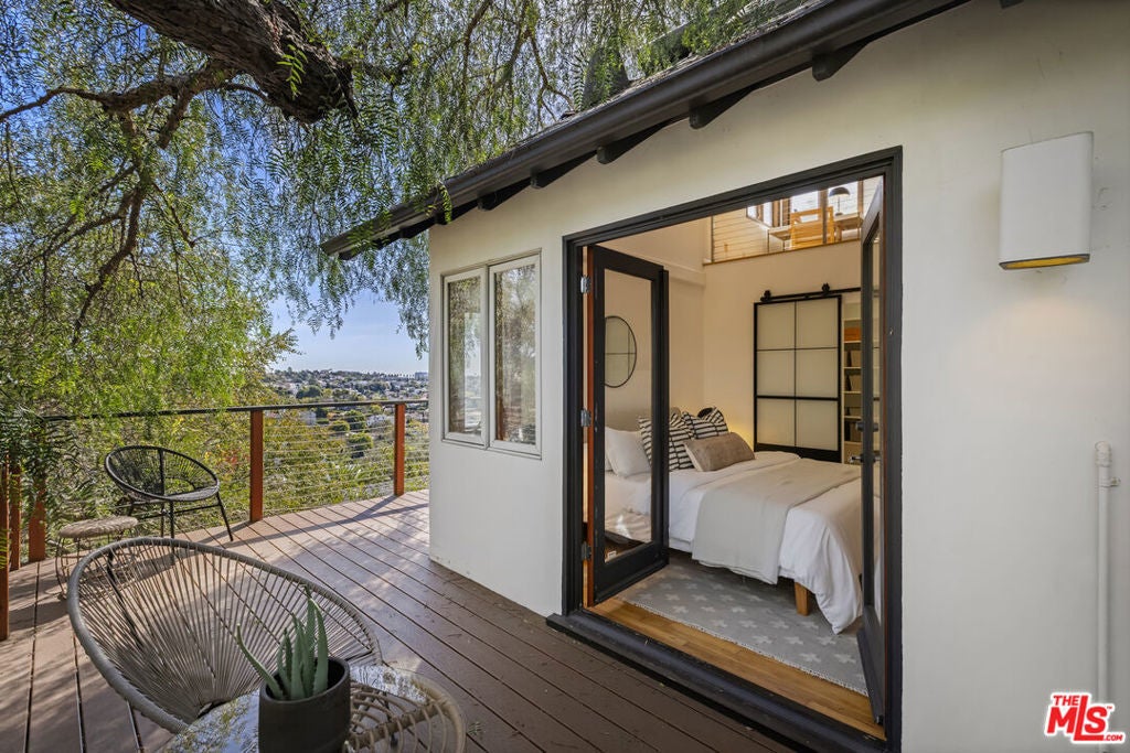 Thoughtfully positioned on a quiet Cul-De-Sac in the Silver Lake Highlands where Effie St. culminates to a stair street sits this exquisite architectural treehouse with 180-degree views. A private oasis in the clouds, gated discreetly for privacy; the front balcony reached from a semi-private driveway reveals a wide-open picture over Elysian Park/Dodger Stadium, spanning beyond Little Tokyo and Downtown LA. Dual front doors of glass open to the bright front room with fireplace. Skylights, a multitude of Double-paned windows and the glow of glass bricks saturate every bit of space with sunlight and shadows. Spiral staircase leads to the loft with built-in book storage which proves the perfect nook for office or reading. The chic Chef's kitchen features an island with built in beverage/wine cooler and entertainers barstool seating. Designer appliances including Cafe' refrigerator and range and a Bosch dishwasher. Ample cabinets and shelving for appliances give convenience and maximum use of space. On the main level are two generous bedrooms in size, second bedroom with a cedar closet and accent designer wall. From the first level, the private garden with soaring walls of creeping fig, separate entrance, built in Fisher & Paykal grill, gas fire feature and built in seating create the atmosphere for summer time al fresco dining. A stairwell with ascending windows to the primary suite with a private balcony among the trees, oversized luxury closet, primary En suite bath and an airy and bright loft of its own creating a tranquil retreat. The wrap around deck, also overlooking City Hall and DTLA is encompassed by mature pepper trees.Other notables, a tankless water heater, large 2 car garage with integrated shelving for storage and a wide drive for optional parking. Proximity to Sunset Blvd with it's eateries, boutiques and coffee shops. Retreat above the noise and experience Silver Lake and Echo Park with its hidden history feel. Silver Lake continues to be proven one of the most exciting and creative neighborhoods, unmatched in Los Angeles.