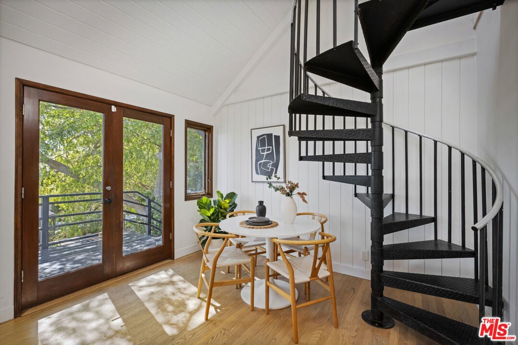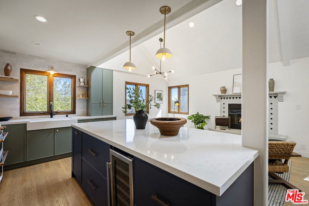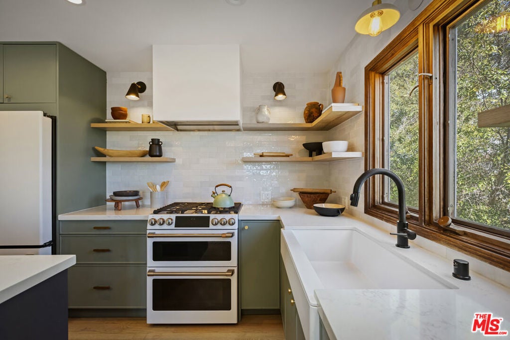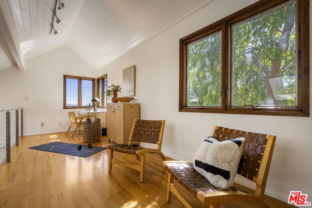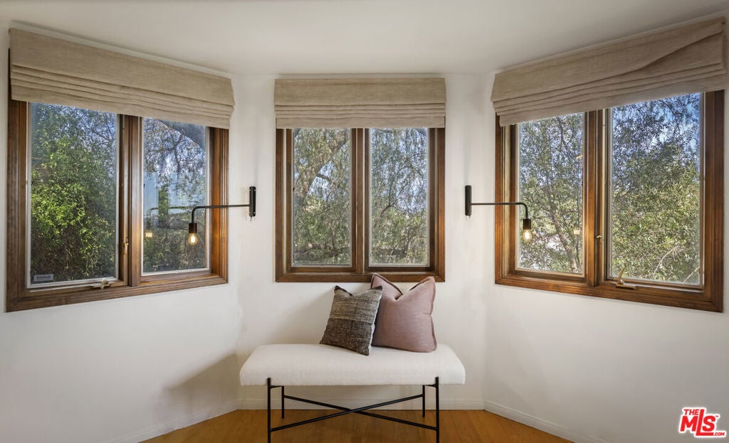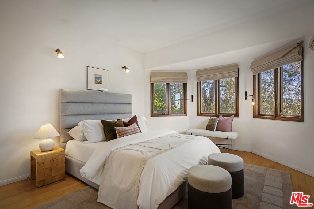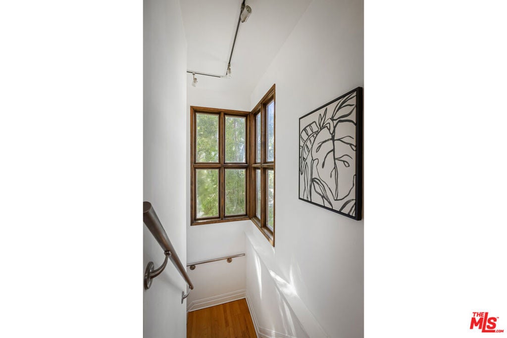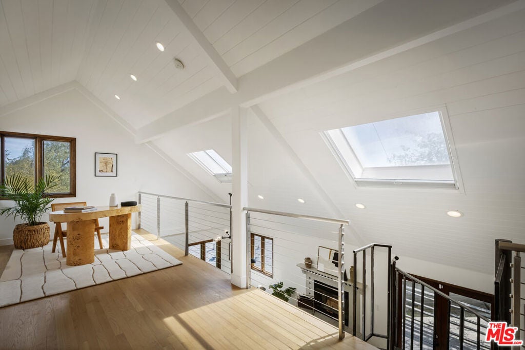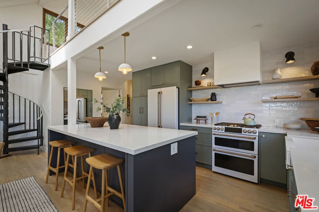 Thoughtfully positioned on a quiet Cul-De-Sac in the Silver Lake Highlands where Effie St. culminates to a stair street sits this exquisite architectural treehouse with 180-degree views. A private oasis in the clouds, gated discreetly for privacy; the front balcony reached from a semi-private driveway reveals a wide-open picture over Elysian Park/Dodger Stadium, spanning beyond Little Tokyo and Downtown LA. Dual front doors of glass open to the bright front room with fireplace. Skylights, a multitude of Double-paned windows and the glow of glass bricks saturate every bit of space with sunlight and shadows. Spiral staircase leads to the loft with built-in book storage which proves the perfect nook for office or reading. The chic Chef's kitchen features an island with built in beverage/wine cooler and entertainers barstool seating. Designer appliances including Cafe' refrigerator and range and a Bosch dishwasher. Ample cabinets and shelving for appliances give convenience and maximum use of space. On the main level are two generous bedrooms in size, second bedroom with a cedar closet and accent designer wall. From the first level, the private garden with soaring walls of creeping fig, separate entrance, built in Fisher & Paykal grill, gas fire feature and built in seating create the atmosphere for summer time al fresco dining. A stairwell with ascending windows to the primary suite with a private balcony among the trees, oversized luxury closet, primary En suite bath and an airy and bright loft of its own creating a tranquil retreat. The wrap around deck, also overlooking City Hall and DTLA is encompassed by mature pepper trees.Other notables, a tankless water heater, large 2 car garage with integrated shelving for storage and a wide drive for optional parking. Proximity to Sunset Blvd with it's eateries, boutiques and coffee shops. Retreat above the noise and experience Silver Lake and Echo Park with its hidden history feel. Silver Lake continues to be proven one of the most exciting and creative neighborhoods, unmatched in Los Angeles.