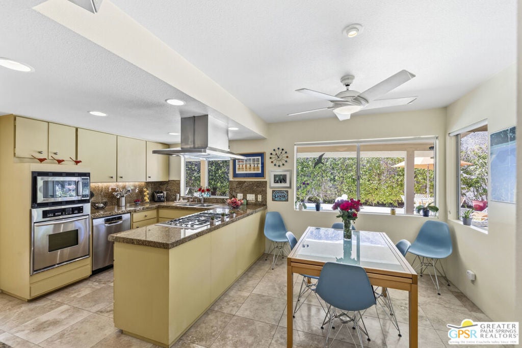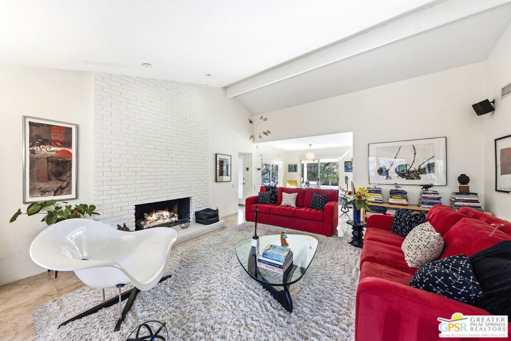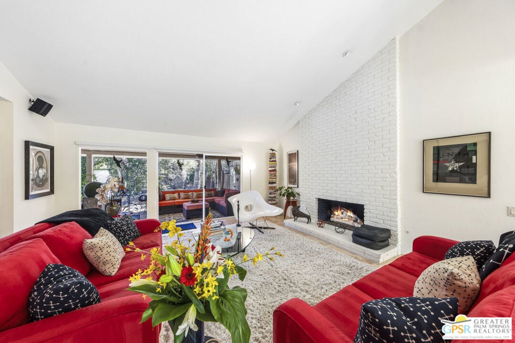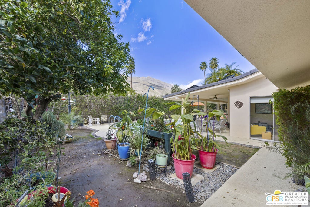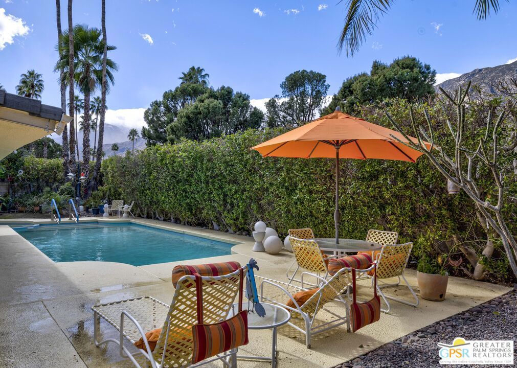 Wonderful, bright 3 bedroom, 2 bath with many mid-century features and lots of charm and character. This home is located in the very desirable neighborhood of Indian Canyons in South Palm Springs. The extra large lot is surrounded by block wall and shrubbery, creating a private utopia. Once in the colorful green pedestrian gate, you enter into the enclosed front yard, which is a perfect combination of desert landscaping and grass, boasting layers of rock, fauna and trees. To the left of the front entry door note the slider that leads from the living room area onto to a covered front patio, which currently serves as an outdoor living room. Next, step through the full view, solid glass front door into the entry area and hallway. The living room features many mid-century vibes, including a cathedral, beamed ceiling, and a partial slump stone brick wall surrounding the fireplace, which sits almost at floor level and walls of glass. Off the living room and towards the back of the house, is a bonus sitting area. The gourmet kitchen has stainless appliances and granite countertops, and a dining area. There is a pantry cabinet and utility closet in the the kitchen area as well. The kitchen sink looks out onto the backyard, pool area and majestic mountain views. Just off the kitchen is an office nook with a freestanding desk and cabinets. The Primary suite has a spacious custom built closet with direct access to the pool area. One of the 2 guest rooms has a custom built walk-in closet with direct access to the front yard and garden. The other guest room, also with a custom built closet, is currently being used as a den/office. Both baths feature custom glass, walk-in tiled shower surrounds and granite counters, and Toto toilets. Bedroom floors are carpeted, other areas are tiled with splendid, timeless Travertine. The pool area embraces all the Palm Springs living is supposed to be. A large, saltwater pool with steps down into the water, and a spa. Just like a resort, privacy abounds. There is also a large, covered patio. And gorgeous views! The Solar system is owned. All areas, inside and out, feature upgraded lighting.