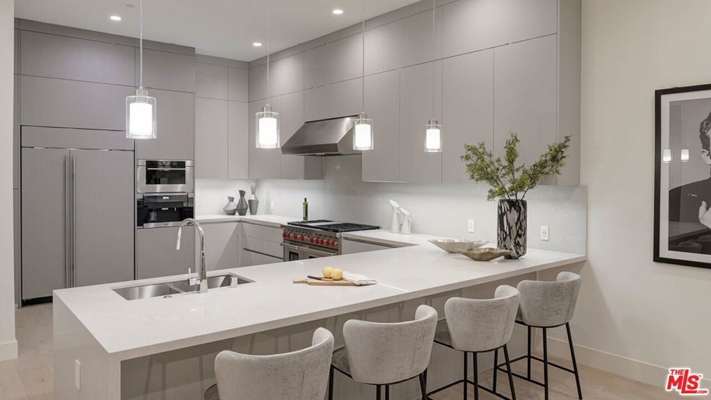 Discover Penthouse 503 at 425 Palm in Prime Beverly Hills. Crowning the building, this exceptional 2-bedroom, 2.5-bath residence spans 2,576 SF of interior living space plus a 579 SF private veranda and an expansive 603 SF fully customizable rooftop deck with unobstructed views of the Los Angeles skyline and the iconic Hollywood Hills. Semi-private elevator access opens directly into your private foyer, setting the tone for sophisticated, elevated living. The open-concept layout flows seamlessly from the gourmet kitchen to the dining and living areas, designed for both everyday living and effortless entertaining. Floor-to-ceiling windows flood the space with natural light. Impeccable interior finishes throughout include Wolf and Sub-Zero appliances, a Miele built-in coffee system, Caesarstone countertops in the kitchen and bathrooms, Italian Gessi fixtures, and custom imported Linea Quattro European cabinetry. Additional features include a dedicated laundry room and three side-by-side subterranean parking spaces. 425 Palm offers a boutique residential experience with an on-site fitness center featuring premium equipment, a rooftop terrace with an outdoor gourmet kitchen and sunken spa, dedicated lobby with 24-hour on-site attendants, and controlled access. Ideally located in the heart of Beverly Hills, moments from world-class dining, shopping, and entertainment.