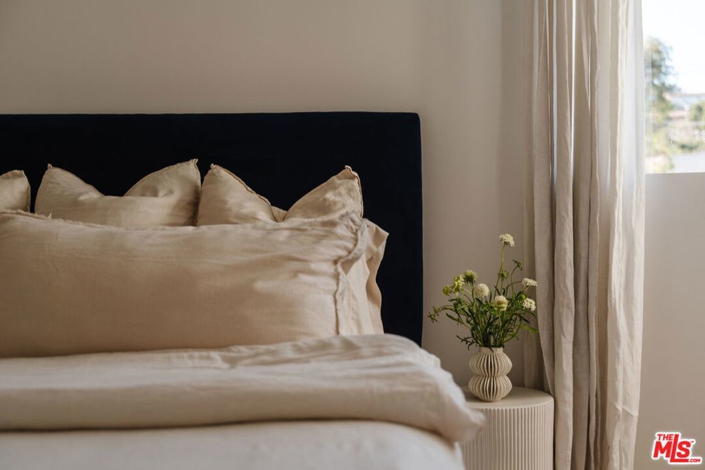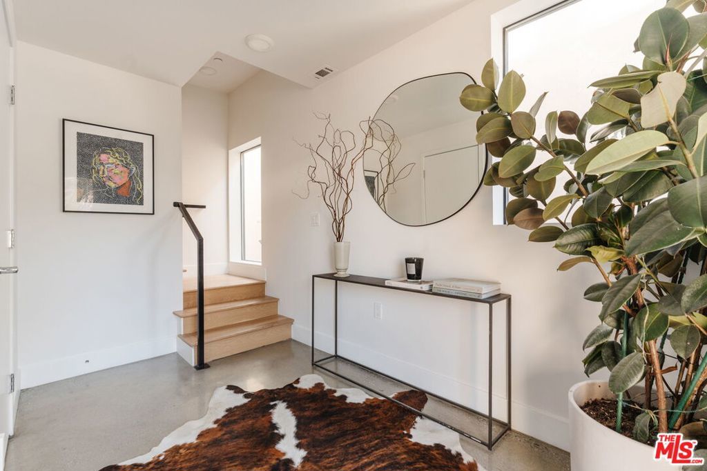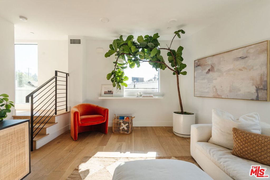 Built in 2019, where Echo Park and Silver Lake converge, this contemporary 2-bedroom, 2.5-bathroom small lot single-family home spans 1,560 square feet across three levels and is topped with a private rooftop deck showcasing city views. With clean architectural lines, abundant natural light, and leased solar for added efficiency, the residence offers easy living in one of LA's most dynamic neighborhoods. A private and gated front entry leads to the ground-level foyer, complete with a powder room and direct access to the attached two-car garage, outfitted with MyQ smart garage opener and offering additional storage. Upstairs, the main living level is bright and airy, highlighted by expansive windows and warm hardwood flooring throughout. The living room transitions seamlessly into the dining area, which opens to a wraparound balcony framed by lush greenery, creating an easy indoor-outdoor flow. The kitchen is thoughtfully designed with stainless steel appliances, quartz countertops, and ample cabinetry, balancing style and functionality. A conveniently located laundry closet sits just off the kitchen on this level. Above the living spaces, on the third level, are two private bedroom suites. The primary suite includes ample closet space and an ensuite bathroom with dual sinks, a glass-enclosed shower, a separate soaking tub, and contemporary finishes. The second bedroom is well-sized and versatile, perfect for guests, a home office, or a creative space with its own hallway bath. At the top level, a private rooftop deck captures sweeping hillside views and offers a hedged open-air setting ideal for relaxing or entertaining beneath the California sky, complete with a dedicated BBQ hookup. Thoughtful upgrades, including a tankless water heater, Nest thermostat and ADT Home Security System, enhance the home's overall comfort and efficiency. Located just moments from neighborhood favorites like Botanica, Canyon Coffee, Lady Byrd Cafe, and L & E Oyster Bar, and close to the trails of Elysian Park and the shops and restaurants along Sunset, this Echo Park home delivers modern comfort with unbeatable access to the best of the Eastside.
