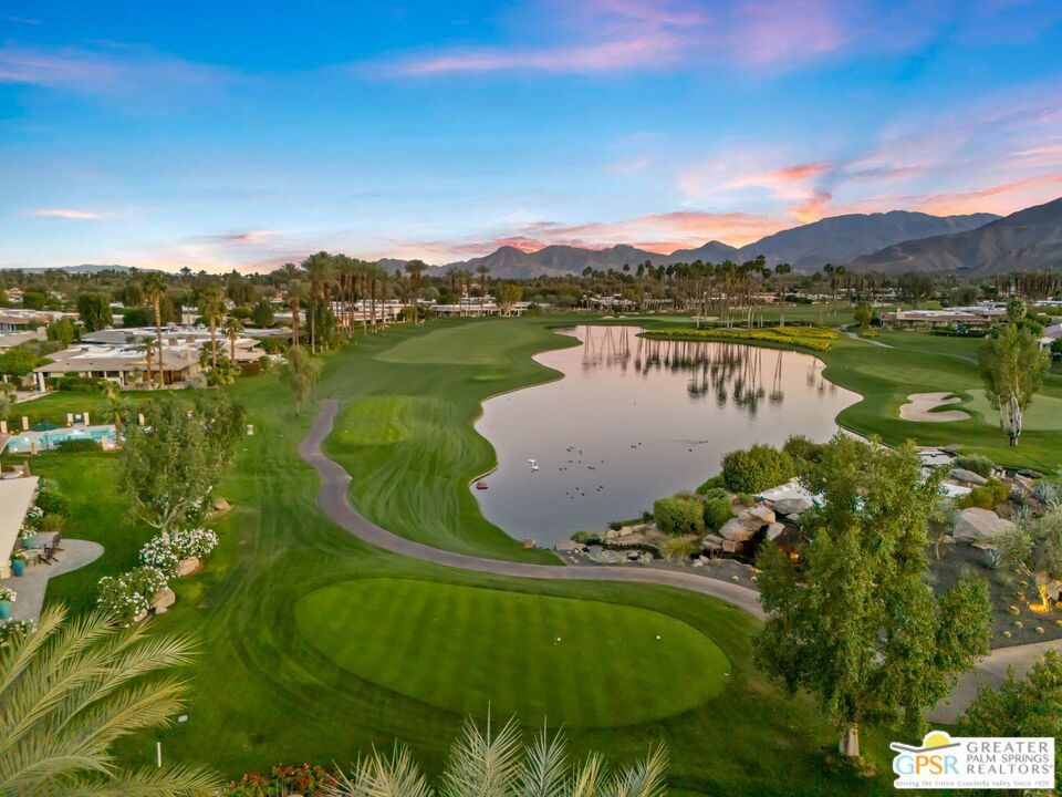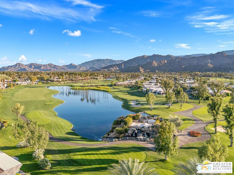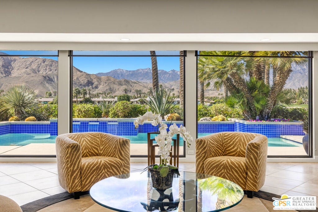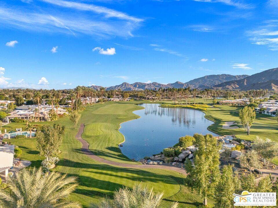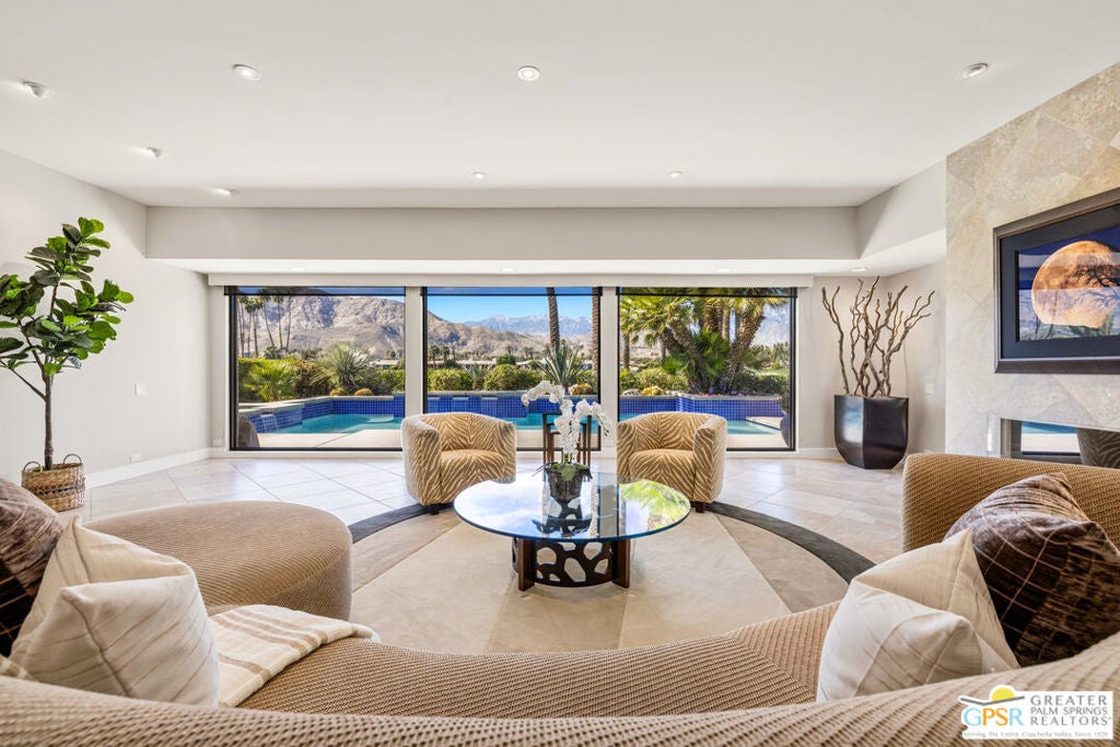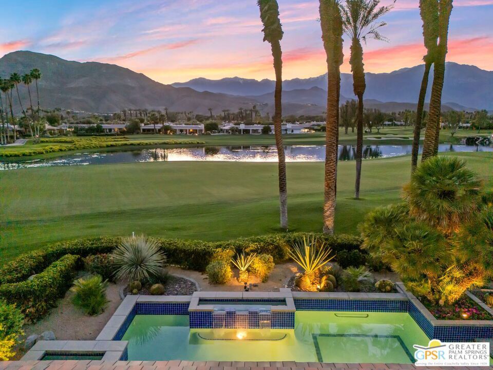 Uninterrupted, front-row views across multiple fairways, shimmering lake, and the Santa Rosa and San Jacinto mountains define this expanded and highly customized Oakmont 4 residence at The Club at Morningside. Formerly owned by actor and singer Buddy Rogers, the 3 bedroom + office, 3.5 bath home blends Hollywood heritage with the refined lifestyle of one of Rancho Mirage's most respected private clubs. Positioned at the end of a quiet cul-de-sac, the setting delivers privacy, scale, and a memorable sense of arrival. A formal gallery-style entry opens to a voluminous living space where floor-to-ceiling windows immediately capture the sweeping landscape beyond. The south-west facing formal living and dining area is anchored by a striking fireplace and dual glass doors that extend the living experience to layered outdoor spaces designed for both entertaining and quiet desert evenings. The adjacent kitchen, casual dining area, and family room continue the indoor-outdoor connection through a series of French doors opening to the patio. Skylights, a generous island, and a built-in appliance suite enhance both function and natural light. A dedicated office enjoys views, providing an inspiring setting for work or creative pursuits. The Primary Suite offers a retreat-like atmosphere with panoramic views and direct access to the backyard pool and spa. The ensuite bath features dual sinks, soaking tub, walk-in shower, and two cedar-lined closets. Junior Ensuite Two is thoughtfully positioned for privacy, while Junior Ensuite Three includes its own retreat, private patio, walk-in closet, and ensuite bath. A powder bath, inside laundry, and direct access to a two-car plus golf-cart garage complete the interior. Recent improvements include fresh interior paint and newly installed HVAC systems. Ownership at Morningside offers access to an optional membership experience within a private equity club known for its lush landscaping, vibrant seasonal color, and exceptional location in the heart of Rancho Mirage. A rare opportunity to enjoy commanding views, generous scale, and timeless club living in one of the desert's most beautiful communities.