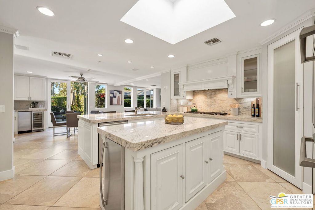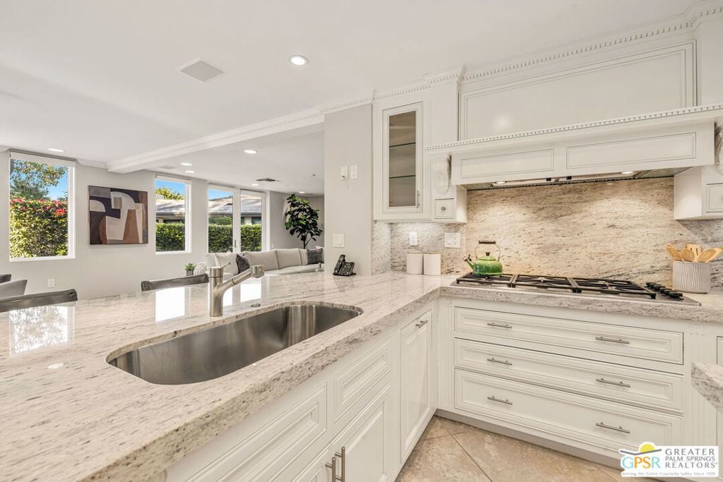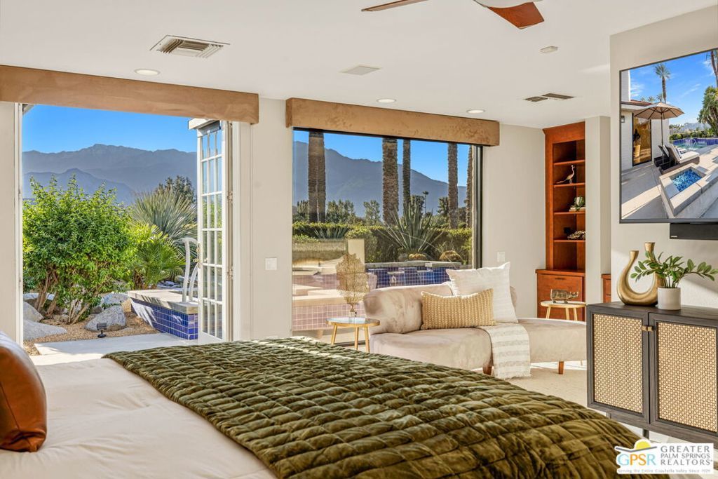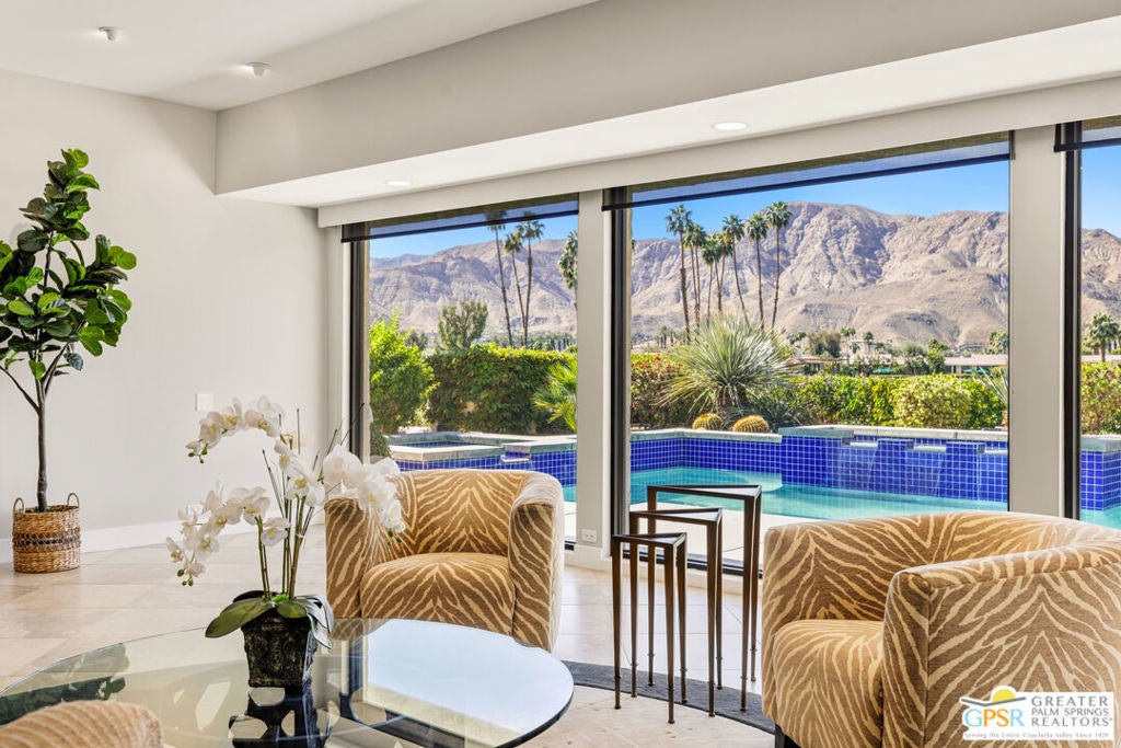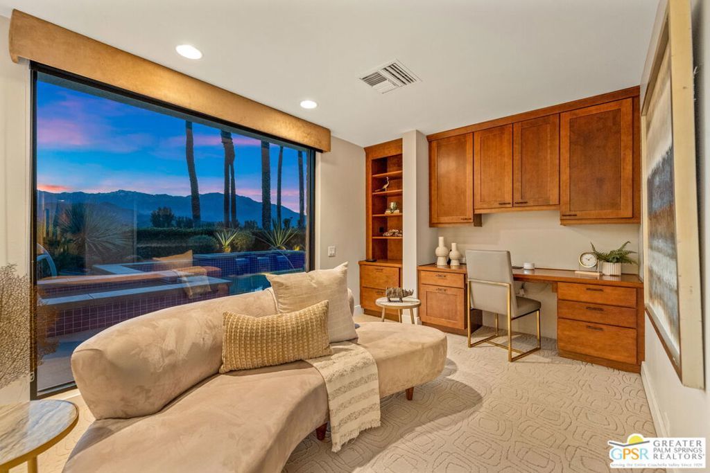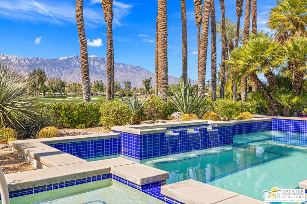 Uninterrupted, front-row views across multiple fairways, shimmering lake, and the Santa Rosa and San Jacinto mountains define this expanded and highly customized Oakmont 4 residence at The Club at Morningside. Formerly owned by actor and singer Buddy Rogers, the 3 bedroom + office, 3.5 bath home blends Hollywood heritage with the refined lifestyle of one of Rancho Mirage's most respected private clubs. Positioned at the end of a quiet cul-de-sac, the setting delivers privacy, scale, and a memorable sense of arrival. A formal gallery-style entry opens to a voluminous living space where floor-to-ceiling windows immediately capture the sweeping landscape beyond. The south-west facing formal living and dining area is anchored by a striking fireplace and dual glass doors that extend the living experience to layered outdoor spaces designed for both entertaining and quiet desert evenings. The adjacent kitchen, casual dining area, and family room continue the indoor-outdoor connection through a series of French doors opening to the patio. Skylights, a generous island, and a built-in appliance suite enhance both function and natural light. A dedicated office enjoys views, providing an inspiring setting for work or creative pursuits. The Primary Suite offers a retreat-like atmosphere with panoramic views and direct access to the backyard pool and spa. The ensuite bath features dual sinks, soaking tub, walk-in shower, and two cedar-lined closets. Junior Ensuite Two is thoughtfully positioned for privacy, while Junior Ensuite Three includes its own retreat, private patio, walk-in closet, and ensuite bath. A powder bath, inside laundry, and direct access to a two-car plus golf-cart garage complete the interior. Recent improvements include fresh interior paint and newly installed HVAC systems. Ownership at Morningside offers access to an optional membership experience within a private equity club known for its lush landscaping, vibrant seasonal color, and exceptional location in the heart of Rancho Mirage. A rare opportunity to enjoy commanding views, generous scale, and timeless club living in one of the desert's most beautiful communities.