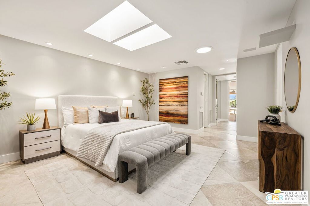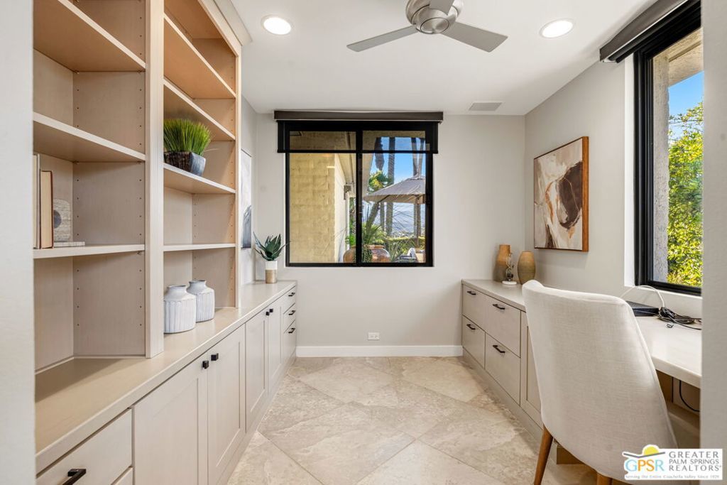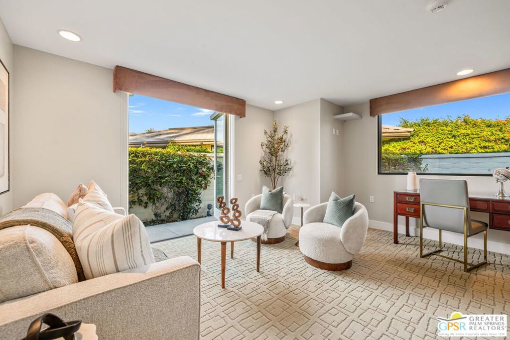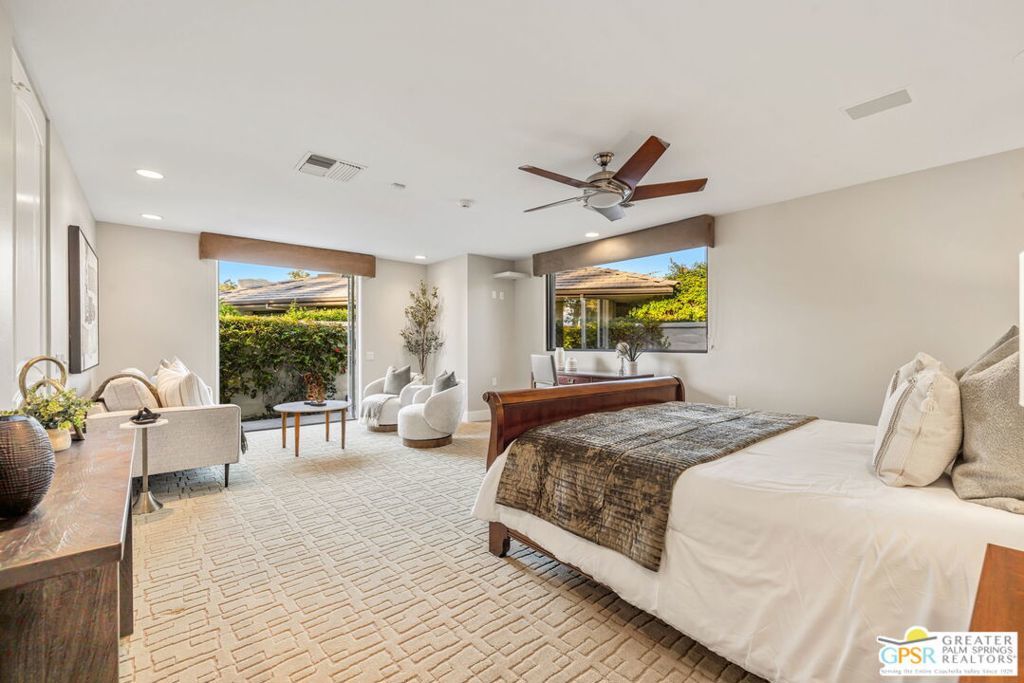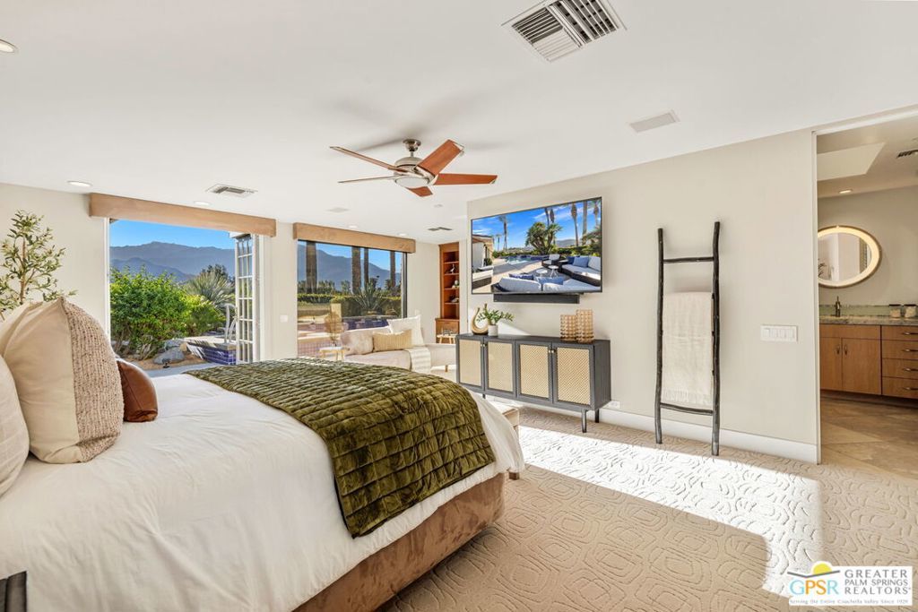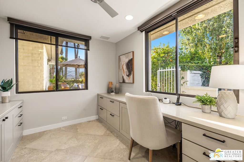 Uninterrupted, front-row views across multiple fairways, shimmering lake, and the Santa Rosa and San Jacinto mountains define this expanded and highly customized Oakmont 4 residence at The Club at Morningside. Formerly owned by actor and singer Buddy Rogers, the 3 bedroom + office, 3.5 bath home blends Hollywood heritage with the refined lifestyle of one of Rancho Mirage's most respected private clubs. Positioned at the end of a quiet cul-de-sac, the setting delivers privacy, scale, and a memorable sense of arrival. A formal gallery-style entry opens to a voluminous living space where floor-to-ceiling windows immediately capture the sweeping landscape beyond. The south-west facing formal living and dining area is anchored by a striking fireplace and dual glass doors that extend the living experience to layered outdoor spaces designed for both entertaining and quiet desert evenings. The adjacent kitchen, casual dining area, and family room continue the indoor-outdoor connection through a series of French doors opening to the patio. Skylights, a generous island, and a built-in appliance suite enhance both function and natural light. A dedicated office enjoys views, providing an inspiring setting for work or creative pursuits. The Primary Suite offers a retreat-like atmosphere with panoramic views and direct access to the backyard pool and spa. The ensuite bath features dual sinks, soaking tub, walk-in shower, and two cedar-lined closets. Junior Ensuite Two is thoughtfully positioned for privacy, while Junior Ensuite Three includes its own retreat, private patio, walk-in closet, and ensuite bath. A powder bath, inside laundry, and direct access to a two-car plus golf-cart garage complete the interior. Recent improvements include fresh interior paint and newly installed HVAC systems. Ownership at Morningside offers access to an optional membership experience within a private equity club known for its lush landscaping, vibrant seasonal color, and exceptional location in the heart of Rancho Mirage. A rare opportunity to enjoy commanding views, generous scale, and timeless club living in one of the desert's most beautiful communities.