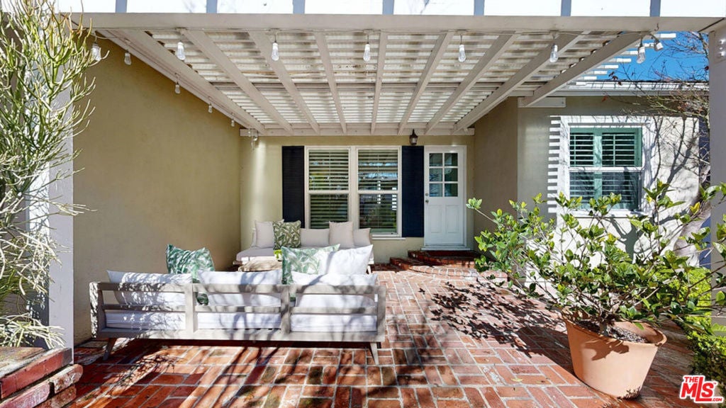 Set behind a picturesque white picket fence in the coveted Brentwood Glen, this refined traditional residence seamlessly blends classic character with modern comforts. Sunlight pours through oversized windows, highlighting beautiful hardwood floors and refined details like wainscoting, crown moldings, and custom shutters throughout. The welcoming entry opens to a gracious living room with built-in bookshelves and a fireplace, flowing seamlessly into a formal dining room ideal for entertaining. The galley kitchen features butcher block countertops, custom white cabinetry, and high-end appliances, while the private primary suite is set in its own wing with French doors opening directly to the backyard. Both bathrooms have been tastefully remodeled with elegant custom tilework. Outdoors, the living room extends to a covered brick patio and a lush, flat grassy yard perfect for indoor-outdoor living. A finished detached garage with high ceilings and French doors offers exceptional flexibility as a gym, office, playroom, or den. Additional highlights include a laundry room, central A/C, abundant storage, and eco-friendly upgrades such as fully paid solar, a whole-house water filtration system, an electric vehicle charger, and a newer sewer main line.