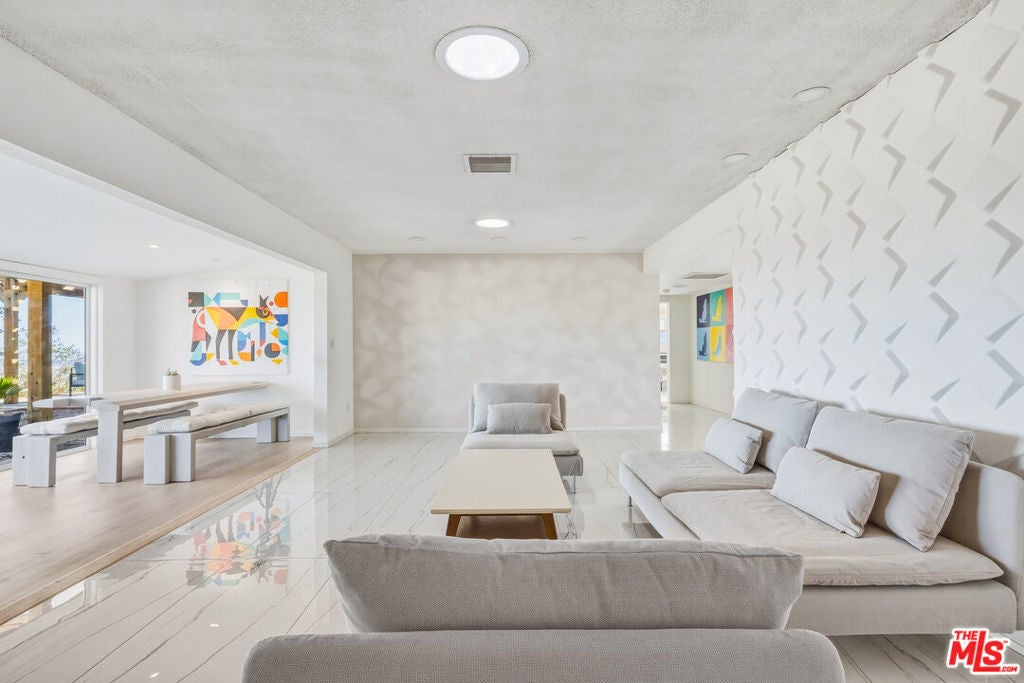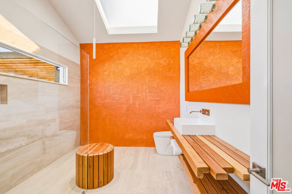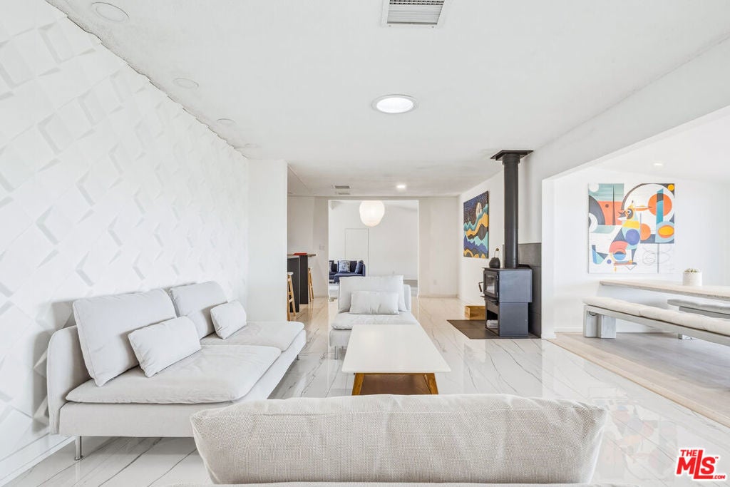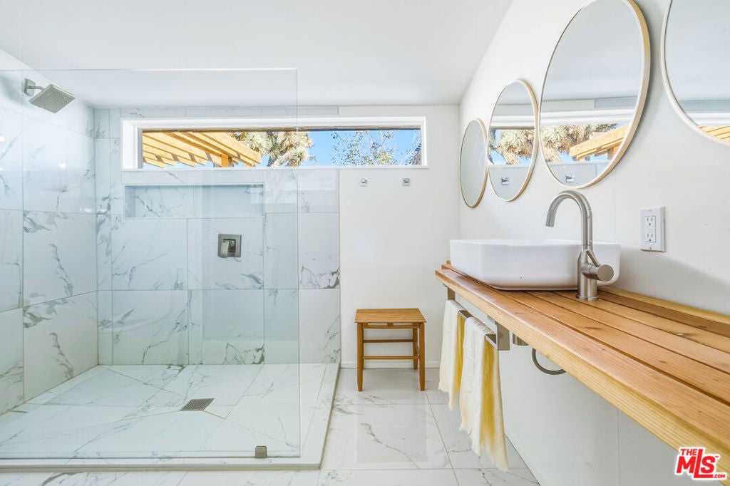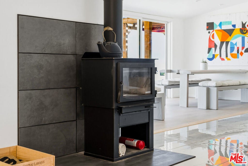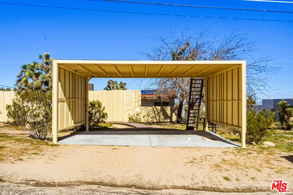 Set on a half-acre at the quiet end of a road in Friendly Hills, Desert Star offers a rare sense of peace at the edge of Joshua Tree National Park. At 3,500 feet in elevation, this Joshua Tree home enjoys cooler desert air, expansive night skies, and direct access to neighborhood hiking trails - an ideal setting for those seeking privacy, wildlife, and uninterrupted views. A collaboration between designer/builder Todd Patterson and Argentinian architect/artist Sol Sanchez, the property blends sculptural architecture with grounded, desert-informed materials. The main residence spans approximately 2,700 square feet complemented by a 160 square foot art studio. Six exterior patio spaces totaling 900 square feet extend the living experience outdoors including a shaded loggia garden, a sunken social patio, three reclaimed-beam pergolas, and a wood deck with two modern soaking tubs positioned for star-filled evenings. Inside, the layout features a pivot-door foyer entry, a generous great room anchored by a modern wood-burning stove, a formal living area, and a dedicated dining room. Three bedrooms each boast en-suite baths, alongside a well-placed powder room. The Japanese inspired kitchen is designed for both beauty and function, supported by a server and wine closet. Large format porcelain tile floors run through the main living areas, while new carpet softens the bedrooms. Systems are thoughtfully upgraded, including a 22-panel PV solar array, fiber optic internet, Nest thermostat, forced-air climate control, tankless LP water heater, water filtration system, new septic, and a SmartLock entry. A two-space carport, storage shed, dedicated future pool space, and an outdoor fire pit complete this Joshua Tree retreat.