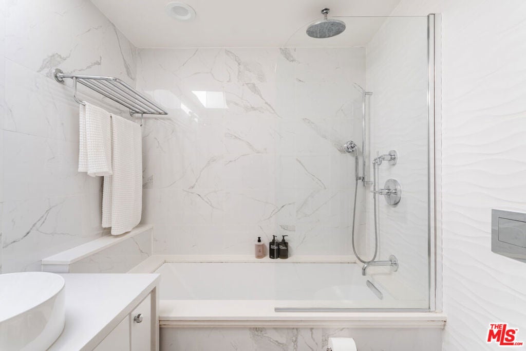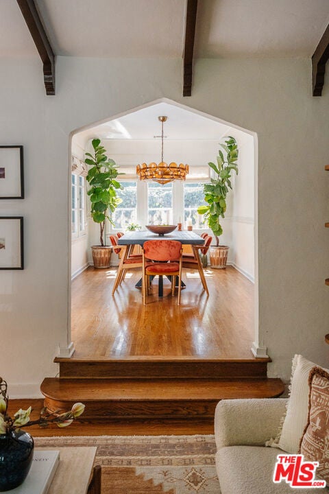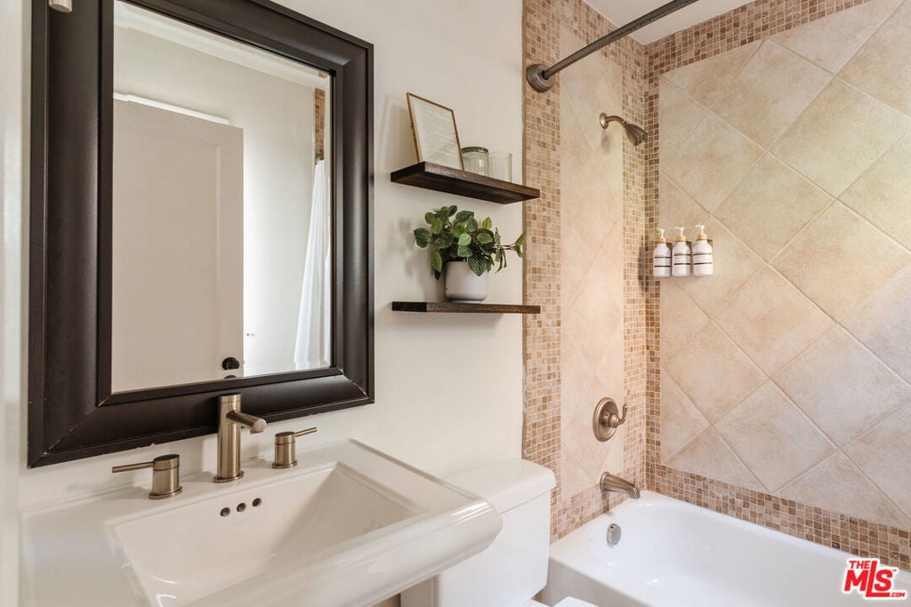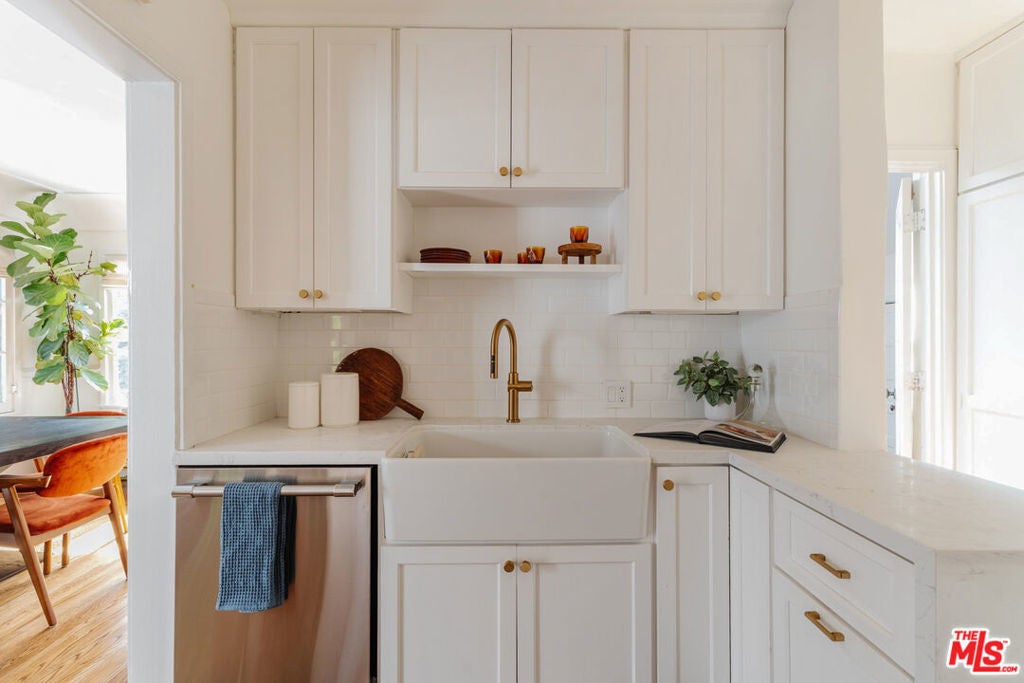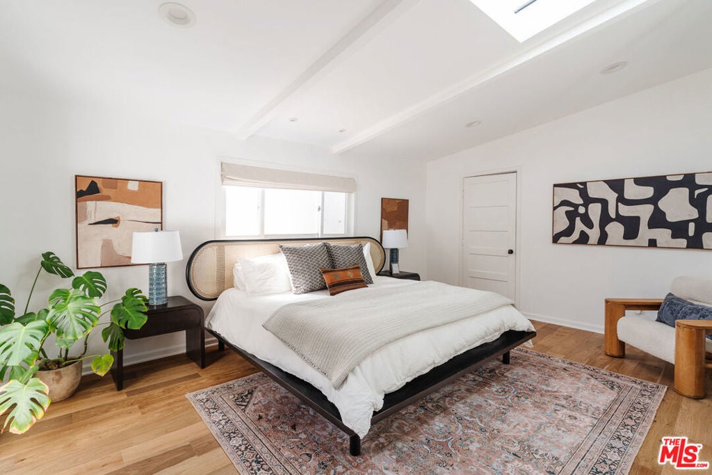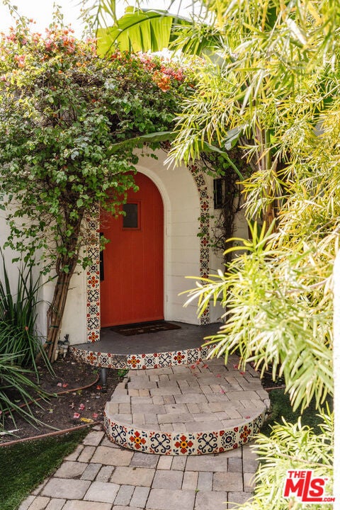 Built in 1927 and rich with character, this Spanish Revival residence sits tucked behind a patterned iron gate and newly planted hedges, unfolding with quiet confidence and architectural presence. Classic stucco walls, red clay rooflines, carved wood detailing, and a tiled arch brushed with bougainvillea set the tone before you even step inside. A private courtyard greets you first, establishing a sense of retreat and intimacy that feels distinctly Californian. Through the arched wood door, the living room rises dramatically with vaulted ceilings and dark-stained beams, each one anchored by carved corbels that add depth without excess. Original red oak hardwood floors run underfoot, carrying the warmth of the era throughout the home. The fireplace serves as the architectural anchor of the room, finished with its original tile hearth and mantle, a detail that quietly preserves the home's craftsmanship and history. Divided-light windows frame greenery on all sides, allowing natural light to move through the space. Built-in arched niches, linen drapery, and thoughtfully placed sconces add rhythm and softness. A subtle step-up introduces dimension while maintaining flow, a quiet nod to classic Spanish planning. Arched transitions guide you from space to space, creating a natural cadence throughout the home. In the dining room, a warm amber-glass chandelier casts a soft glow, echoing the richness of the original floors and setting an inviting stage for gatherings.The kitchen respects the architecture while feeling fresh and refined. Crisp white cabinetry meets honed stone countertops and warm brass hardware. A farmhouse sink with a statement faucet anchors the room, while patterned tile behind the range introduces artistry without overwhelming the design. Stainless appliances and open shelving are integrated with restraint, allowing the character of the home to remain at the forefront. The primary suite is generous yet serene, designed with clean lines and a restrained palette. A skylight draws in natural light from above, while a new French door opens directly to the courtyard, reinforcing the home's connection to air and landscape. The bath has been reimagined with dual vanities, custom cabinetry, and wall-mounted fixtures set against large-format stone tile. A second skylight brightens the room, highlighting subtle veining and creating a calm, restorative atmosphere. A well-organized walk-in closet completes the suite with ease and function. Throughout the home, walls have been refinished and painted, lighting elevated with curated fixtures, and hardware selections carefully considered for cohesion. The courtyard has been refreshed with new lighting and finishes, creating an intimate setting for evening dinners or slow mornings. A driveway extends to the rear with EV charging, adding modern practicality to the property's architectural integrity. Ideally positioned in the heart of Beverly Grove, moments from the iconic Beverly Center and the boutiques of Melrose Place, this location places you at the center of one of LA's most vibrant lifestyle corridors. Enjoy coffee at Alfred Coffee or Community Goods, weekend brunch at Joan's on Third, dinner at A.O.C. or Bacari W 3rd, and shopping at The Grove just minutes away. Everyday essentials are equally convenient with Whole Foods Market, Erewhon,Trader Joe's, and neighborhood favorites lining West 3rd Street. Offers due Wednesday, March 11th at 5pm.