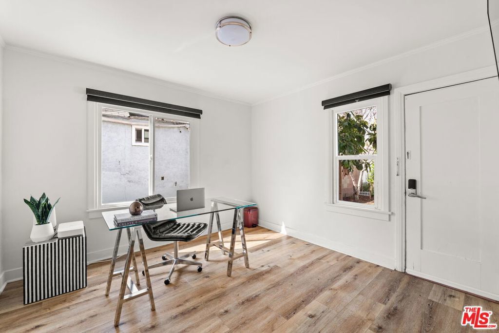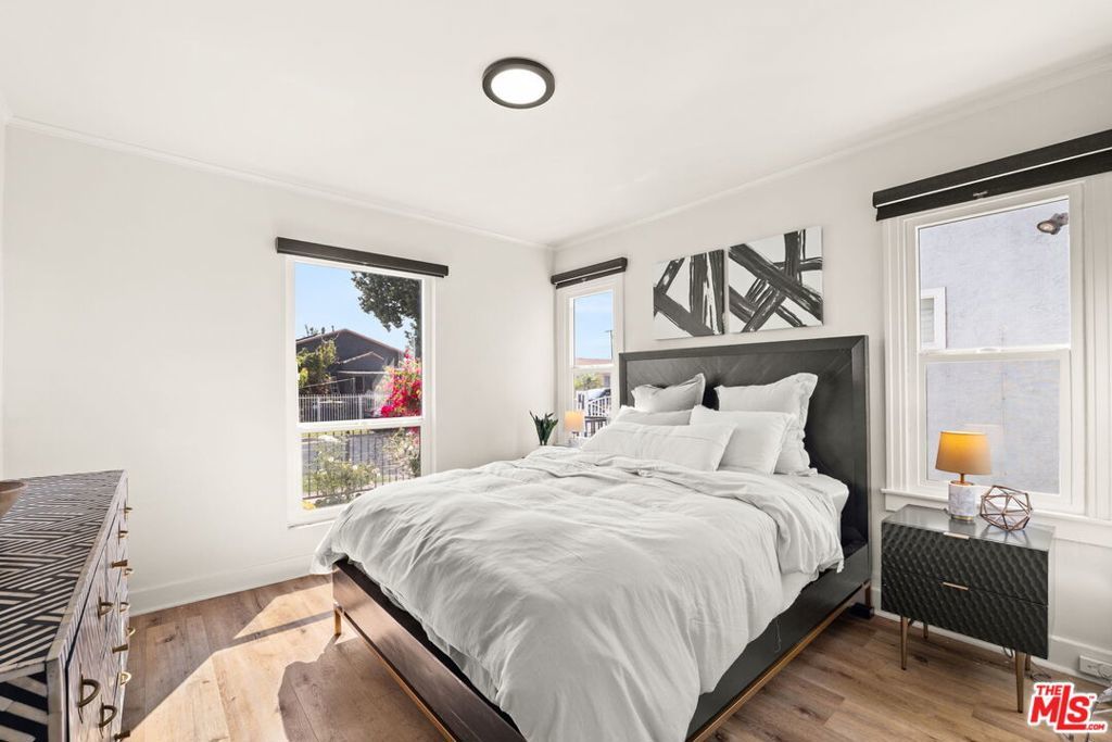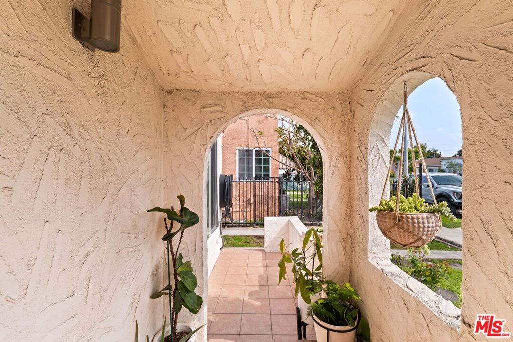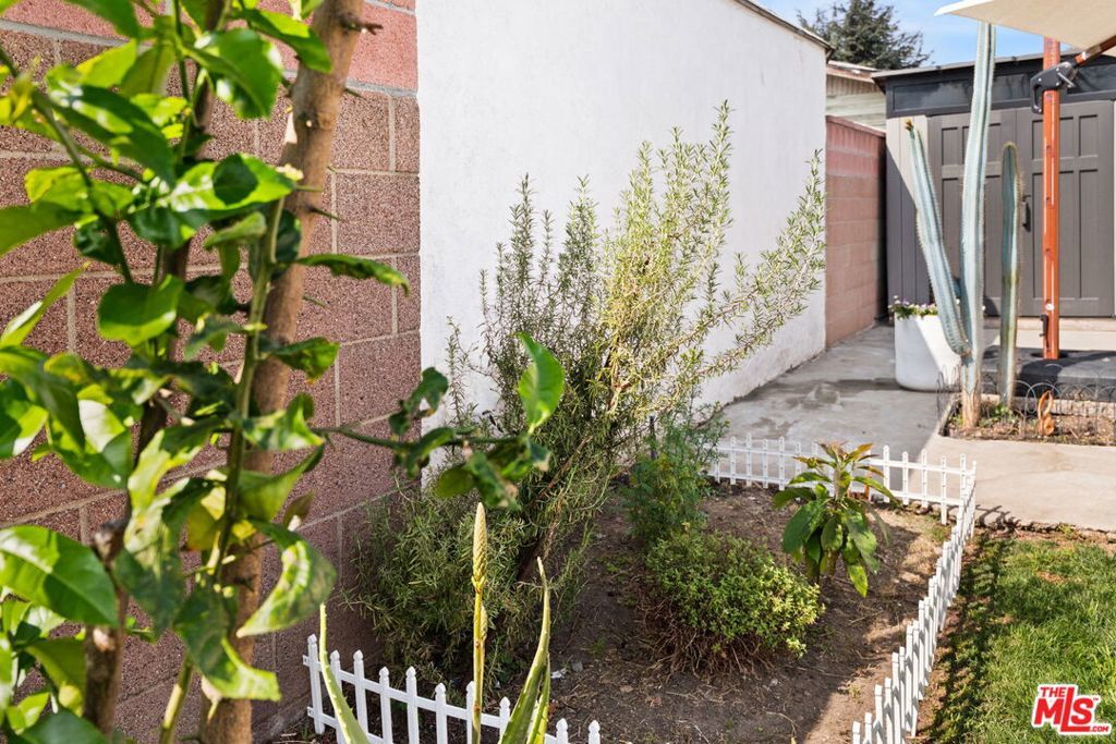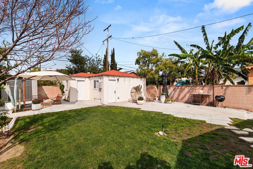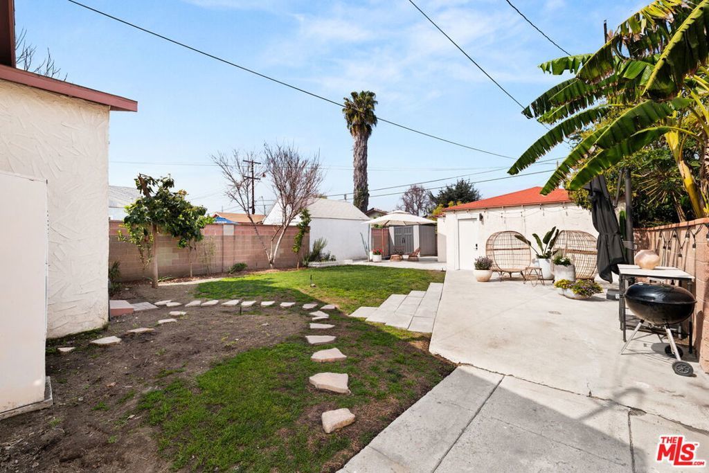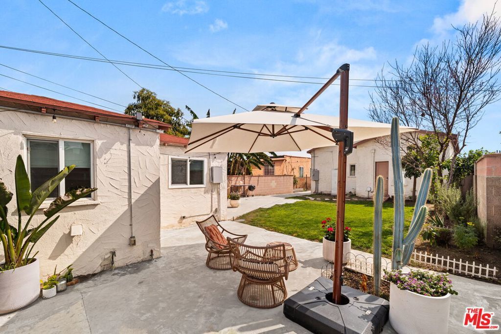 Welcome to this charming home set on a peaceful South LA street! This Spanish-style property blends character with modern interior upgrades and spacious outdoor living. From the moment you arrive, blooming bougainvillea and fragrant white jasmine draped across the arched entry creates a soft, inviting curb appeal. Year-round iceberg roses beautifully border the front of the property, adding color and elegance in every season. Upon entry, the 3-bedroom, 1-bath main home offers a light abundant, open-concept living, dining, and kitchen layout designed with functionality and modern design. Recessed lighting, and wood-like flooring enhance the warm, inviting feel. The open entertainers kitchen is anchored by a beautiful waterfall quartz countertop complemented by sleek cabinetry and stainless steel appliances. A dedicated back laundry room adds convenience, while the detached 1-bedroom, 1-bath back unit provides valuable flexible bonus space which can be used as a guest quarters, office, studio, or later converted into a detached ADU. The backyard is a large private sanctuary featuring a spacious lawn and mature fruit-producing avocado, peach, lime, and grapefruit trees. In addition, an array of thriving herbs and chile garden sits just steps from the kitchen, providing for a truly diverse garden set up. Additional highlights include a 200-amp upgraded electrical panel, blackout window shades, wireless built in speaker system in both bathrooms, Rachio system used to control the sprinkler system timers, upgraded laminate wood flooring in back unit, and Level 2 EV charging capability conveniently located in the front gated driveway. With its combination of architectural character, functional interior design, and large outdoor space, this South LA Spanish style property is the kind of home that doesn't come along often.