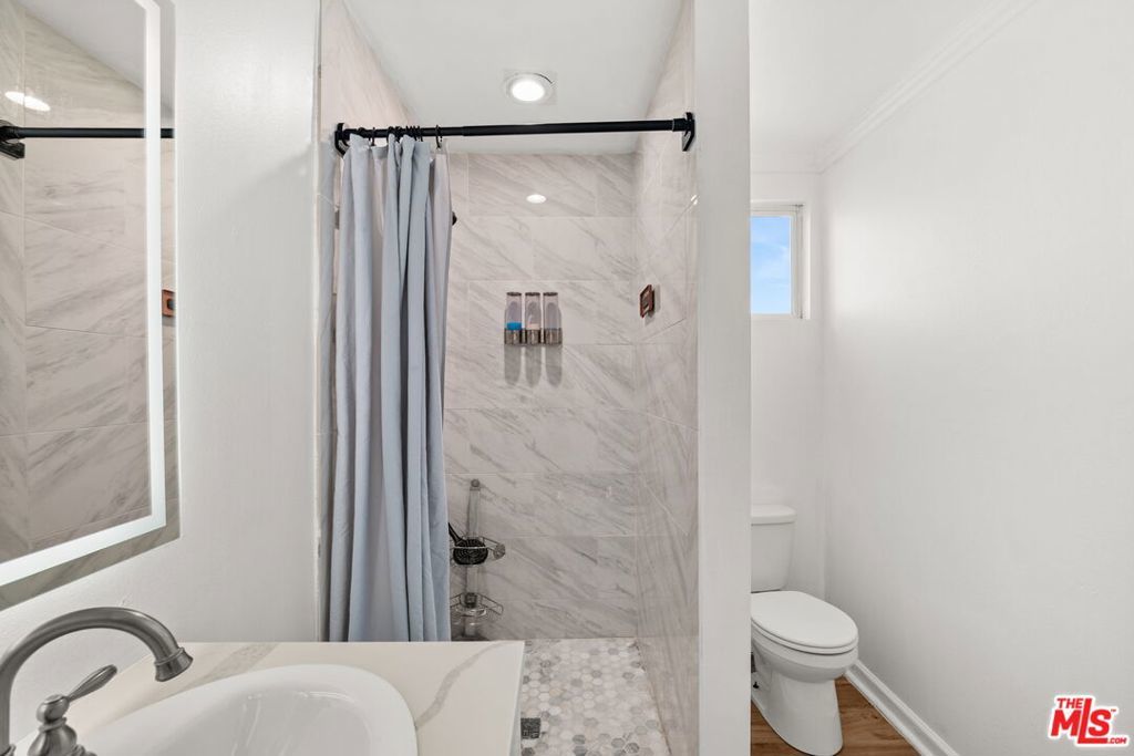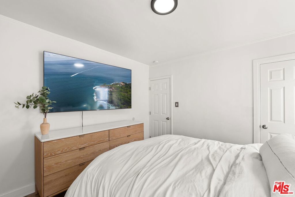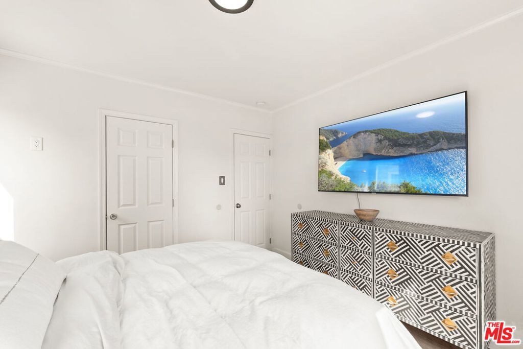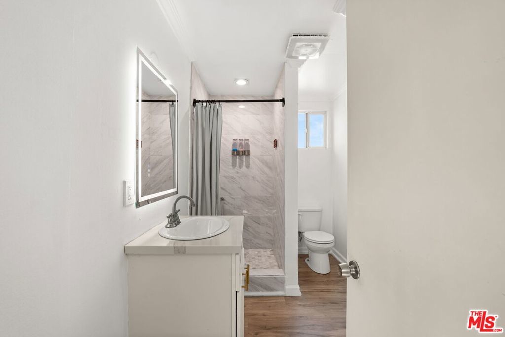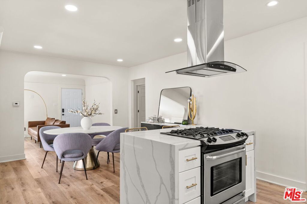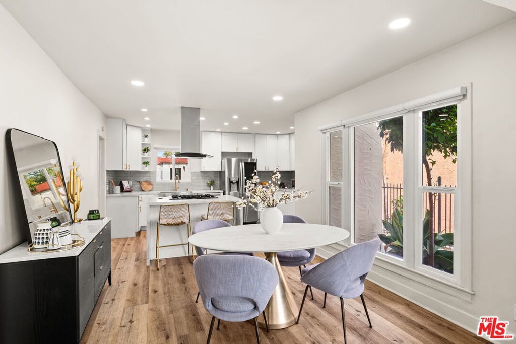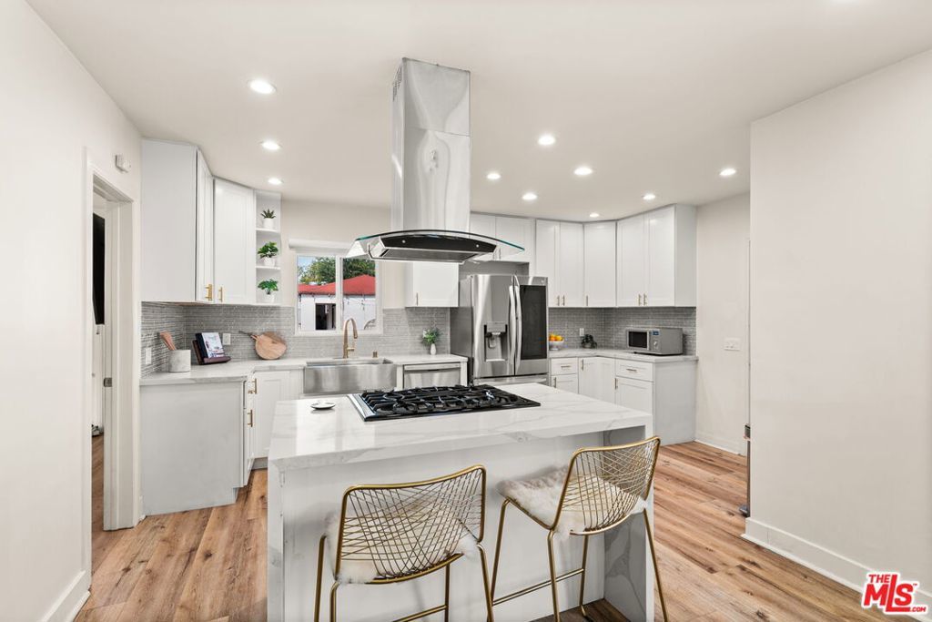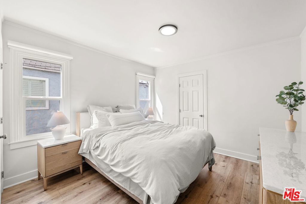 Welcome to this charming home set on a peaceful South LA street! This Spanish-style property blends character with modern interior upgrades and spacious outdoor living. From the moment you arrive, blooming bougainvillea and fragrant white jasmine draped across the arched entry creates a soft, inviting curb appeal. Year-round iceberg roses beautifully border the front of the property, adding color and elegance in every season. Upon entry, the 3-bedroom, 1-bath main home offers a light abundant, open-concept living, dining, and kitchen layout designed with functionality and modern design. Recessed lighting, and wood-like flooring enhance the warm, inviting feel. The open entertainers kitchen is anchored by a beautiful waterfall quartz countertop complemented by sleek cabinetry and stainless steel appliances. A dedicated back laundry room adds convenience, while the detached 1-bedroom, 1-bath back unit provides valuable flexible bonus space which can be used as a guest quarters, office, studio, or later converted into a detached ADU. The backyard is a large private sanctuary featuring a spacious lawn and mature fruit-producing avocado, peach, lime, and grapefruit trees. In addition, an array of thriving herbs and chile garden sits just steps from the kitchen, providing for a truly diverse garden set up. Additional highlights include a 200-amp upgraded electrical panel, blackout window shades, wireless built in speaker system in both bathrooms, Rachio system used to control the sprinkler system timers, upgraded laminate wood flooring in back unit, and Level 2 EV charging capability conveniently located in the front gated driveway. With its combination of architectural character, functional interior design, and large outdoor space, this South LA Spanish style property is the kind of home that doesn't come along often.