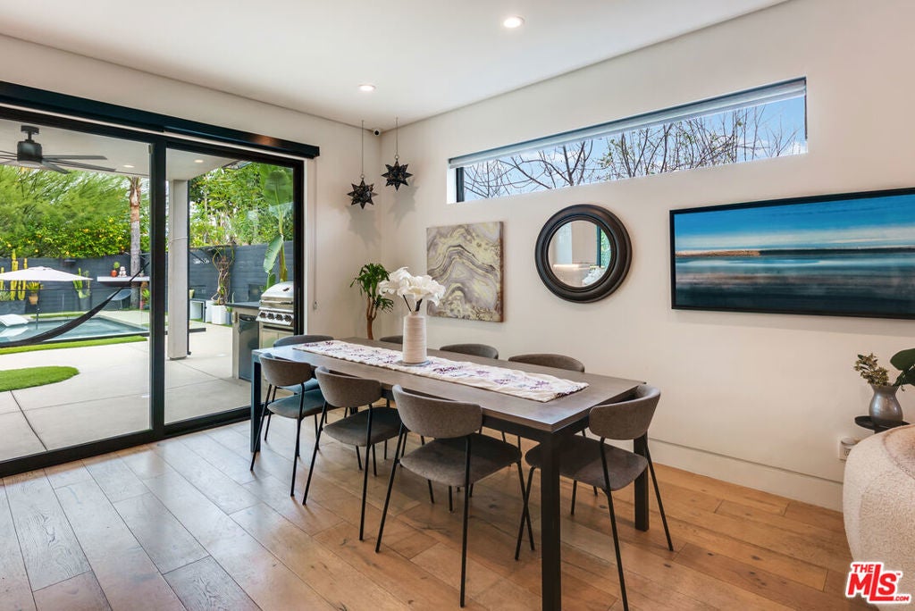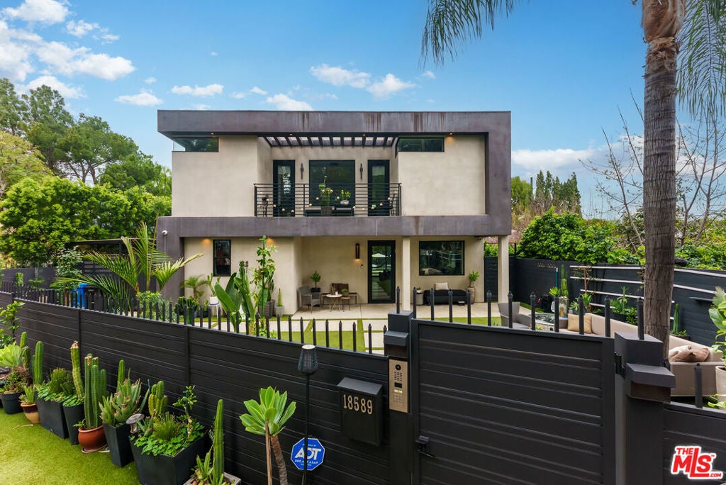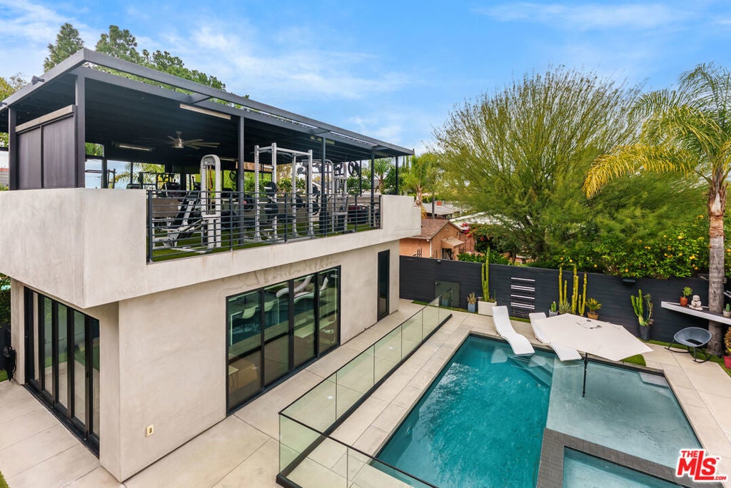 This stunningly updated, impeccable 'smart home' is not to be missed! Gated, South-of-the-Boulevard two-story residence, blending modern design with elevated comfort, complete with a separate pool/guest house and a show-stopping rooftop gym. Thoughtfully remodeled with exceptional attention to detail, the home offers a bright, open-concept layout where the spacious dining area flows effortlessly into a refined living room featuring a custom-built bar - perfect for entertaining. The sleek chef's kitchen is outfitted with premium appliances, designer finishes, and an oversized center island with seating. Wide-plank oak flooring runs throughout, enhancing the home's calm, contemporary aesthetic. A main-level bedroom with private side-yard access makes an ideal office, guest suite, or client-friendly workspace. Upstairs, the primary suite feels like a retreat, featuring dual walk-in closets, a generous balcony with scenic views, and a spa-inspired bath with double vanities, an oversized shower, and stylish barn-door detailing. Two additional en-suite bedrooms, a shared balcony, and a dedicated laundry area complete the second floor. The detached pool/guest house (converted from the original garage) includes a full kitchen with a full-size refrigerator, laundry area, comfortable living space, and a bath with direct pool access. The outdoor spaces are equally impressive. A private, landscaped front yard welcomes you behind secure gates, while the entertainer's backyard features a sparkling pool and spa, built-in BBQ, fire pit, and multiple lounge areas that truly shine in the evening hours. Smart home features add convenience throughout. Just moments from Ventura Blvd.'s shops and dining, with easy access to the 101 Freeway, this exceptional property delivers privacy, style, and convenience in one beautifully curated package.