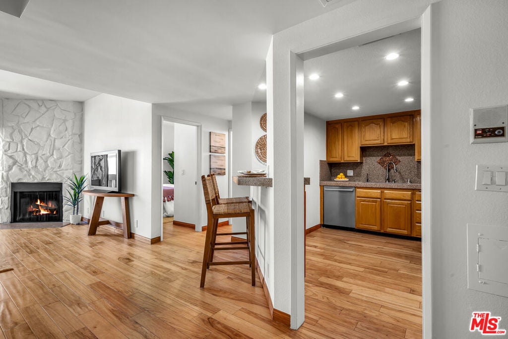 This beautifully updated end-unit condo in the heart of Playa del Rey, just half a mile from the beach and minutes from everything the Westside has to offer. This bright and airy 2 bedroom, 1.5 bath home is located within the highly sought-after Manitoba West complex, a 24-hour guard-gated community known for its resort-style amenities and lush, park-like grounds. Inside, you'll find freshly painted interiors, rich hardwood floors, and soaring ceilings that create an open, spacious feel. The inviting living room features a cozy fireplace and flows seamlessly into the dining area and kitchen, complete with stainless steel appliances. The convenience of in-unit laundry adds everyday ease, while a dedicated storage space keeps everything organized. The community amenities are second to none: a newly renovated fitness center, pool, two spas, saunas, pickleball courts, tennis courts, paddle court, and ample guest parking. With two garage parking spaces and 24/7 security, comfort and peace of mind come standard.