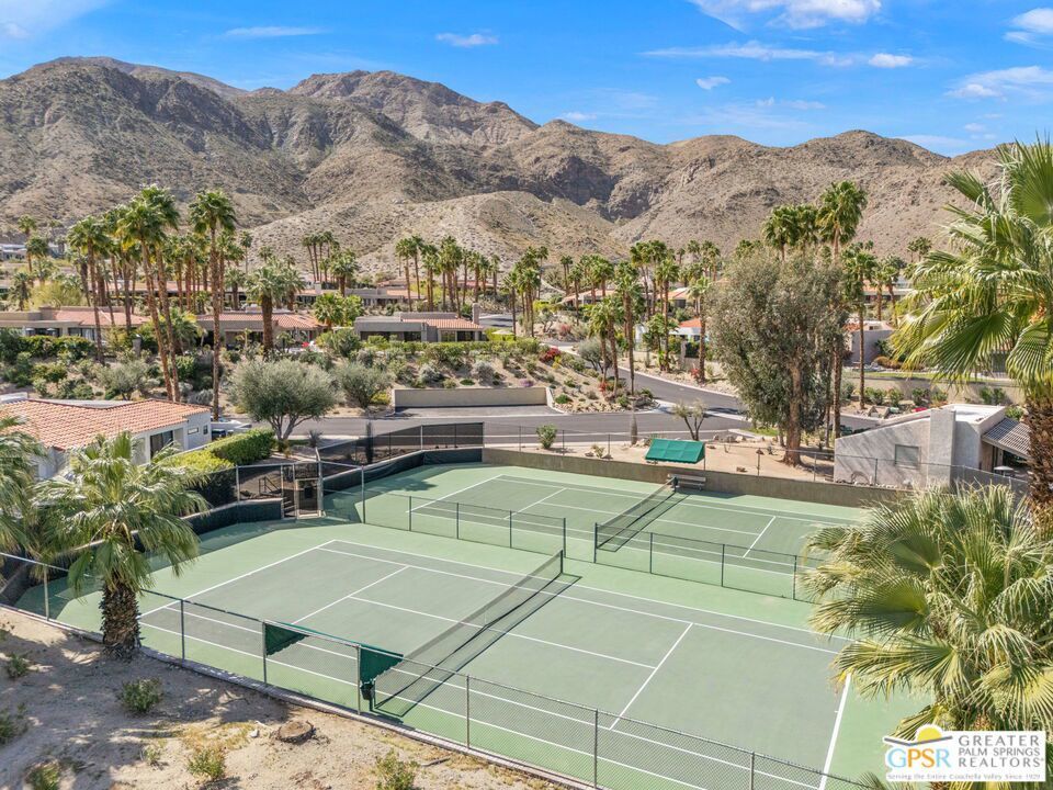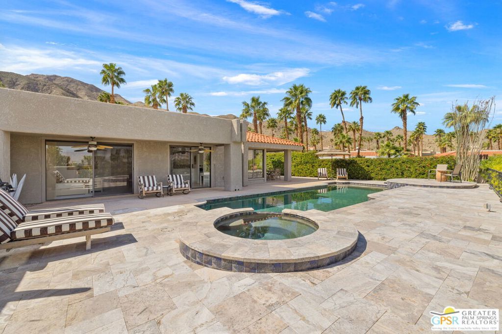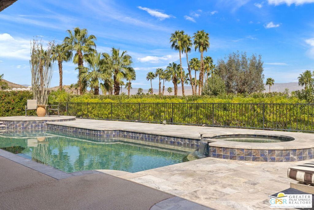 Perched above the valley floor in the private gated enclave of Mirage Cove, this 3 bedroom, 3 bath detached residence captures unobstructed mountain and valley views from a prized corner lot setting. With just 69 single-family homes, Mirage Cove offers a rare combination of privacy and on-site amenities including swimming, tennis, and pickleball - an ideal retreat for those who value both serenity and community. A private south-facing courtyard sets the stage for arrival before double doors open to a light-filled living space defined by vaulted ceilings, floor-to-ceiling glass, a gas fireplace, and a wet bar. Expansive sliders connect the living and dining areas to a covered patio and a generous backyard designed for indoor/outdoor living. The pool and in-ground spa are positioned to maximize sweeping views of the valley floor and surrounding mountains - an ideal vantage point for relaxing evenings and even the occasional sighting of Big Horn sheep across the hillside terrain. The separate kitchen features clerestory windows, granite countertops, abundant cabinetry, and a casual dining area, with direct access to the outdoor entertaining spaces. The Primary Suite enjoys mountain views, patio access, and a spa-inspired bath with dual vanities, soaking tub, walk-in shower, and walk-in closet. Junior Ensuite Two is privately positioned on the opposite side of the home with its own patio, dual vanities, soaking tub, and walk-in shower. Junior Ensuite Three also captures views and offers convenient access to a bath with shower/tub combination. Additional highlights include an inside laundry room, attached two-car garage, and rare RV parking - an exceptional feature in this setting. A private hillside retreat with scale, views, and lifestyle that is minutes from the heart of Rancho Mirage.