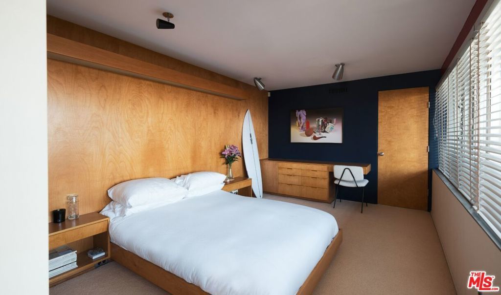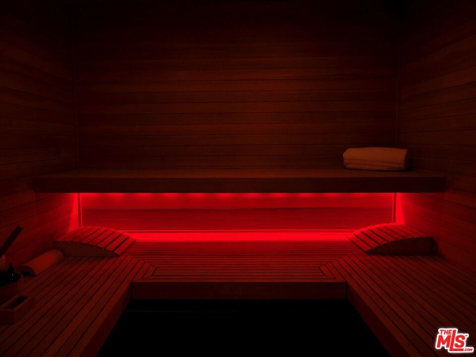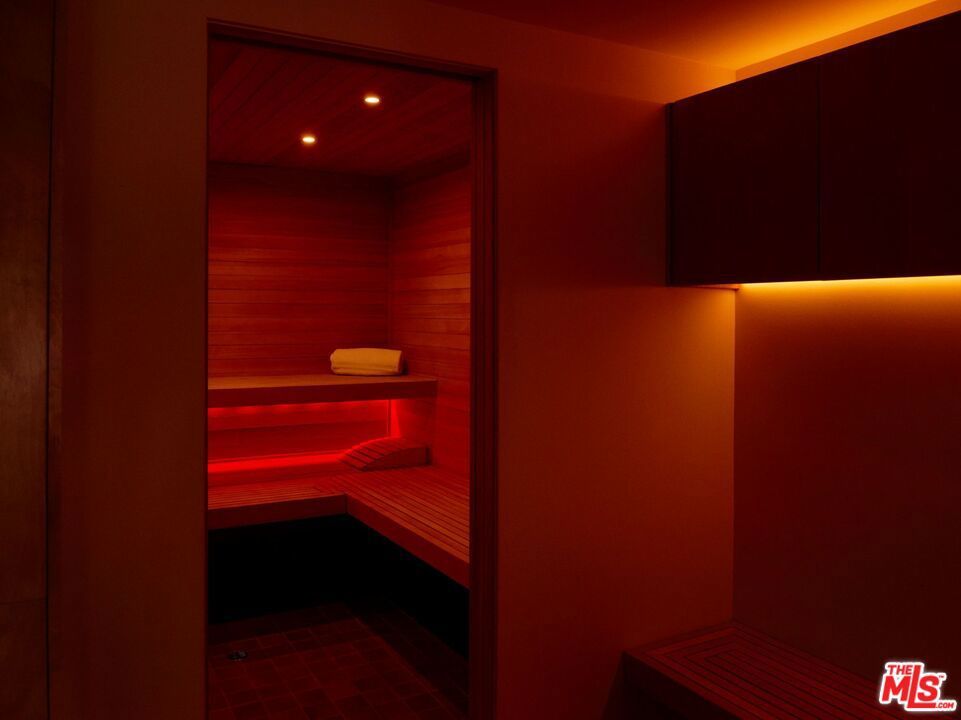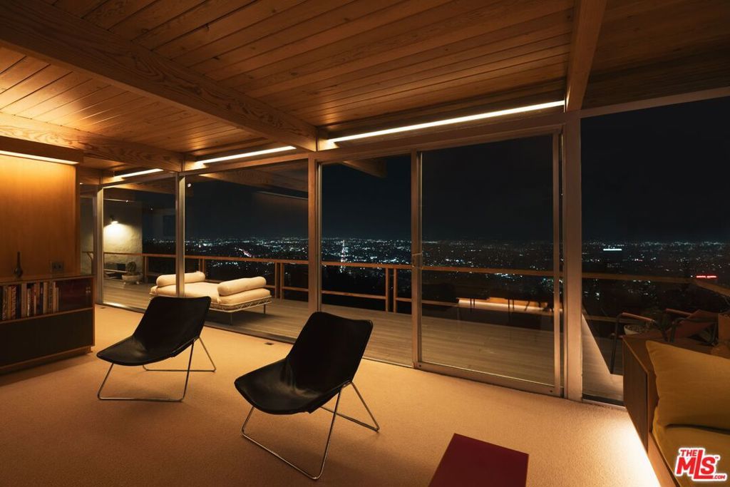 A flawless restoration of Richard Neutra, FAIA :: The Linn Residence, 1961. Sits on a secluded promontory perched, above the legendary Mulholland Drive in the Hollywood Hills, with explosive views of the Valley and the San Gabriel Mountain range. Neutra lifts the main level above the site and over the carport and a separate guest quarters to further enhance the views. This second level consists of a living area divided by a hearth, newly restored kitchen, ensuite primary with bath, guest bath, two bedrooms separated by a collapsible wall, and the red room sauna. The grounds include terraces, decks, private pool, and gated drive. Absolutely everything impeccably restored.