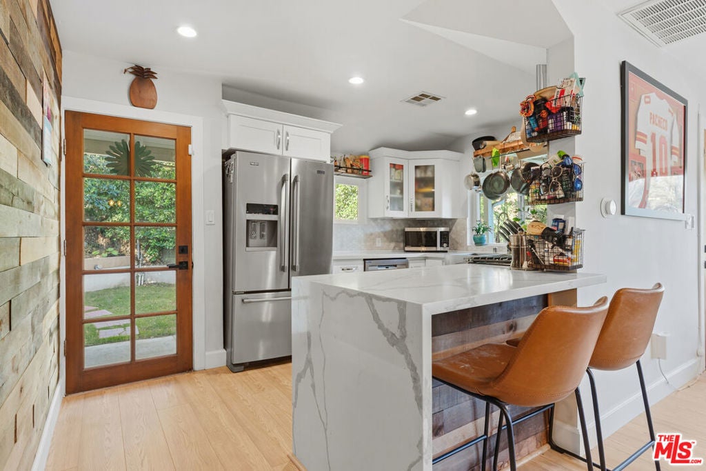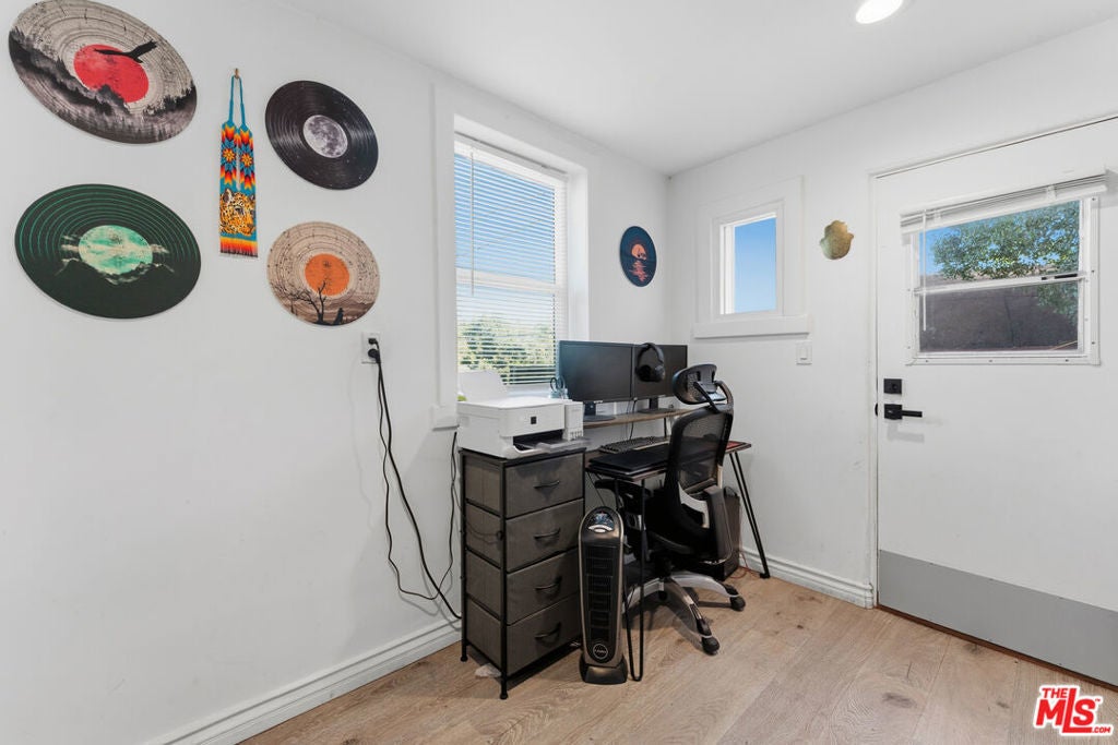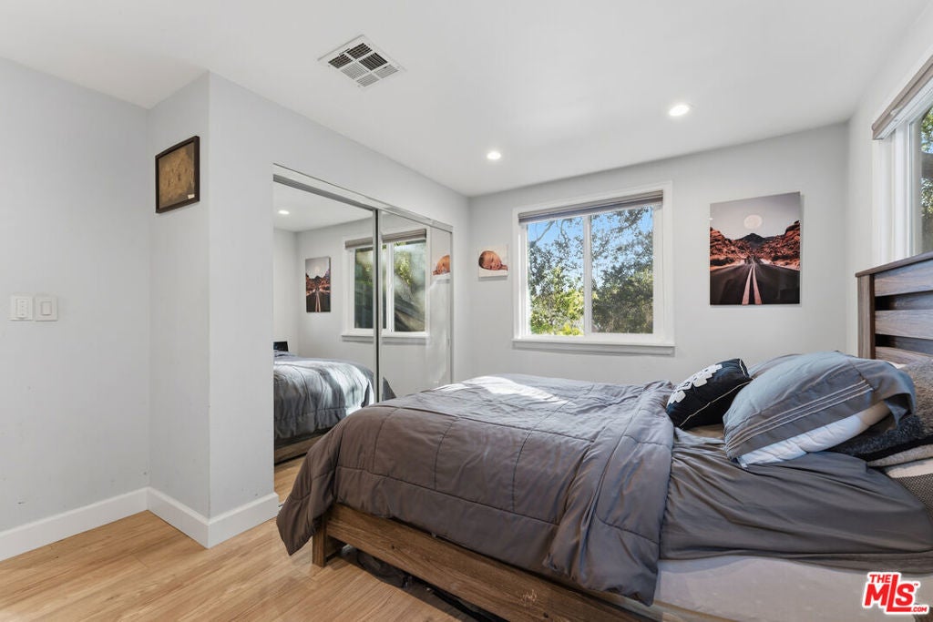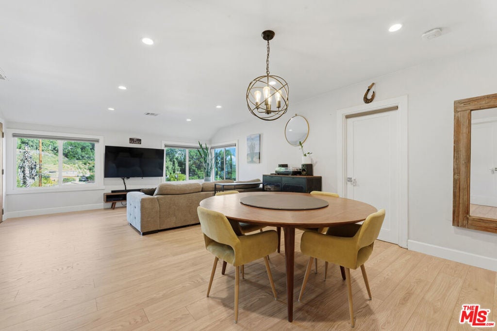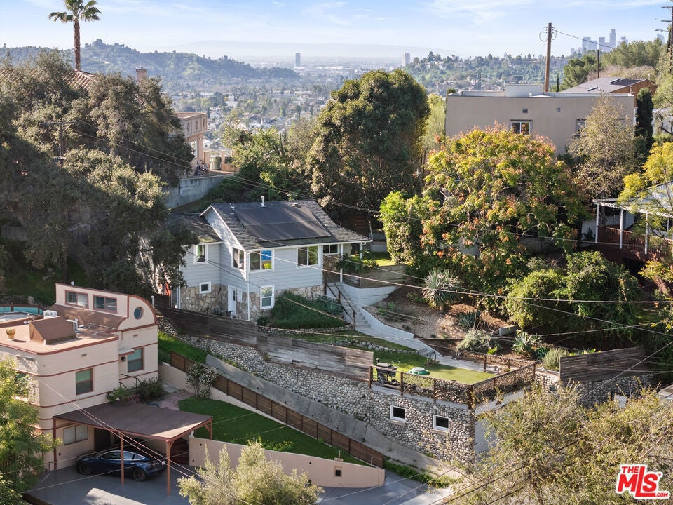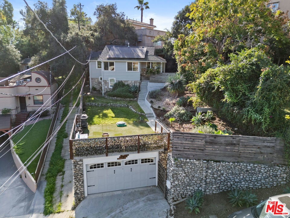In the hills of Highland Park, this remodeled cottage-style home offers sweeping hillside and mountain views from nearly every room. The main level features two bedrooms with custom closets, brand new luxury vinyl flooring, light-blocking blinds, and serene outlooks, while the open living and dining areas flow into a bright kitchen with bar seating. The lower level includes a third bedroom with a private entrance, ideal for a home office, studio, gym, and a large additional storage space. Step out to a covered patio and garden that wraps to the front entrance, with mountain views as the backdrop. Featuring an expansive street-to-street lot with a backyard terrace above, revealing panoramic DTLA views--perfect for extra parking, relaxing, or entertaining. Additional highlights include solar panels for energy efficiency, four parking spaces, and a prime location near hiking trails and just minutes to downtown, blending hillside tranquility with city convenience.