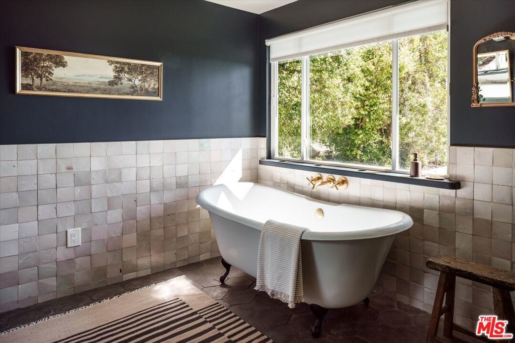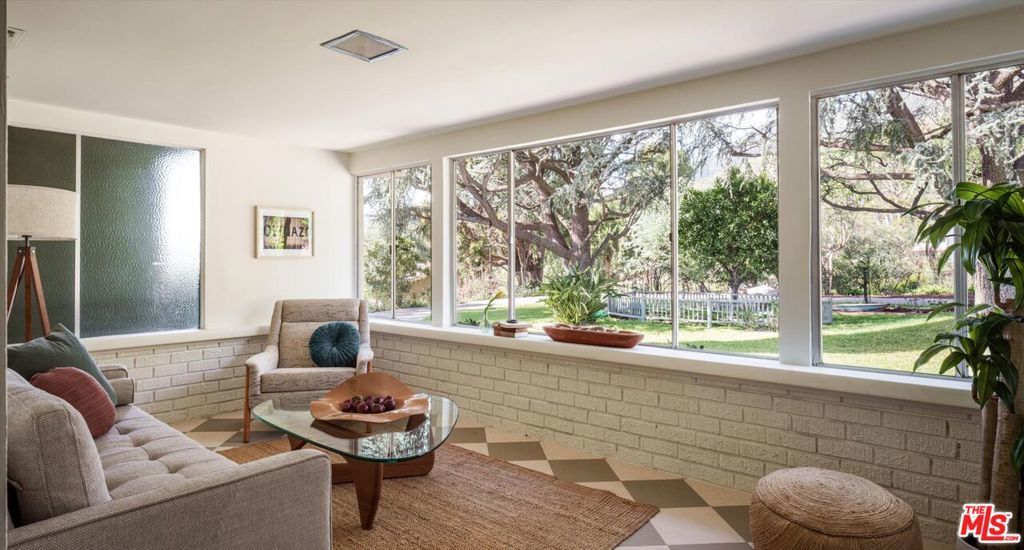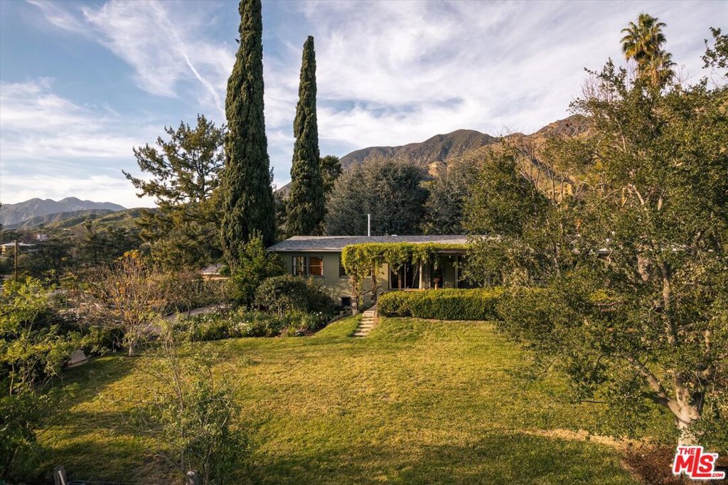 Presenting a preserved yet updated mid-century ranch that exemplifies the spirit of elevated, unpretentious and unspoiled Altadena living. This rare flag lot provides over 20,000 square feet of privacy and tranquility, perched amidst majestic trees and sprawling lawns. With sweeping views to the Pacific, and nestled against the backdrop of the San Gabriels, the single-story four bedroom, three bath home sits squarely mid-lot, harmoniously pulling nature inside through walls of windows, while inviting you outdoors via multiple access points. The sun-drenched dining room opens to a vine-covered pergola, perfect for midday shade and evening meals alike, while a wood-paneled living room with vaulted beamed ceiling and stacked stone fireplace showcase the home's original 1950s rustic character. An updated kitchen accesses a breakfast nook and cozy sunroom, and includes a Bertazzoni stove, tiled countertop and brass hardware on original cabinetry. The large bright and airy primary suite showcases the rear yard via wall-to-wall French doors and boasts an updated en suite bath with lush garden views from a deep freestanding tub, a heated towel rack, dual vanity with brass fixtures and zellige tiled walls. The original bedroom wing features another updated bath and three bedrooms with ample space, light and warmth.The ambling grounds make this property truly exceptional and rare...plus the pond, play house, vegetable garden, and swings provide a priceless backdrop for peace and quiet at home.