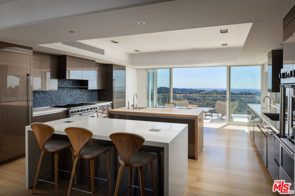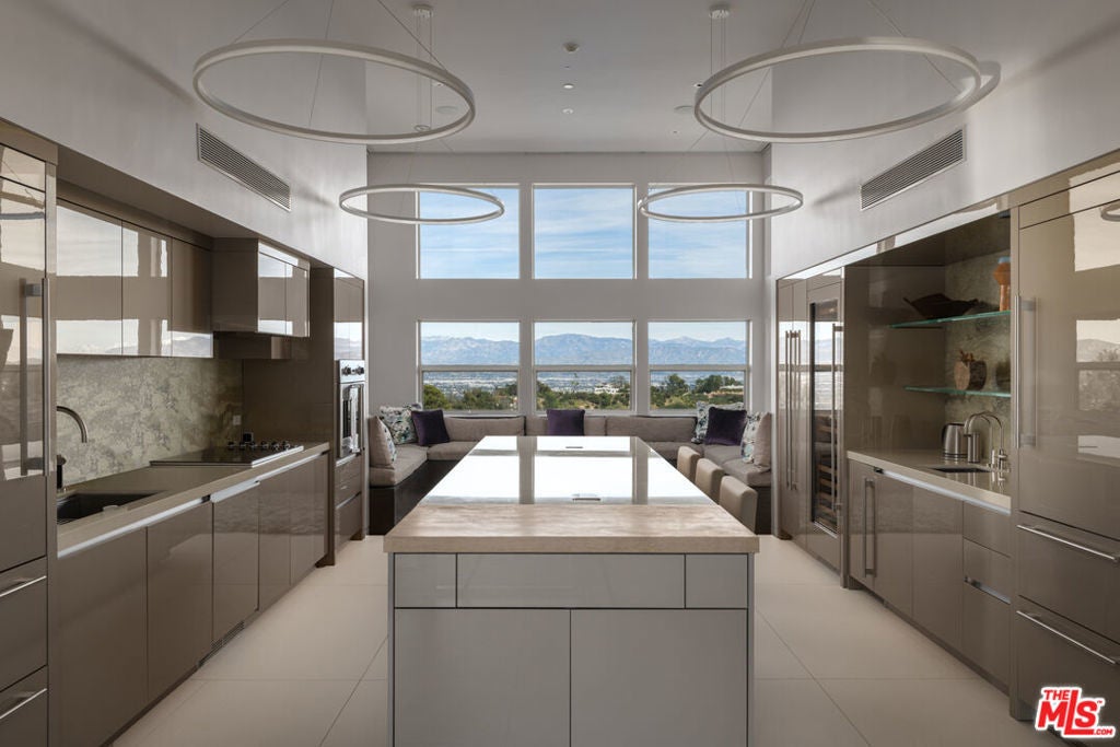Sited on a 3.2 acre promontory, this modern tour de force is the ultimate compound. Originally designed by Ted Tanaka and renovated completely by Clive and Julie Bridgwater. Antelo Estate is one of the few properties in the entire city to offer 300-degree views of the city, Pacific Ocean, downtown skyline and the Valley. Designed to emphasize the view, the architects elevated the majority of the house above ground so the residence seems to float on the site. Complete privacy down a long driveway and through double gates, a 150ft bridge greets visitors and introduces a most important architectural gem. Over 15,000 sqft of museum modern design. Two-story soaring great room, gourmet kitchen and limitless entertaining areas. Vast lawns, landscaping by Pamela Burton, and one of the finest tennis courts in the city with panoramic views. A rare offering. Shown only to prequalified buyers.