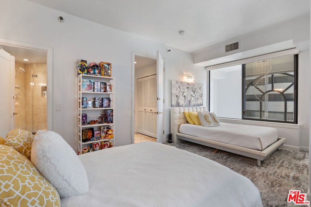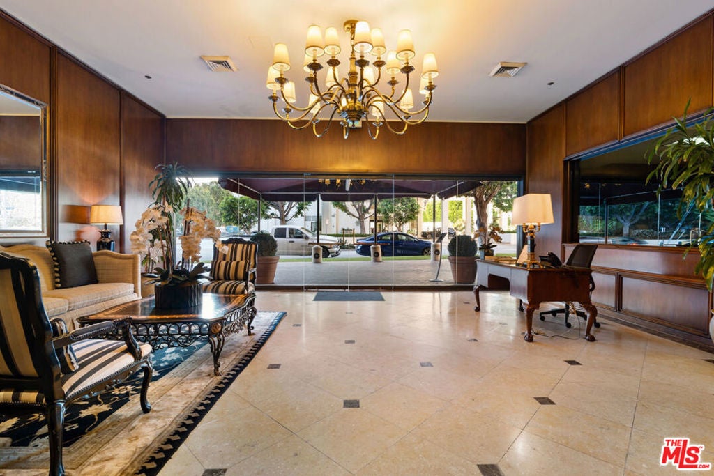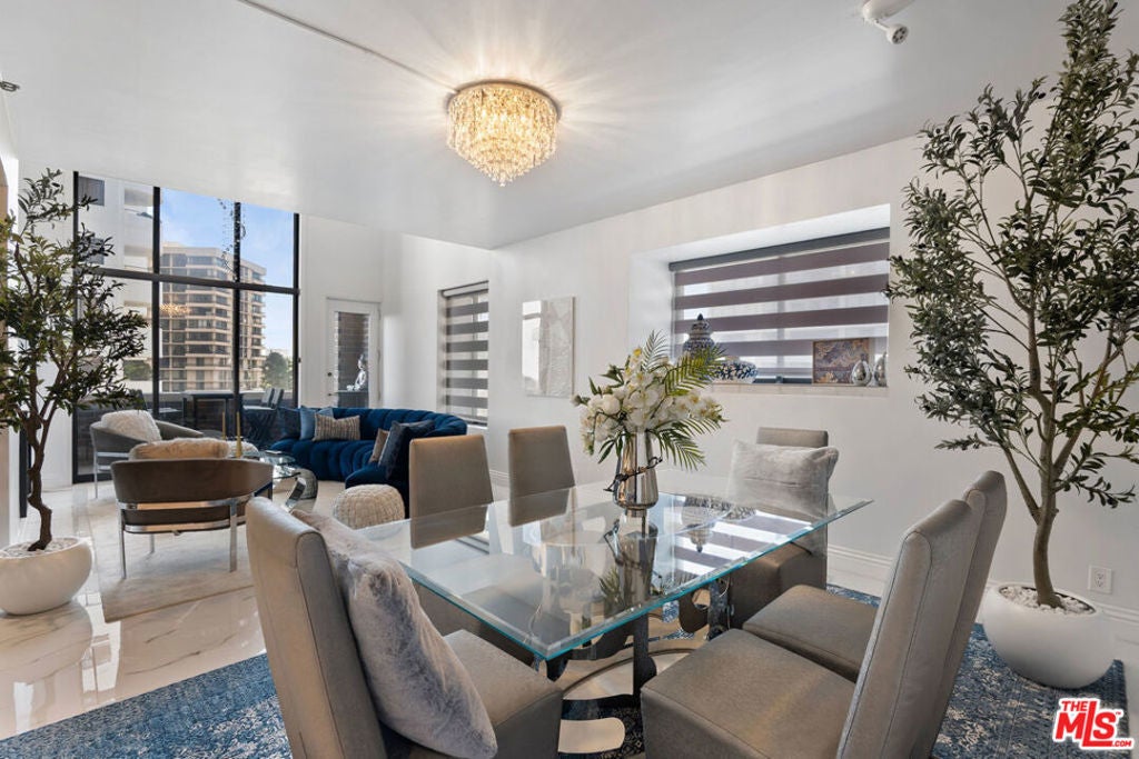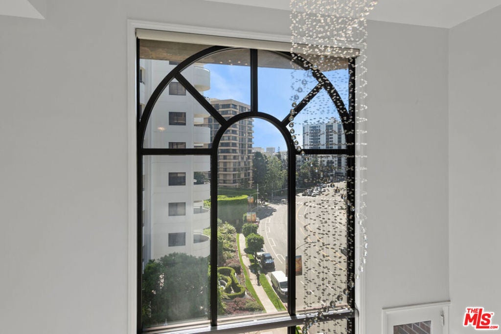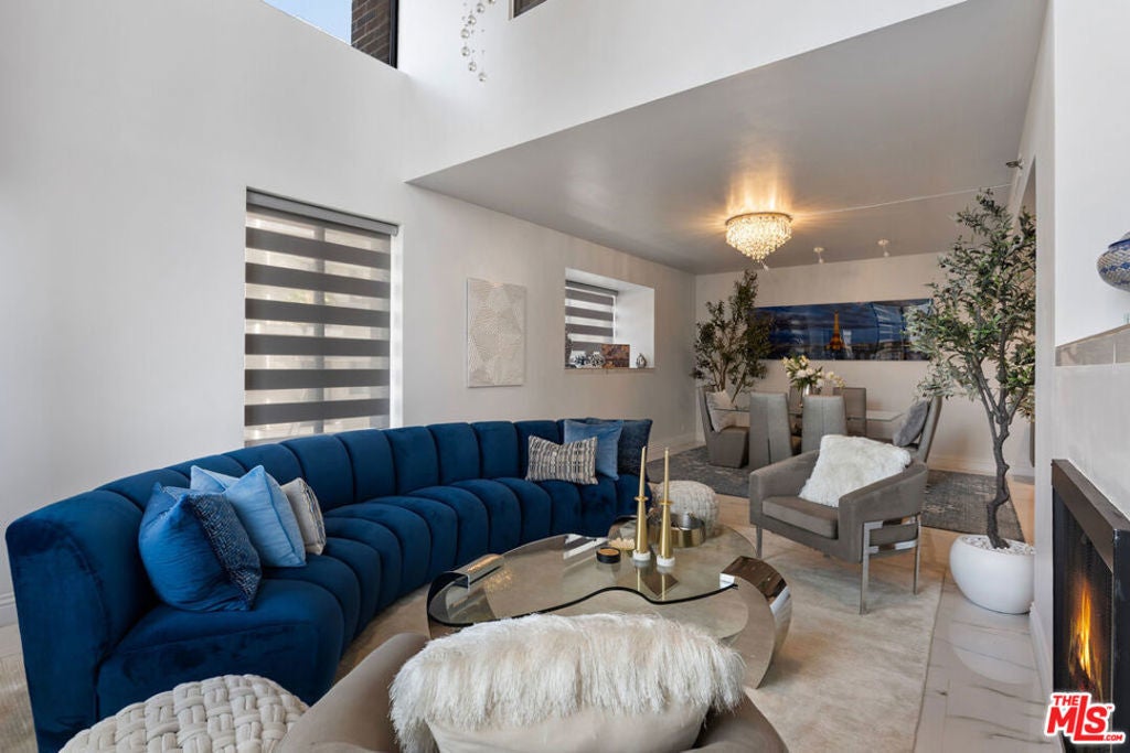 Welcome to The Wilshire Thayer, where refined luxury meets architectural distinction. This northwest-facing corner residence commands sweeping street and city views and offers an exceptional two-story layout encompassing approximately 2,146 square feet, with 2 bedrooms and 2.5 bathrooms. A formal entry introduces an expansive open-concept living and dining area, thoughtfully designed for both grand entertaining and everyday comfort. A contemporary fireplace anchors the space, while floor-to-ceiling glass walls frame the cityscape and open to a private balcony, seamlessly blending indoor and outdoor living. The gourmet kitchen is impeccably appointed with Carrara marble countertops, custom cabinetry, a generous breakfast bar, and premium Miele appliances. A well-proportioned den and an elegantly designed powder room complete the main level, which is unified by sleek porcelain tile flooring throughout. A dramatic spiral staircase leads to the upper level, where the primary suite serves as a tranquil retreat. This spacious sanctuary features its own fireplace, serene views, a walk-in closet with built-in safe, and custom cabinetry for ample storage. The spa-inspired primary bath offers a soaking tub, separate glass-enclosed shower, dual vanities, and a thoughtfully integrated dry bar with refrigerator. The junior suite enjoys a private full bath and overlooks the living area below through striking New York loft-style glass, creating a bold architectural statement. Plush carpeting, a discreet laundry closet, and a secondary private entrance enhance the comfort and functionality of the upper level. Ideally situated just moments from Beverly Hills, Century City, Westwood Village, UCLA, and nearby places of worship, this distinguished residence offers a rare combination of sophisticated design, premier location, and effortless convenience.