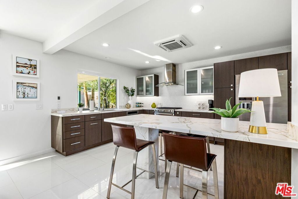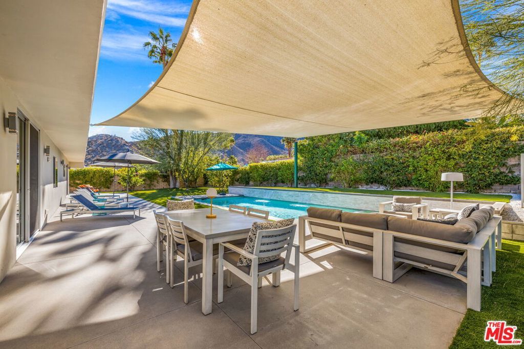 FURNISHED RENTAL | MINIMUM 2 MONTHS | AVAILABLE FOR APRIL & FESTIVAL SEASON. Fully furnished Mid-Century Modern retreat in Magnesia Falls Cove, perfect for a seasonal stay during Coachella. This 3-bedroom, 2-bath home features an open living space with porcelain tile floors, a statement fireplace, and walls of glass with electronic shades. The chef's kitchen offers custom cabinetry, Dekton countertops, premium appliances, and a large island that opens to seamless indoor-outdoor entertaining with a patio bar and fire pit. The primary suite opens to a private resort-style backyard with pool, spa, and mountain views. Two spacious guest rooms share a modern bath with skylight and designer tile. Additional features include citrus trees, shaded lounge areas, an air-conditioned two-car garage, and smart home controls. A stylish desert escape for Palm Springs' most vibrant season.