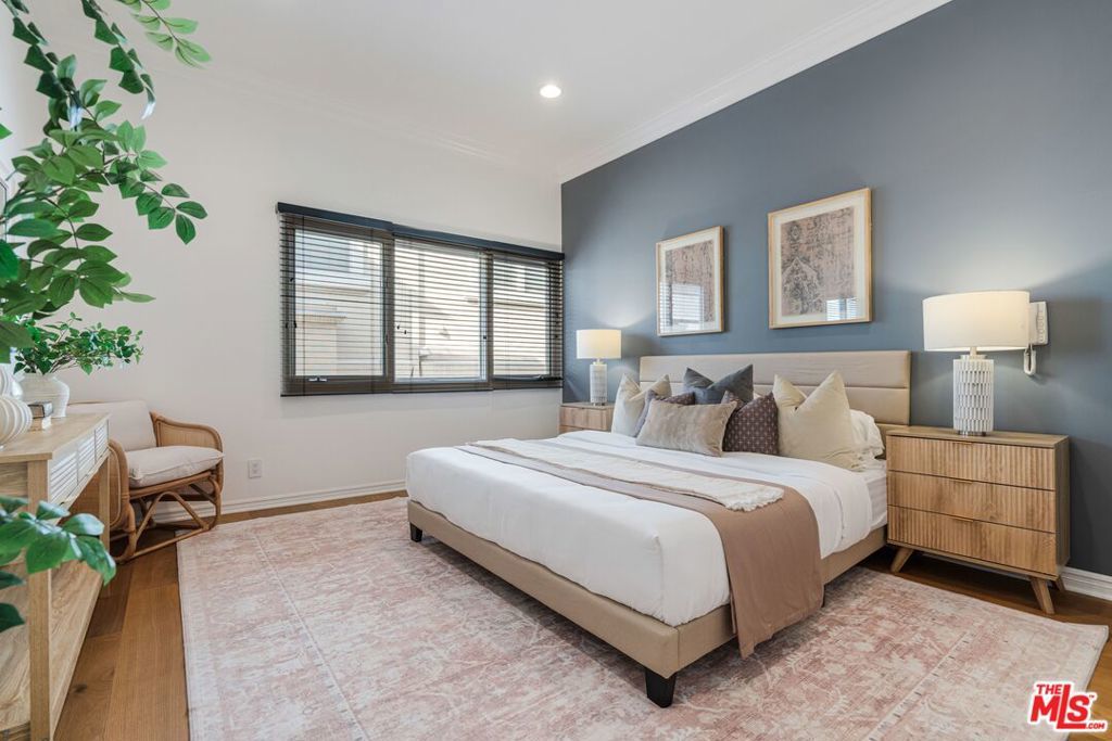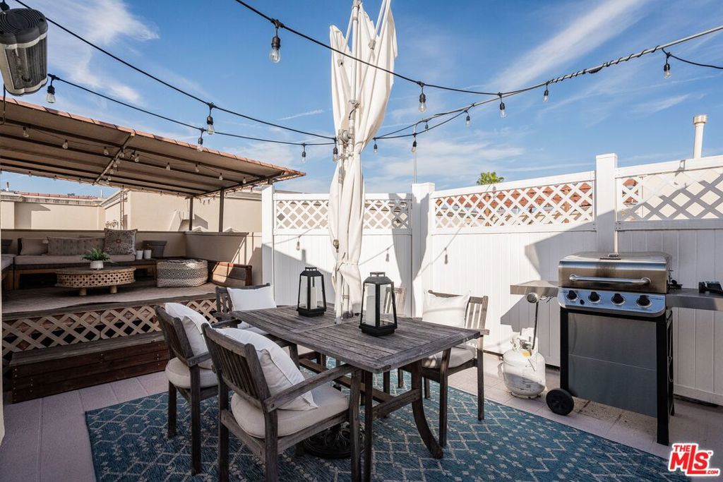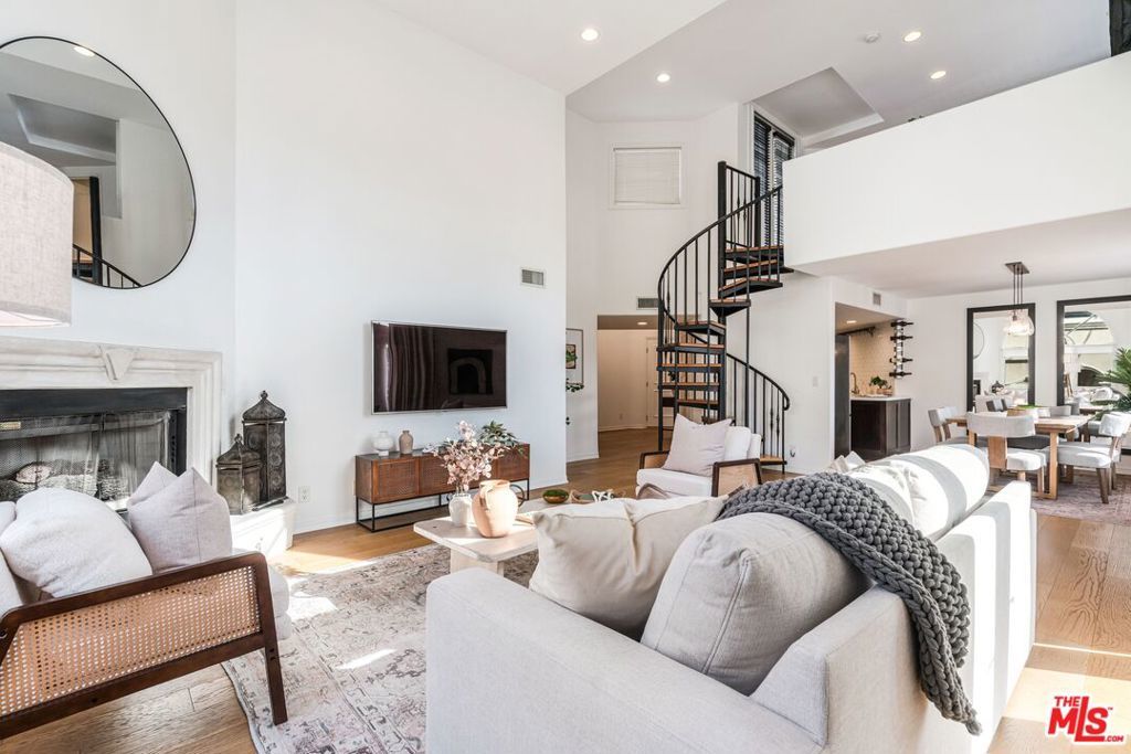 Welcome to this beautifully designed, light-filled penthouse that blends modern style with functionality. Featuring 3 bedrooms, 3.5 bathrooms, and 1,835 SF of living space, this sophisticated unit boasts soaring 14-foot ceilings, oversized windows, recessed lighting, and a cozy decorative fireplace. The main floor includes two spacious bedrooms, with an oversized primary bedroom with luxurious bathroom. An updated kitchen with top-of-the-line stainless steel appliances opens to the dining area and offers ample storage and counter space. A spiral staircase leads to a flexible loft-style third bedroom, complete with custom built-ins and its own en-suite bath, ideal as a home office or guest suite. French doors open to a private rooftop deck, a true oasis featuring a grill, overhead heater, and Moroccan-inspired seating area, perfect for entertaining. Additional highlights include in-unit stacked laundry and two-car tandem parking. Just one block from Beverly Hills and 3rd Street, this prime location puts you steps from trendy cafes, boutiques, and moments from Cedars-Sinai.