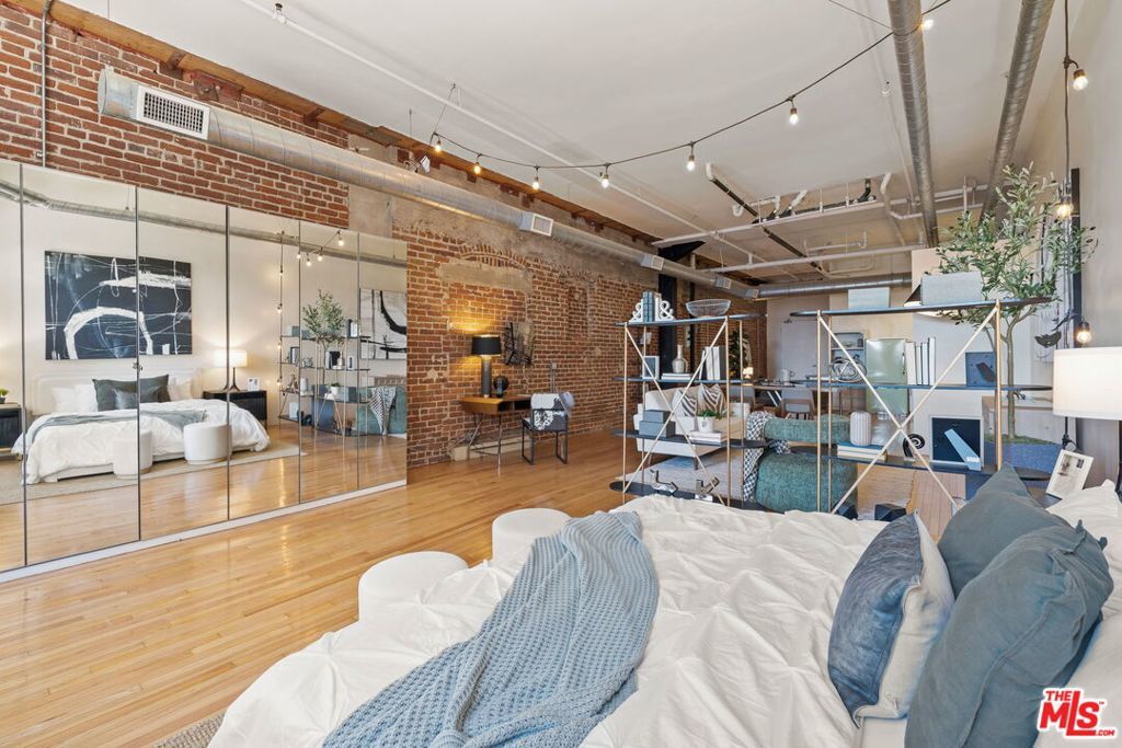 Historic live/work loft at the iconic Molino Street Lofts, located in the heart of Downtown Los Angeles' original Arts District. Converted from 1920s warehouse buildings, this authentic industrial space showcases exposed brick walls, soaring ceilings, polished hardwood floors, and natural light throughout. This sophisticated studio loft blends historic character with modern convenience. The open-concept floor plan offers exceptional flexibility perfect for a creative workspace or tranquil private retreat. The kitchen pairs vintage inspiration with contemporary functionality, featuring stainless steel appliances and a retro-style Big Chill refrigerator a stylish nod to the building's industrial heritage. Floor-to-ceiling exposed brick and wood floors create an inviting and character-rich living environment. Additional highlights include a water filtration system, in-unit laundry, and thoughtful upgrades throughout. Molino Street Lofts residents enjoy access to rooftop decks with views of the Fourth Street Bridge and Downtown, a fitness center, secure entry, and parking. Just outside your door is one of Los Angeles' most vibrant neighborhoods, surrounded by acclaimed restaurants, coffee houses, galleries, boutique shops, and nearby dog parks. A rare opportunity to own a piece of Arts District history where creative energy meets modern urban living.