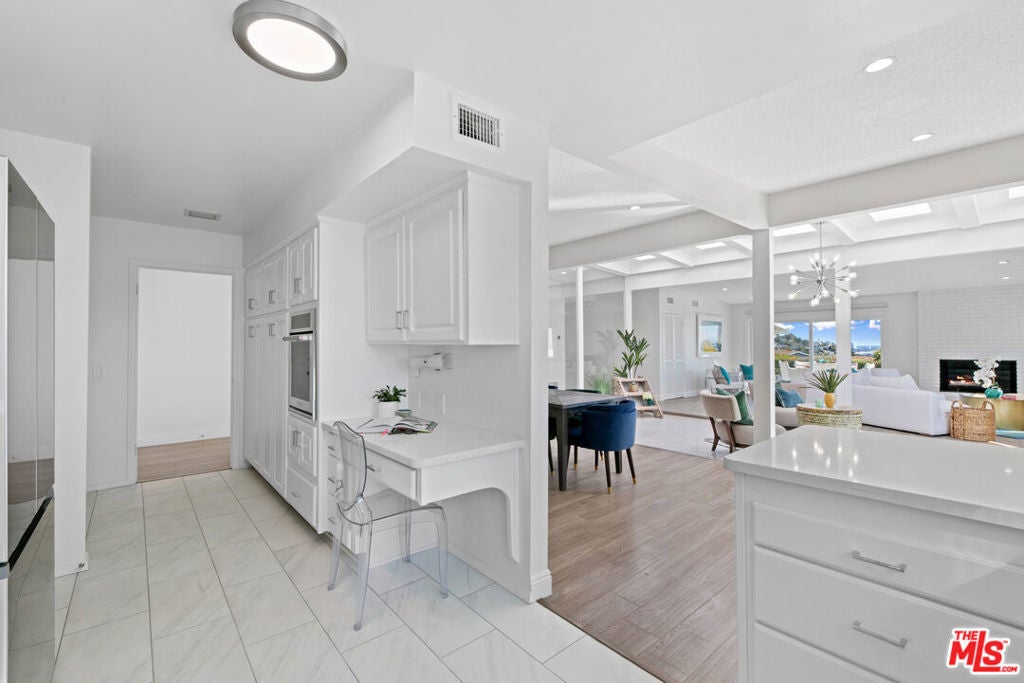 Fantastic, mid century home with open floor plan and ocean views that wrap around from the kitchen, dining living room, and primary bedroom. Great indoor outdoor flow with many rooms opening to multiple patios. There is an entertaining patio with ocean views off of the living room and primary suite as well as another semi enclosed patio area off of one of the secondary bedrooms. The sun-filled single level home has 3 bedrooms, 2 baths, and is thoughtfully planned with a separate secondary bedroom hall and primary suite hall. The ensuite primary takes advantage of the ocean views through large sliding doors that lead to a patio, there is also a generous bathroom with double vanity and a large walk-in closet. Kitchen has new quartz counters, fridge and oven, dishwasher, breakfast bar and desk. Sunset Mesa is set on the bluff above PCH, enjoy all Malibu has to offer with close proximity to beaches, the Getty Center, shopping, Malibu Pier, Nobu, Soho house, while also being conveniently close to Santa Monica and the Westside. Home is unfurnished, photos reflect how the home was previously furnished. Tenant pays for all utilities. Housing provider pays for the gardener. Renters insurance required.