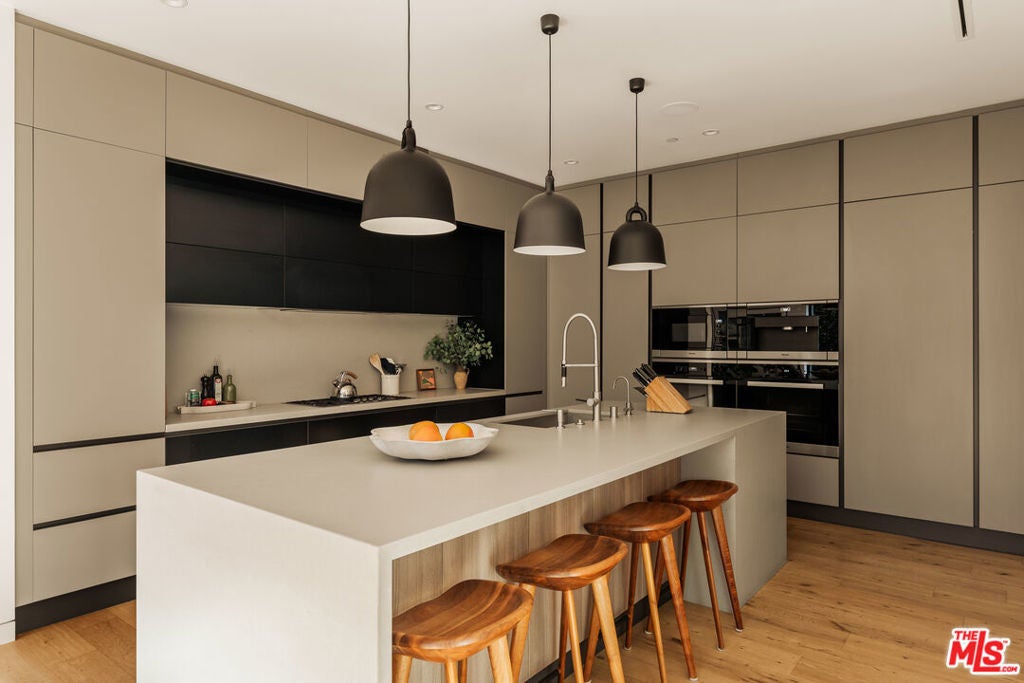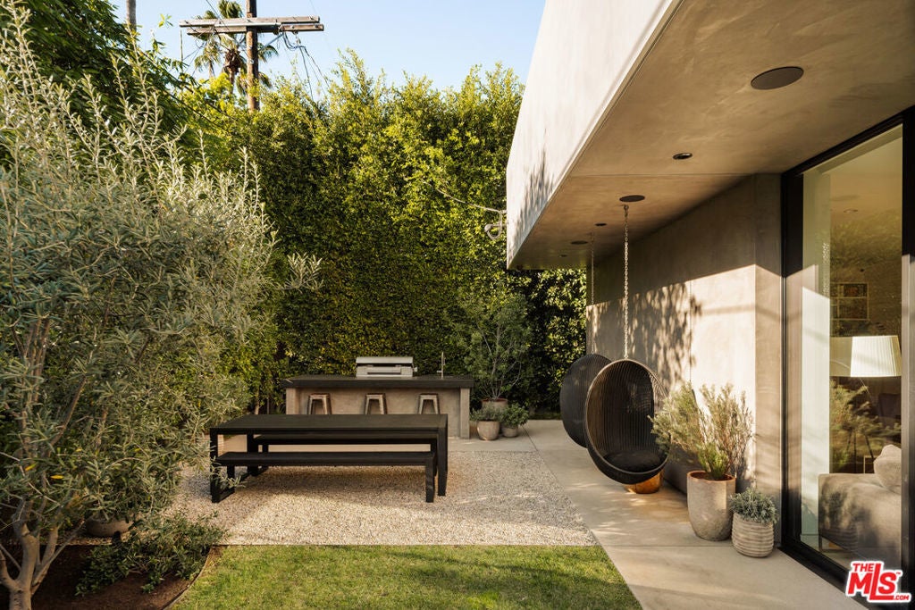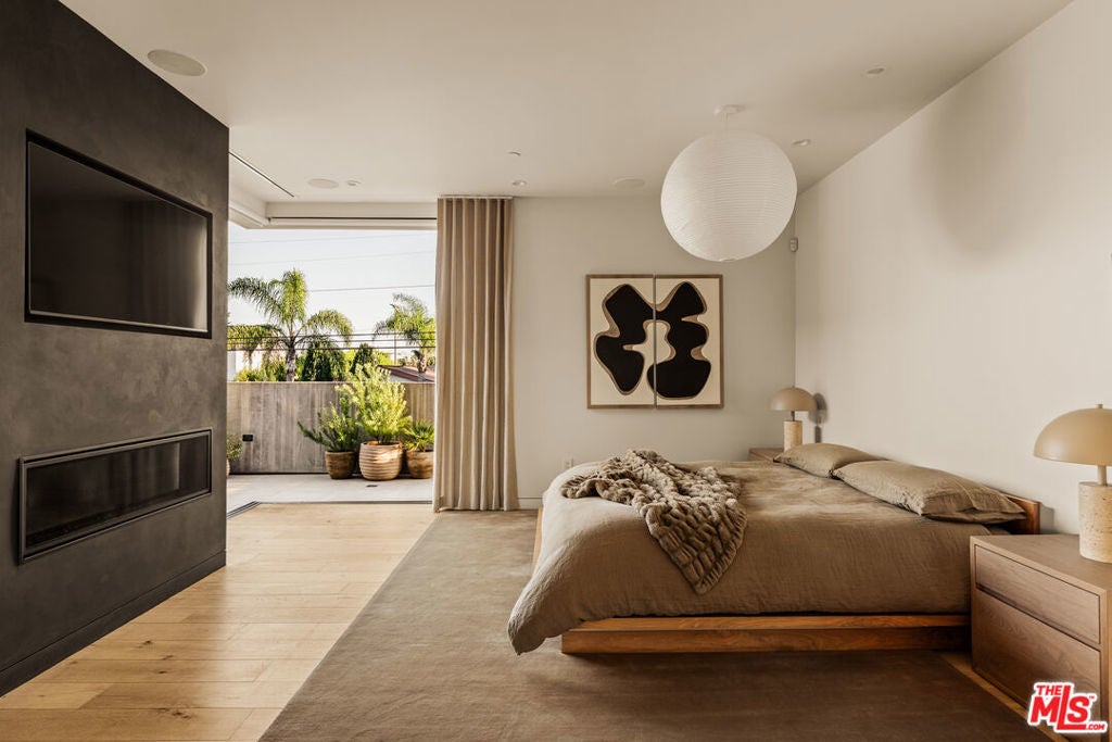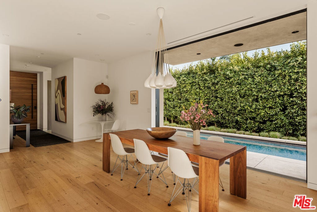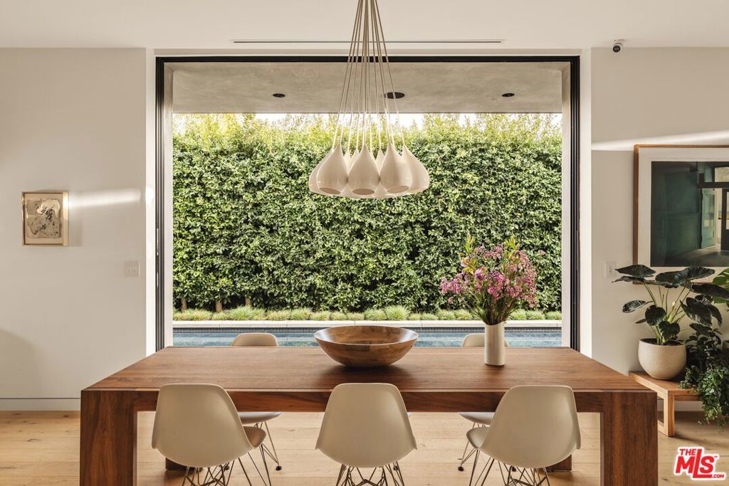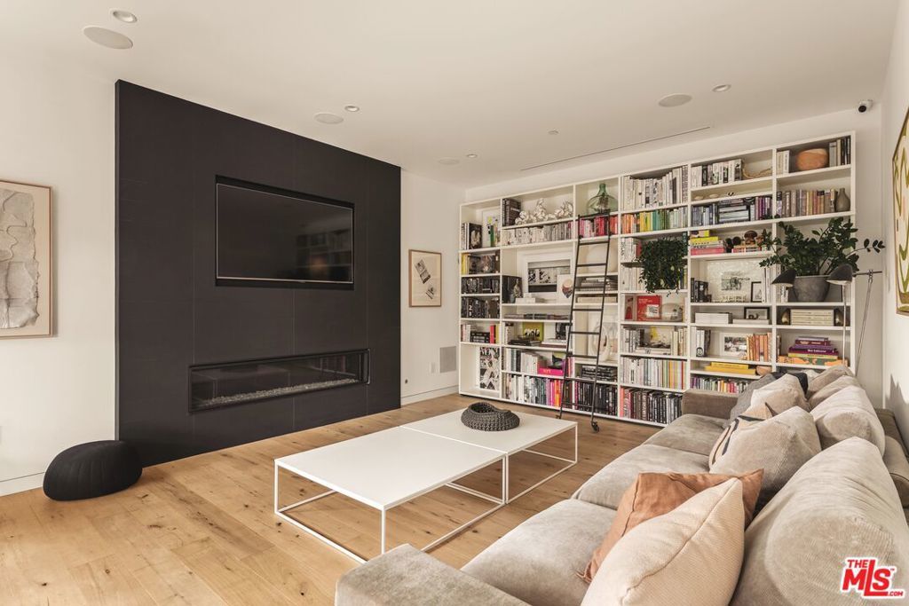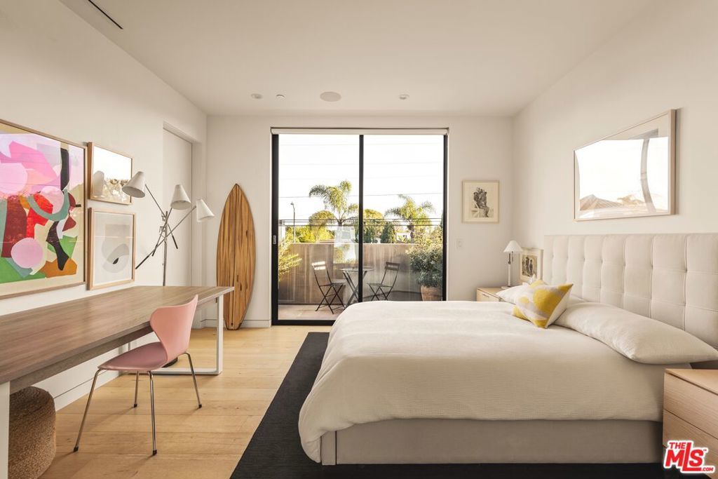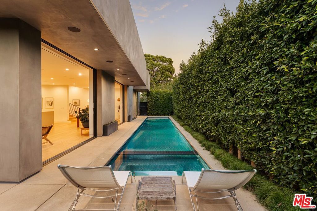 A refined expression of contemporary California architecture, this striking Venice residence has been thoughtfully enhanced and remodeled since its 2018 construction, elevating both its design integrity and livability. The sculptural facade opens to interiors defined by volume, light, and seamless spatial flow. Floor-to-ceiling Fleetwood pocket doors dissolve the boundary between indoors and out, allowing natural light to animate the home throughout the day. The open living and dining spaces unfold around a chef's kitchen appointed with premium Miele appliances, custom Italian cabinetry, and carefully curated materials that balance warmth with modern precision. The living space is punctuated by a wall of custom Porro bookshelves, with a rolling library ladder, offering a streamlined aesthetic and bespoke functionality for book enthusiasts and art collectors alike. Upstairs, three bedroom suites offer privacy and comfort, including a dramatic primary retreat that opens to a private terrace. The Roman clay finished fireplace, generous walk-in closet, and spa-inspired bath complete the suite, creating a true sanctuary within the home. Outdoor living is equally compelling. The backyard features a striking 54-foot saltwater lap pool and spa framed by lounge areas designed for both quiet afternoons and vibrant entertaining. An outdoor kitchen and dining pavilion extend the living experience into the landscape, creating an effortless rhythm between architecture and environment. Above it all, a rooftop deck captures sunset skies and ocean breezes, offering an elevated setting for evening gatherings. Gated and private with a two-car garage and additional off-street parking, the home is ideally located just moments from Abbot Kinney's renowned dining and boutiques, the beach, and neighborhood amenities including Penmar Park and golf course.