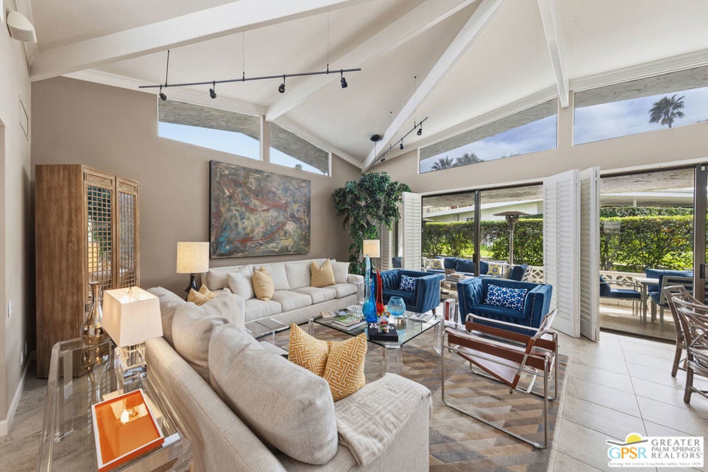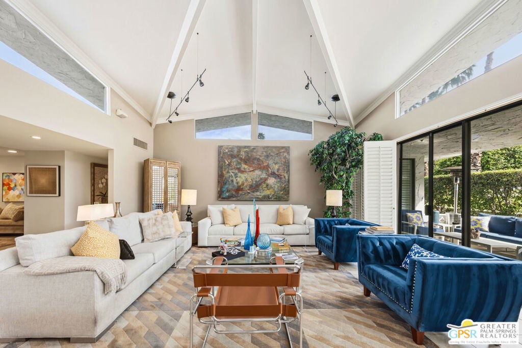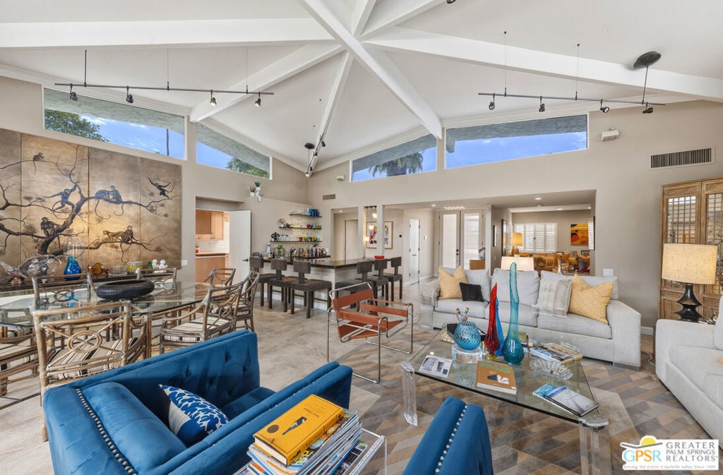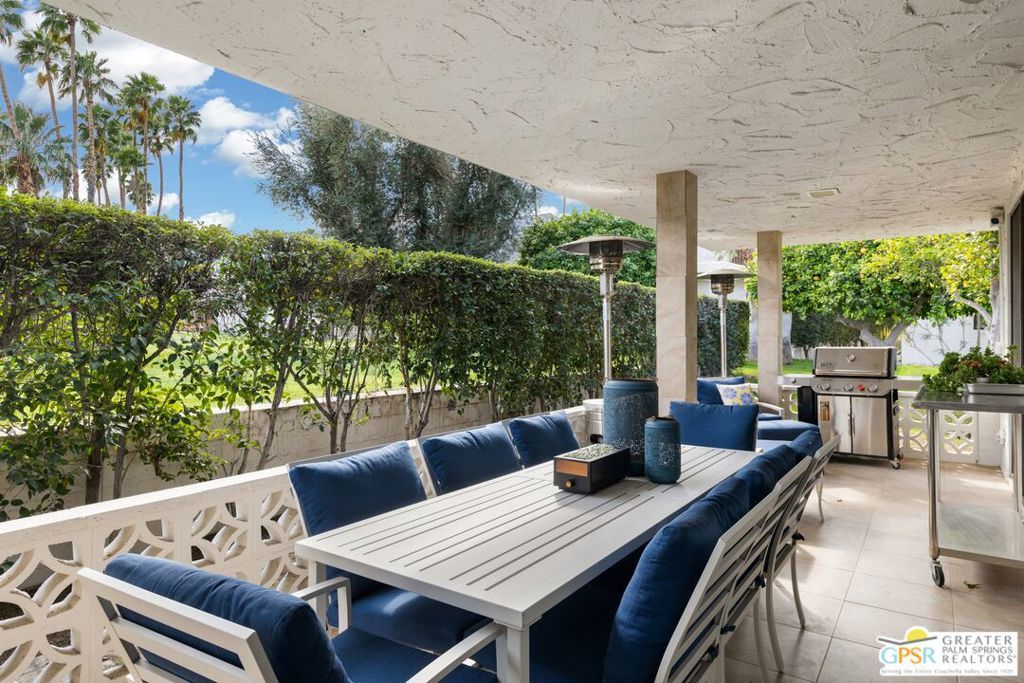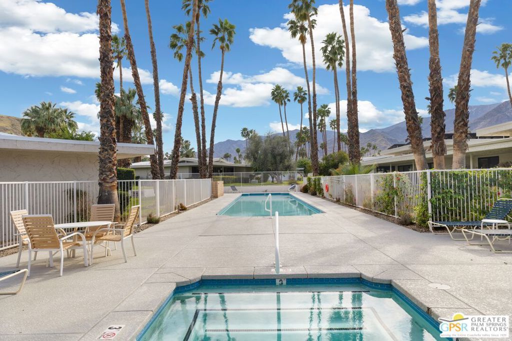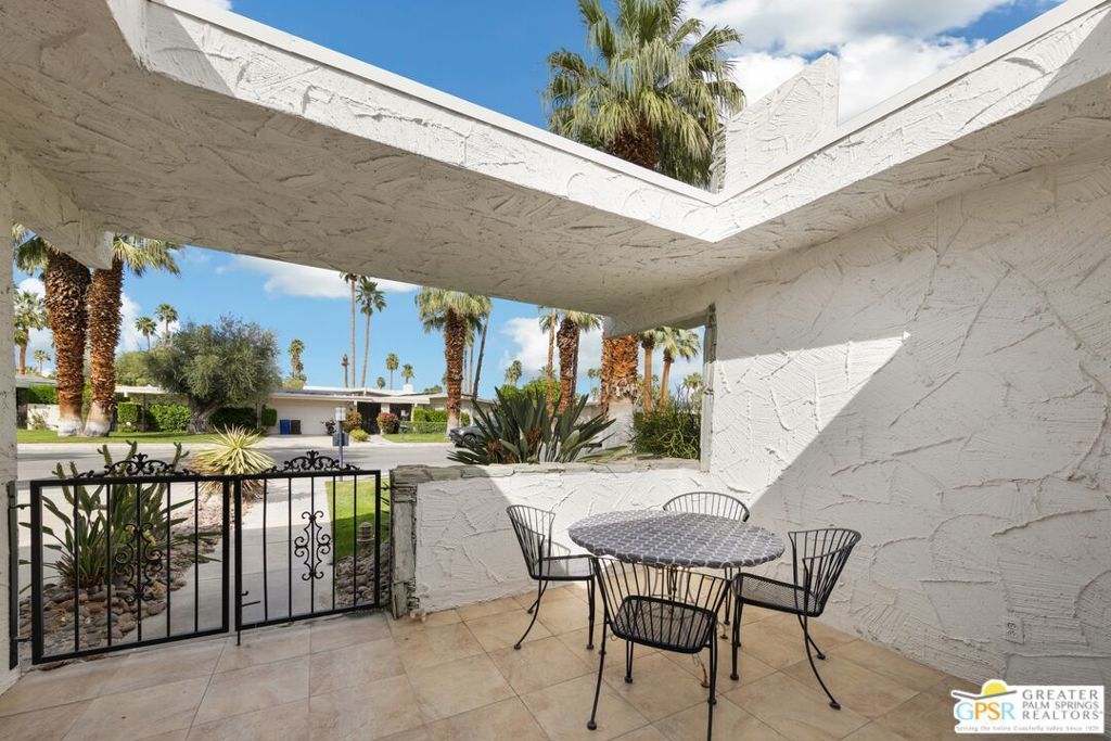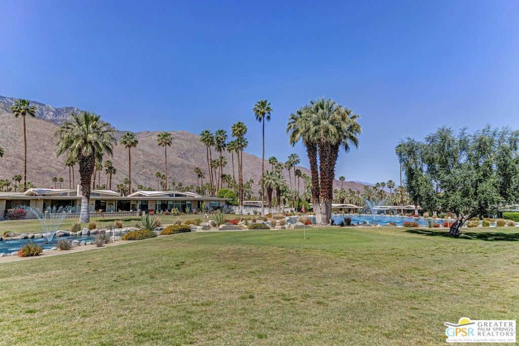 Mid-Century gem in the prestigious community of Canyon Estates, designed by Architect, Charles Du Bois. This 2600 Sq Ft detached condominium is a rare find in Palm Springs. Elegant clean lines, vaulted ceilings, generous light filled rooms, and clearstory floor to ceiling windows with mountain views make this cheerful home the perfect desert getaway.Beautiful details throughout include, ceramic tile flooring, plantation shutters, custom lighting, granite bar, built-ins, laundry area, finished two car garage and a covered patio that joins to all the main living areas. Large master suite features a walk-in closet, dressing area, and full master bath with a soaking tub, and shower. Two other guest bedrooms, one with en-suite bathroom and one is transformed into a den.Must see this wonderfully charming lifestyle home, amazing amenities included with the HOA fee include, Cable TV, Internet, Earthquake Insurance, ground maintenance, 9-hole, par-3 golf course, 15 community swimming pools, 12 spas, two championship tennis courts, pickleball courts, pool table, and a fitness center.