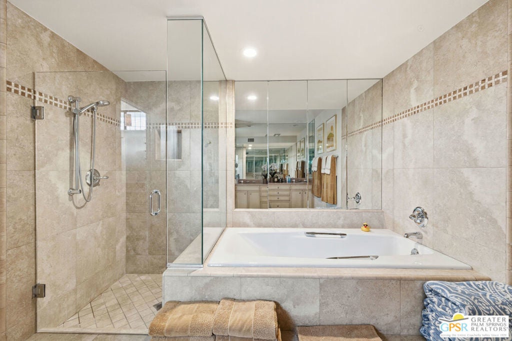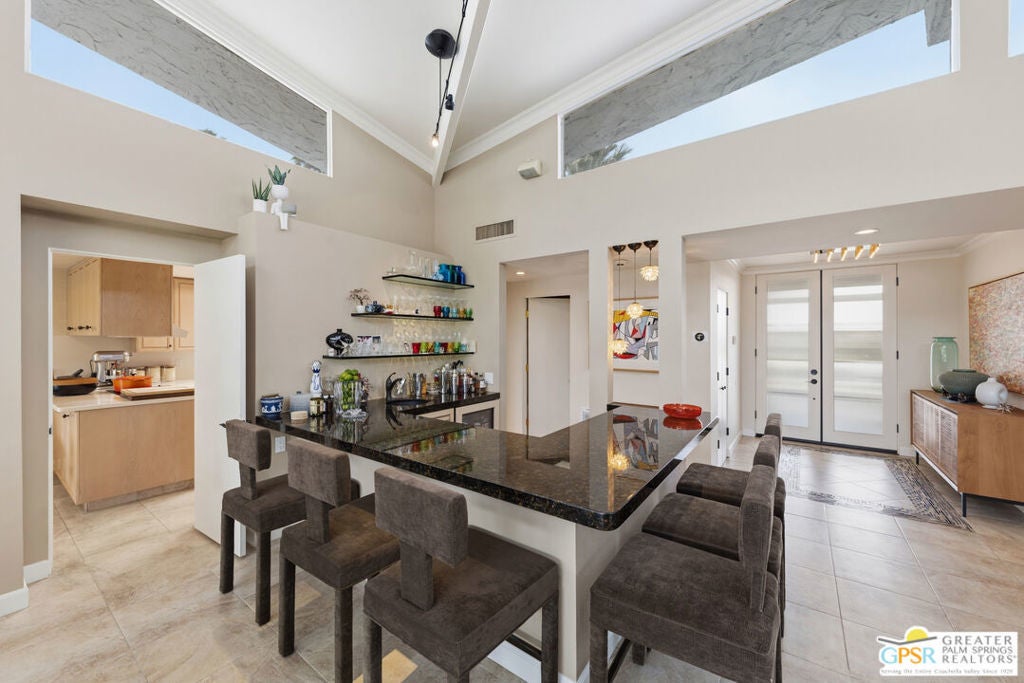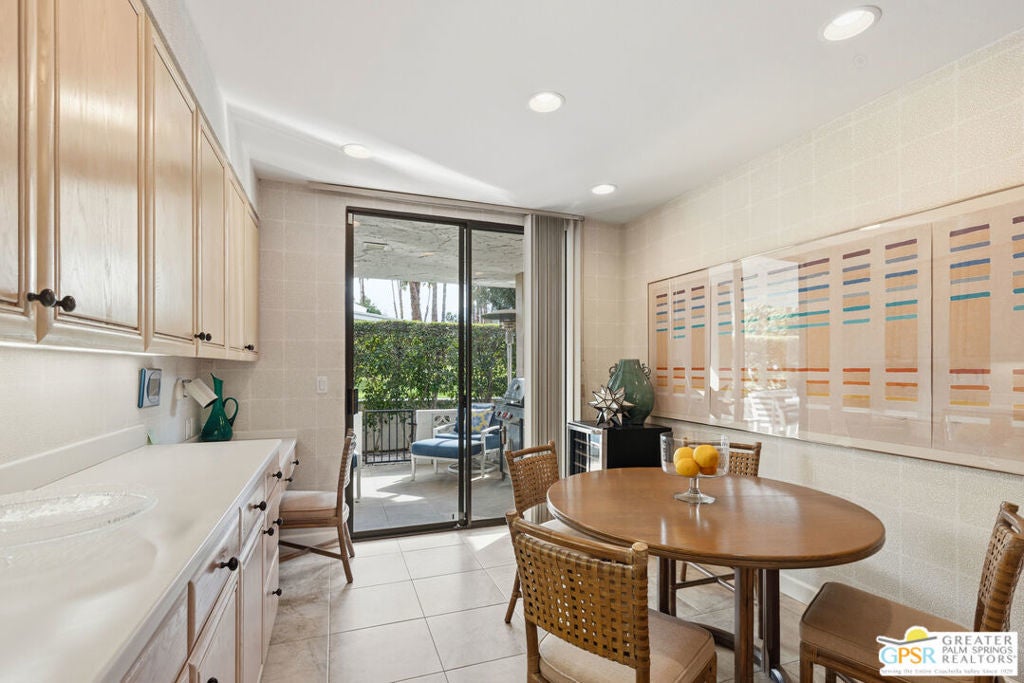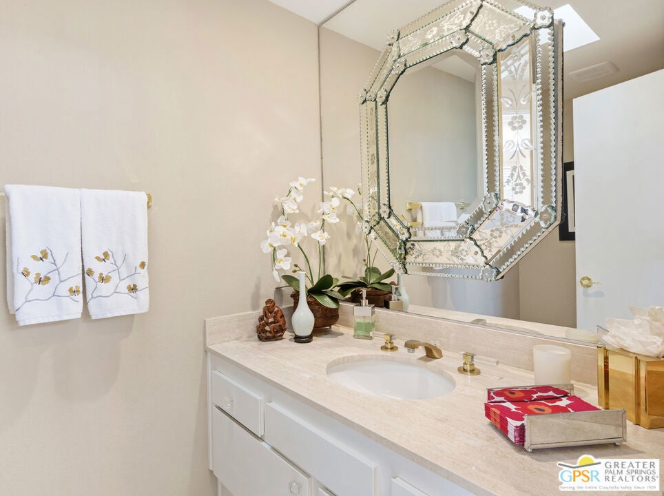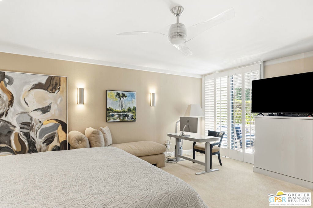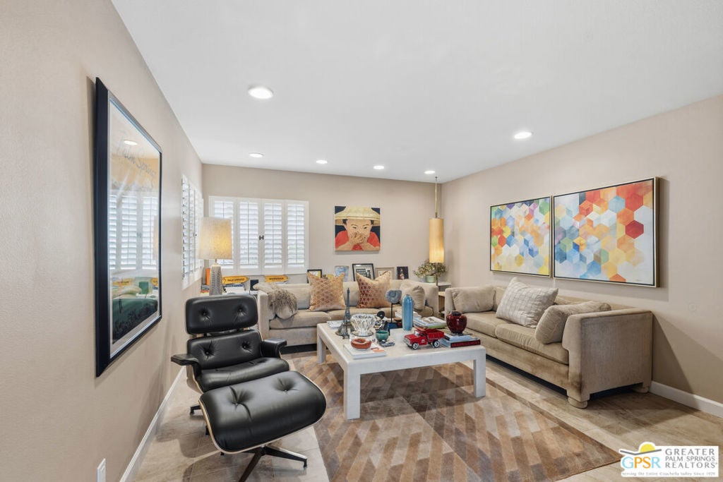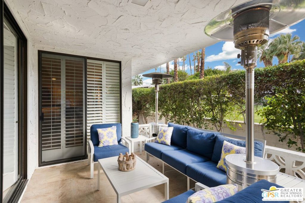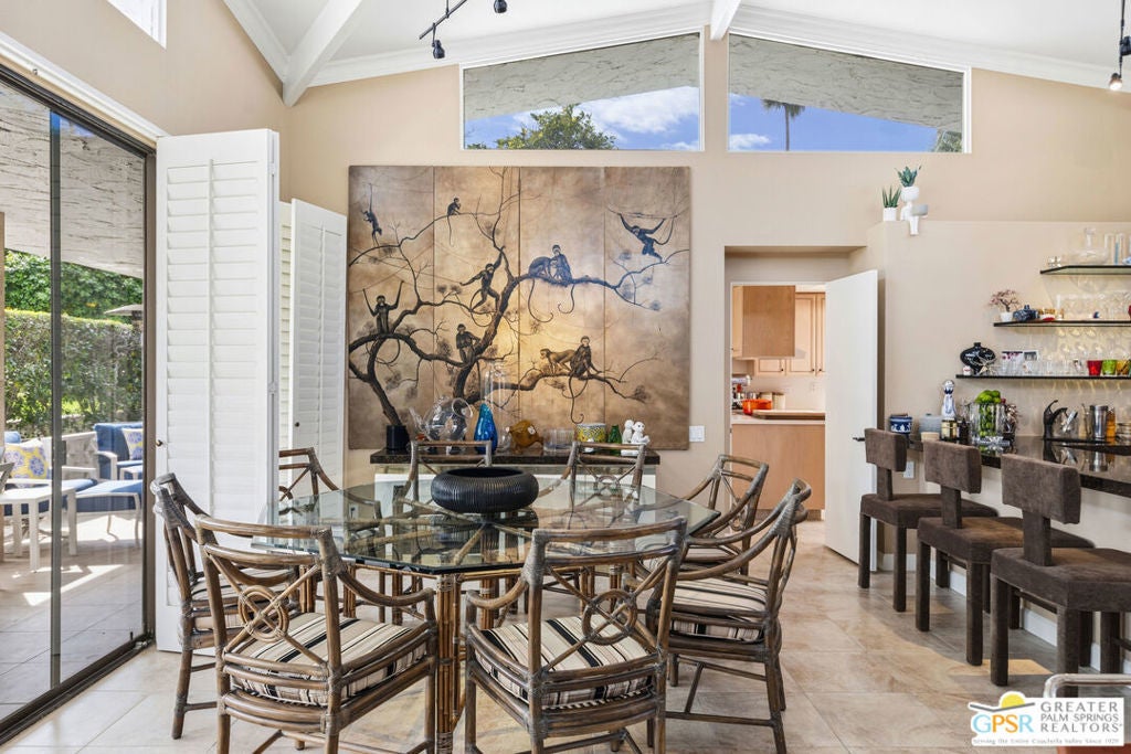 Mid-Century gem in the prestigious community of Canyon Estates, designed by Architect, Charles Du Bois. This 2600 Sq Ft detached condominium is a rare find in Palm Springs. Elegant clean lines, vaulted ceilings, generous light filled rooms, and clearstory floor to ceiling windows with mountain views make this cheerful home the perfect desert getaway.Beautiful details throughout include, ceramic tile flooring, plantation shutters, custom lighting, granite bar, built-ins, laundry area, finished two car garage and a covered patio that joins to all the main living areas. Large master suite features a walk-in closet, dressing area, and full master bath with a soaking tub, and shower. Two other guest bedrooms, one with en-suite bathroom and one is transformed into a den.Must see this wonderfully charming lifestyle home, amazing amenities included with the HOA fee include, Cable TV, Internet, Earthquake Insurance, ground maintenance, 9-hole, par-3 golf course, 15 community swimming pools, 12 spas, two championship tennis courts, pickleball courts, pool table, and a fitness center.