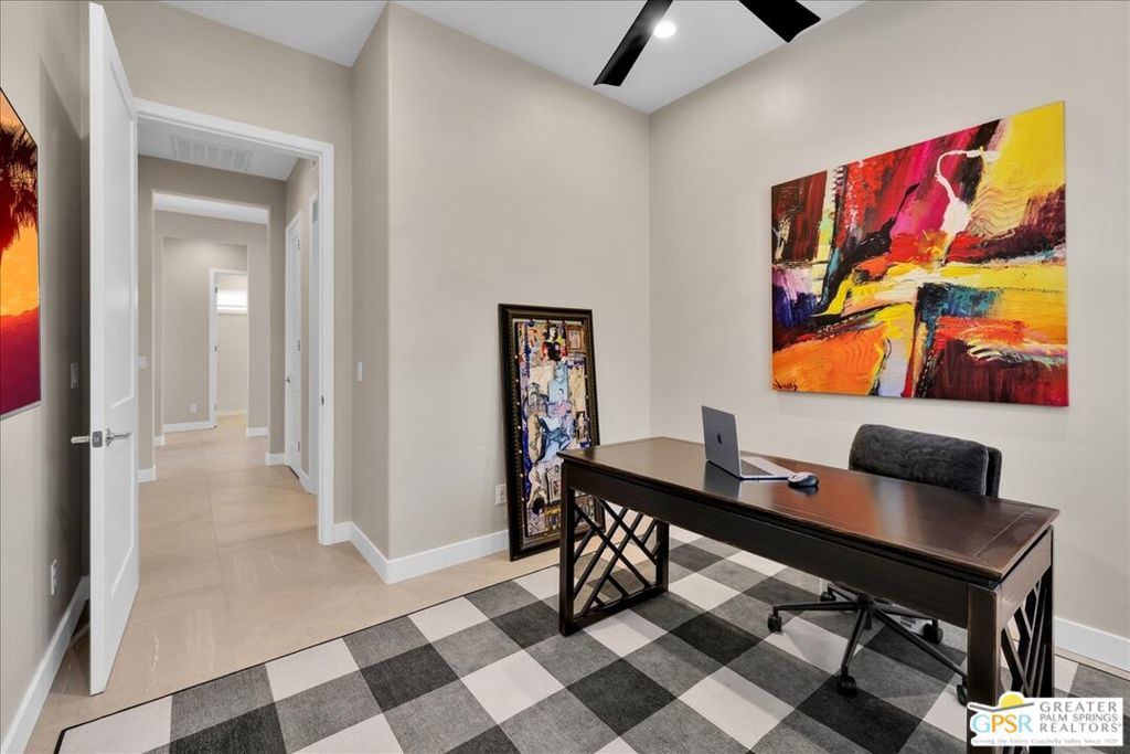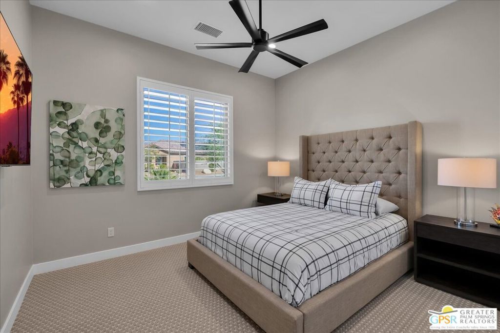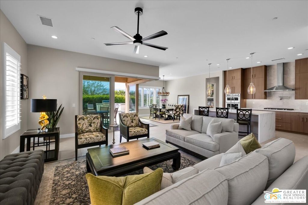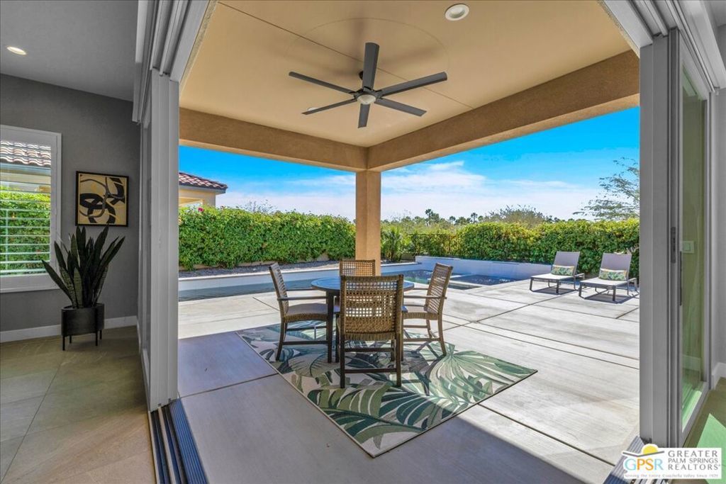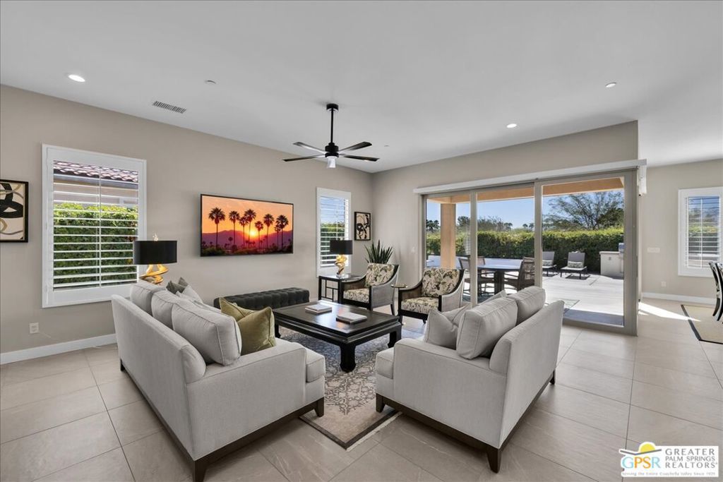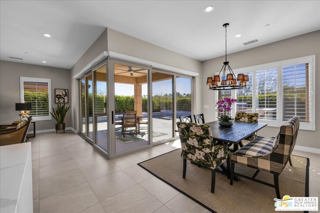 Resort-Style Sanctuary with 40-Ft Pool & Spectacular Mountain Views! Experience elevated desert living in this beautifully upgraded Phase 2, Plan 4 Sanctuary floorplan with a classic Tuscan facade, ideally positioned to capture breathtaking mountain views. This exceptional residence showcases a magnificent 40-FOOT POOL AND SPA, creating a true private resort setting within the prestigious 55+ community of Del Webb Rancho Mirage. Inside, the home is rich with thoughtful upgrades, including 24-INCH PORCELAIN TILE FLOORING, 4-inch baseboards, custom window treatments, and designer ceiling fans, creating a sophisticated yet comfortable atmosphere throughout. The stunning chef's kitchen has been recently reimagined with custom modern floor-to-ceiling soft-close cabinetry, contemporary hardware and fixtures, and elegant matte-finish quartz countertops. A premium KITCHENAID PROFESSIONAL SERIES APPLIANCE SUITE, complete with pot filler, enhances both form and function. At the center of the space, a dramatic island with waterfall edges, hidden storage, and pendant lighting offers generous seating and makes the perfect gathering place for entertaining. The open-concept design flows seamlessly into the dining and living areas, where the highly coveted six-panel corner sliding glass door system creates an extraordinary indoor-outdoor connection when fully opened - perfectly embracing the quintessential desert lifestyle. The primary suite enjoys serene mountain views through an upgraded sliding glass door and offers a spa-inspired ensuite bath with recently updated modern soft-close cabinetry, contemporary fixtures, a spacious stall shower with bench seating, and a large walk-in closet. Step outside to a beautifully landscaped backyard retreat where the impressive 40-foot pool and spa take center stage. A built-in gas BBQ and cooktop create the ideal outdoor entertaining space, all set against a dramatic mountain backdrop. The guest bedroom is thoughtfully located on the opposite side of the home for maximum privacy and enjoys access to a recently updated secondary bath featuring a glass-enclosed stall shower and modern cabinetry with updated hardware. A versatile den/flex space, positioned near the guest wing, includes a privacy door, LED lighting, and enhanced power and cable management for a wall-mounted television - making it ideal as a media room, office, or creative space. Additional highlights include OWNED SOLAR, a WHOLE-HOME WATER SOFTENING SYSTEM, upgraded doors for enhanced sound absorption, and EV pre-wiring in the garage. Residents of Del Webb Rancho Mirage enjoy an unparalleled lifestyle with access to a spectacular clubhouse, state-of-the-art fitness center, resort-style pool and spa, tennis and pickleball courts, and a vibrant calendar of social events and activities. The HOA now also includes cable and internet service. A true desert sanctuary combining luxury design, resort-style amenities, and unforgettable mountain views.