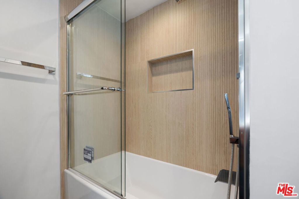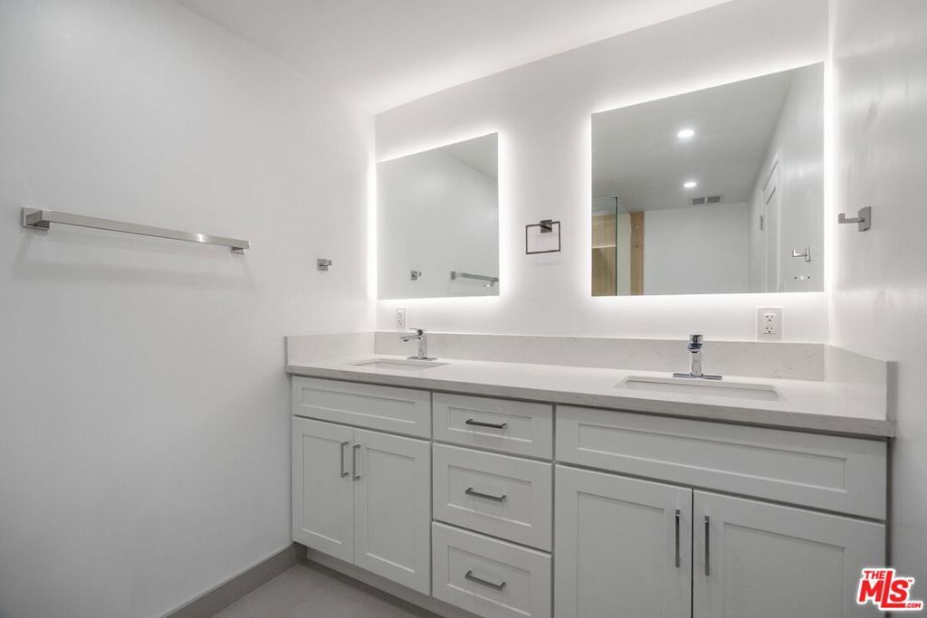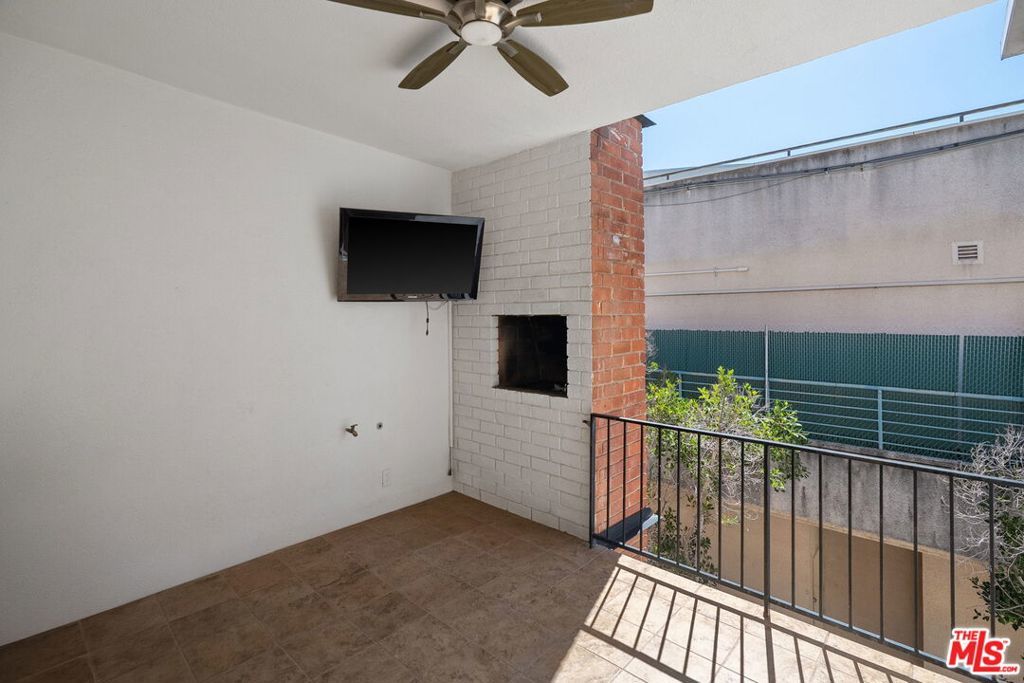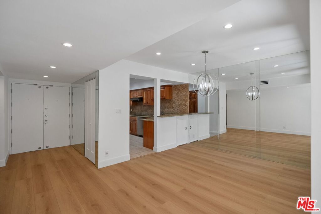 Welcome home to one of Encino's most distinctive condo addresses. This recently renovated 3-bedroom, 2-bath residence at the iconic Woodley building delivers a living experience that is rare in the condo market, combining refined interiors, spa-quality finishes, and a private outdoor terrace, all on the top floor with no neighbor above. Step inside to find wide-plank blonde hardwood floors flowing throughout a sun-drenched open floor plan. The living and dining areas make an immediate impression: a full-wall mirrored panel doubles the sense of space, while an orbital globe chandelier adds effortless elegance. Sliding glass doors connect the living room seamlessly to your private covered patio, a true outdoor living room complete with a wall-mounted TV and ceiling fan, perfect for California indoor-outdoor living. The kitchen features rich raised-panel cabinetry, granite countertops, a diamond-pattern stone tile backsplash, and stainless steel appliances, including a French door refrigerator and dishwasher. A peninsula bar opens to the dining area, ideal for entertaining. A wet bar with a beverage refrigerator is tucked into the living space, adding a convenient hospitality touch. The primary suite is a retreat unto itself, with a spa bathroom showcasing dual backlit LED vanity mirrors, quartz countertops, white shaker cabinetry, and a frameless glass walk-in shower wrapped in floor-to-ceiling wood-look tile with a rain head fixture and built-in niche. The second bath continues the theme with a tub/shower combo, glass sliding doors, and a rain shower. The third bedroom offers exceptional versatility as a home office, guest suite, or creative space. Residents enjoy one of the best lobbies in the Encino condo market: elegant designs, terrazzo floors, and a welcoming lounge area that creates a genuine sense of arrival. The secured garage features gated key-access entry with elevator, and includes two separate assigned parking spaces, one on each side of the drive aisle, and four guest parking spaces, offering privacy and ease of access. Top-floor living, refined finishes, and a private outdoor retreat. This is Encino condo living elevated. Schedule your private showing today.
