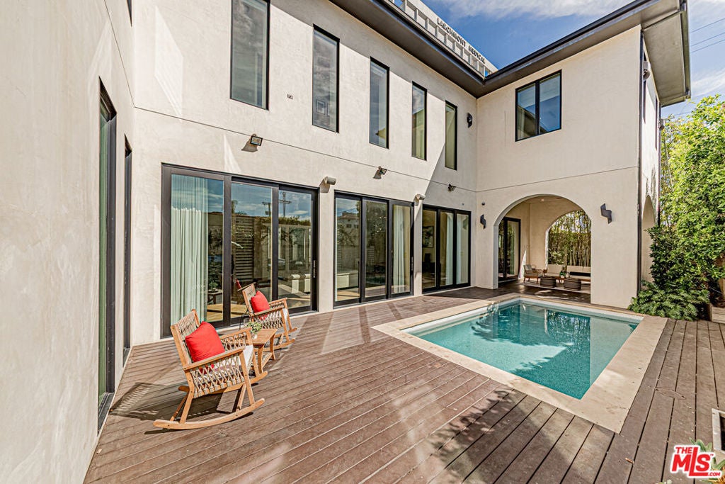 310 N. Lucerne Boulevard presents a rare opportunity to own a beautifully crafted contemporary residence in the highly desirable Hancock Park/Larchmont Village neighborhood. Blending modern architecture with subtle Mediterranean-inspired details, this home offers both elegance and warmth in one of Central Los Angeles' most sought-after locations. Upon entry, soaring ceilings and expansive windows fill the home with natural light, creating an inviting and airy atmosphere. The thoughtfully designed open-concept living and dining areas are anchored by a refined fireplace and seamlessly connect to the outdoor living spaces through multiple glass doors, allowing for effortless indooroutdoor entertaining. At the heart of the home is a sophisticated chef's kitchen featuring an oversized island, custom cabinetry, built-in refrigerator, wine cooler, and elegant light wood finishes. Large windows frame the surrounding tree-lined neighborhood while enhancing the bright and open feel throughout the home. The upper level offers four generously sized bedroom suites along with a dedicated laundry area, providing comfort, privacy, and functional living space. Designed for both relaxation and entertaining, the private backyard features a sparkling pool surrounded by a wood deck, built-in BBQ, covered patio for outdoor dining, and beautifully manicured landscapingcreating a tranquil retreat in the city. Situated on a picturesque tree-lined street just moments from Larchmont Village, this home offers convenient access to renowned restaurants, boutique shops, The Grove, LACMA, and many of Los Angeles' most iconic destinations.