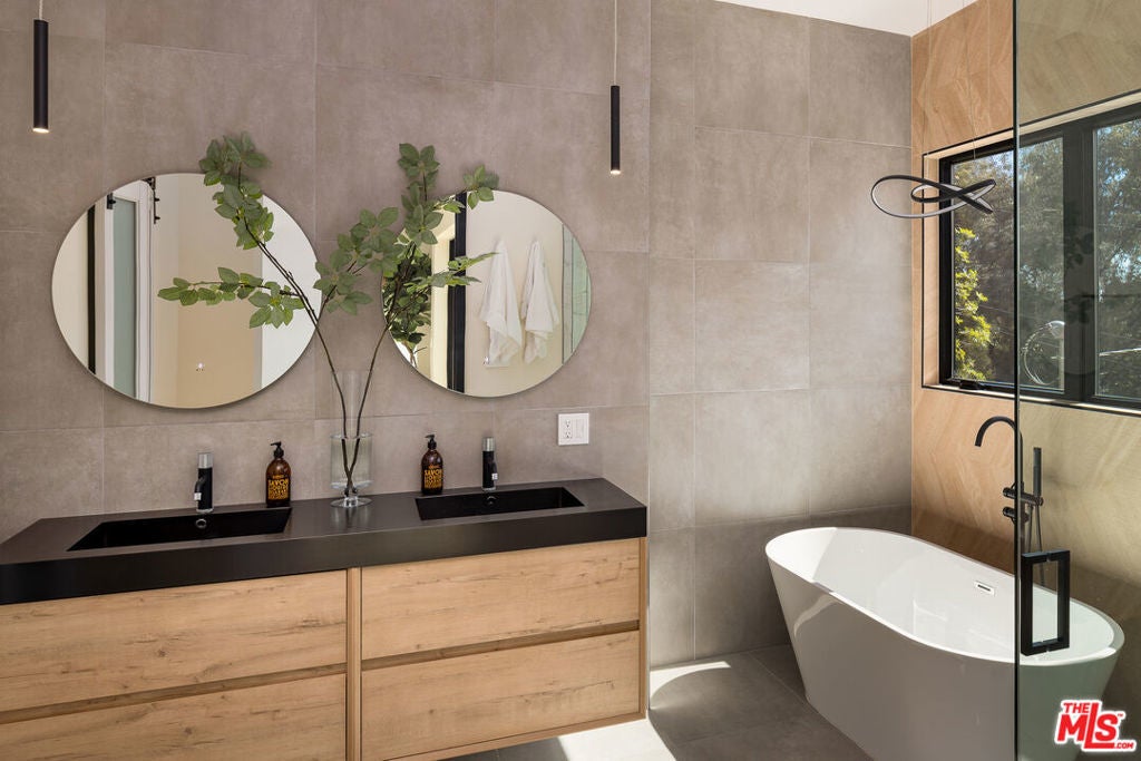 Brand new hillside construction in Mount Washington, located within the coveted Mount Washington School District. Clean lines, big views, and three levels of modern living done right. Perched above the street, this newly built 2,635-square-foot architectural residence makes an immediate impression. A sculptural staircase sets the tone upon entry, while a solid mahogany front door frames a striking indoor fireplace that anchors the living space. Milgard sliding glass doors open wide onto a tiled terrace, blurring the line between indoor and outdoor living and creating an effortless setting for entertaining, set against a backdrop of rolling hills. The kitchen and dining areas flow together over wide plank white oak floors. At the center is a chef's kitchen featuring dramatic Italian porcelain slab surfaces, a generous island for gathering, and a professional-grade Thermador appliance suite designed for both performance and style. A discreet powder room completes the main level. Upstairs are two secondary bedrooms and a full bath, along with a serene primary suite featuring a private balcony, walk-in closet, and a spa-like bathroom with a freestanding soaking tub, floating oak vanity, and large-format porcelain tile. Above it all, a sweeping rooftop deck wraps from the side of the home to the front approach, capturing layered views of hillside architecture, mature trees, and the distinctive terrain that defines Mount Washington. Wrapped in smooth stucco and modern composite cladding and thoughtfully set into the hillside, this home delivers architectural presence, privacy, and the indoor-outdoor lifestyle buyers are searching for in one of Northeast Los Angeles' most sought-after neighborhoods.