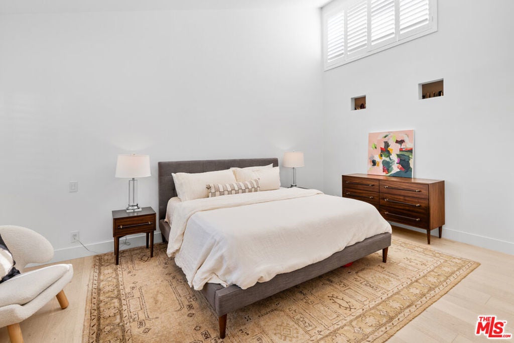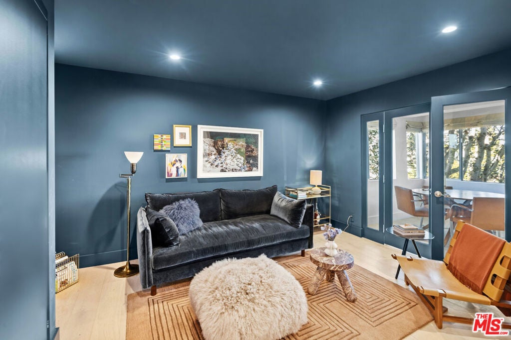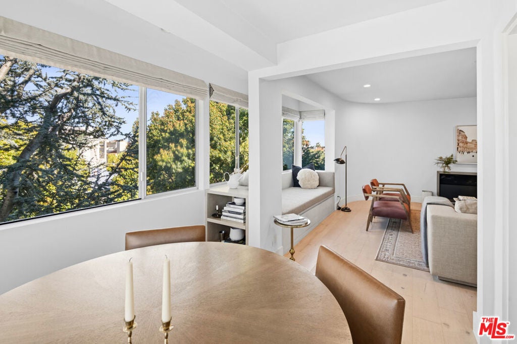 A rare, light-filled top-floor corner penthouse that lives like a London flat -- elevated, intimate, and quietly luxurious in Santa Monica's coveted Wilshire/Montana neighborhood. With multiple exposures and panoramic views of the Santa Monica Mountains, treetops, and cityscape, the home feels serene and cinematic from the moment you enter. Meticulously reimagined in a no-expense-spared renovation completed December 2021, this 3-bedroom, 3-bath residence offers approximately 1,612 sq. ft. of refined, design-forward living warm, modern, and timeless. The layout is open yet composed, created to let the light travel and the views take center stage. The living room is wrapped in new double-paned windows, framing the scenery like artwork, and anchored by a custom bay window with built-in bench seating -- an effortlessly chic spot for morning coffee, sunset light, or quiet conversation. Just beyond, the sunroom extends the living experience with an airy indoor-outdoor feel, ideal for reading, working, or entertaining while staying connected to the sky and treetops. The kitchen is tailored and architectural, thoughtfully reconfigured with Caesarstone countertops, custom whitewashed Spanish-oak cabinetry, and sleek integrated KitchenAid appliances concealed behind custom paneling for a clean, streamlined finish. An oversized dining island anchors the space for easy hosting and everyday gathering, while a mountain-view kitchen window adds a subtle daily delight. A versatile flex room with closet and private entry adapts beautifully as a third bedroom, den, office, fitness studio, or guest retreat is a rare optionality in a residence this polished. The primary suite is a true sanctuary of scale, featuring dramatic 20-foot ceilings, an oversized walk-in closet (including the original hidden floor safe), and a spa-like en-suite bath with Italian tile, dual vanities, a generous walk-in shower, and natural light streaming through original skylights. The second bedroom offers the same sense of volume with lofty ceilings, an en-suite bath, and a hidden, fully insulated storage loft with reinforced flooring. A third bath is elegantly executed as a refined wet room, with seamless waterproof cement walls that blend form and function.