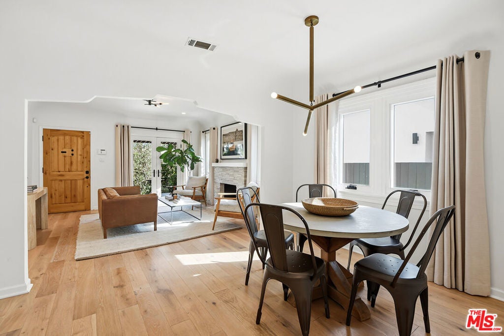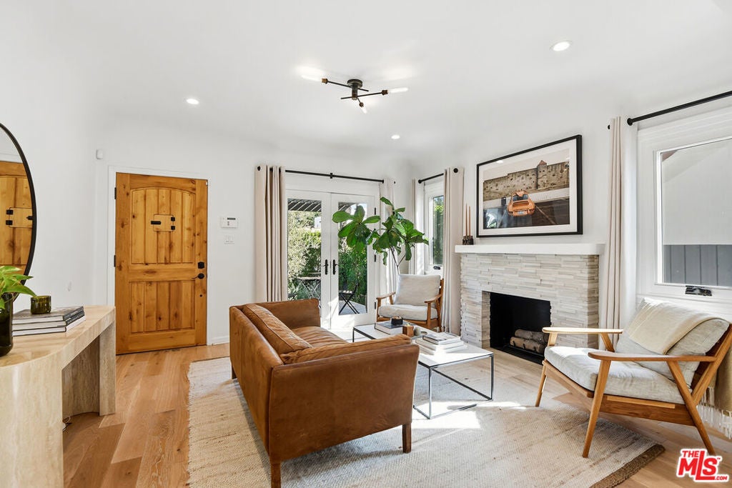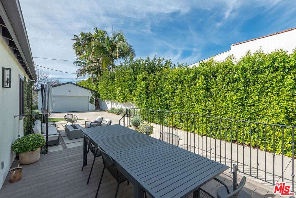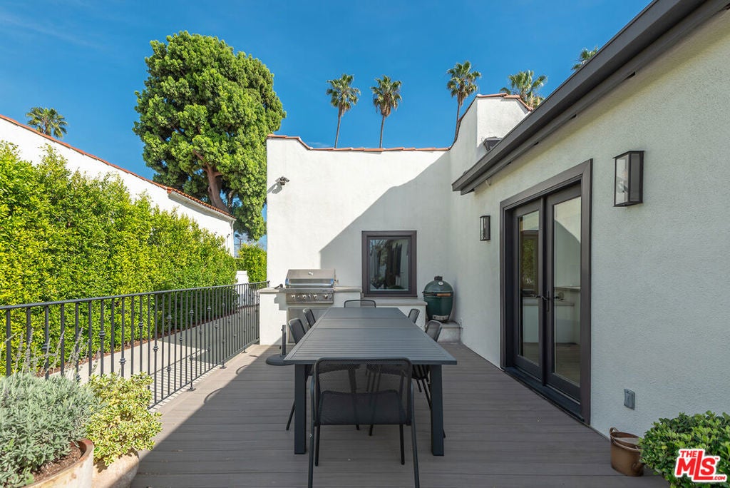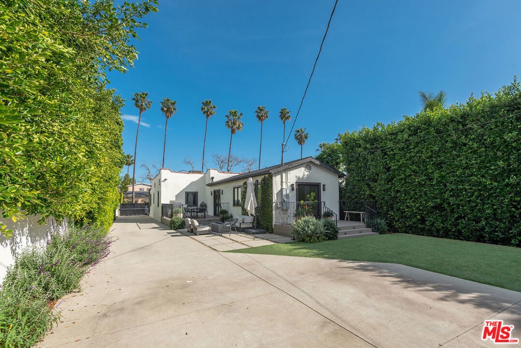 Charming, gated 3BR+2BA Spanish-style home, in the heart of Melrose Village. Filled with natural light and classic architectural character, the home features hardwood floors, recessed lighting throughout and a spacious living room that flows seamlessly into the dining area. The updated kitchen features stainless steel appliances including a Wolf oven, Subzero refrigerator, a wine fridge and generous cabinet and pantry storage. Family room is located off kitchen. Two private decks extend the living space outdoors, one off the family room and another off the primary bedroom, offering inviting spots to relax, dine or entertain. The home offers spacious bedrooms with ample closet space, including a primary suite featuring a walk-in closet and en-suite bathroom. Thoughtfully landscaped front and backyard spaces provide privacy with mature hedges and lush greenery. The expansive lot offers multiple outdoor areas to enjoy, including a vegetable garden, built-in BBQ and fire pit, perfect for outdoor dining and relaxed evenings. A detached two-car garage offers excellent potential for an ADU, studio or creative workspace. The property is secured with a new sliding driveway gate and pedestrian entry gate. Ideally located just moments from The Grove, Larchmont Village, Melrose shopping and some of the best dining and entertainment in Los Angeles.