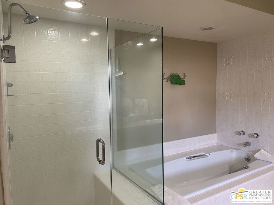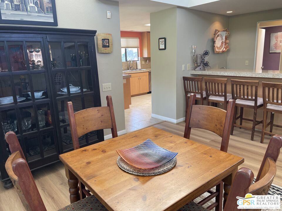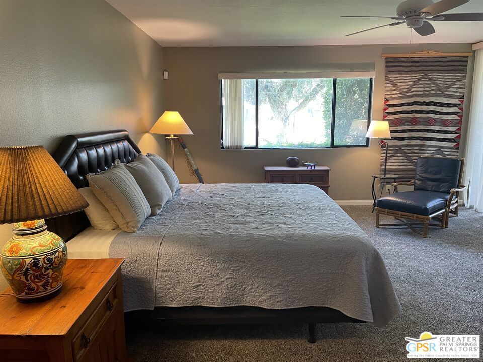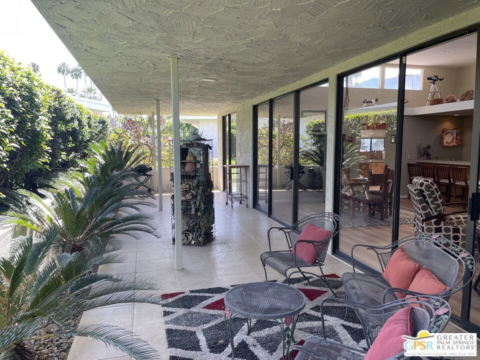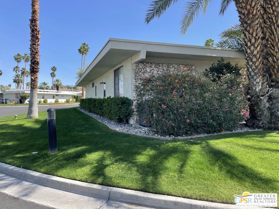 South Palm Springs mid-century gem designed by Charles Du Bois. This freestanding almost 2600 sq. ft. condominium feels like a single-family residence. The home features a primary bedroom suite with walk-in closet, a large second bedroom, and a converted third bedroom functioning as den and office space. A generous kitchen, built-in bar, clerestory windows, double front doors, and private patio with open glass doorways make for easy indoor/outdoor living and entertaining. Canyon Estates offers landscaped open green areas surrounding 15 pools and 12 spas. Recreational facilities include two tennis courts, a pickleball court, a 9-Hole Par-3 golf course, clubhouse, fitness center, library, and game room. Additionally, two ponds and spectacular mountain views highlight the beauty of this location.