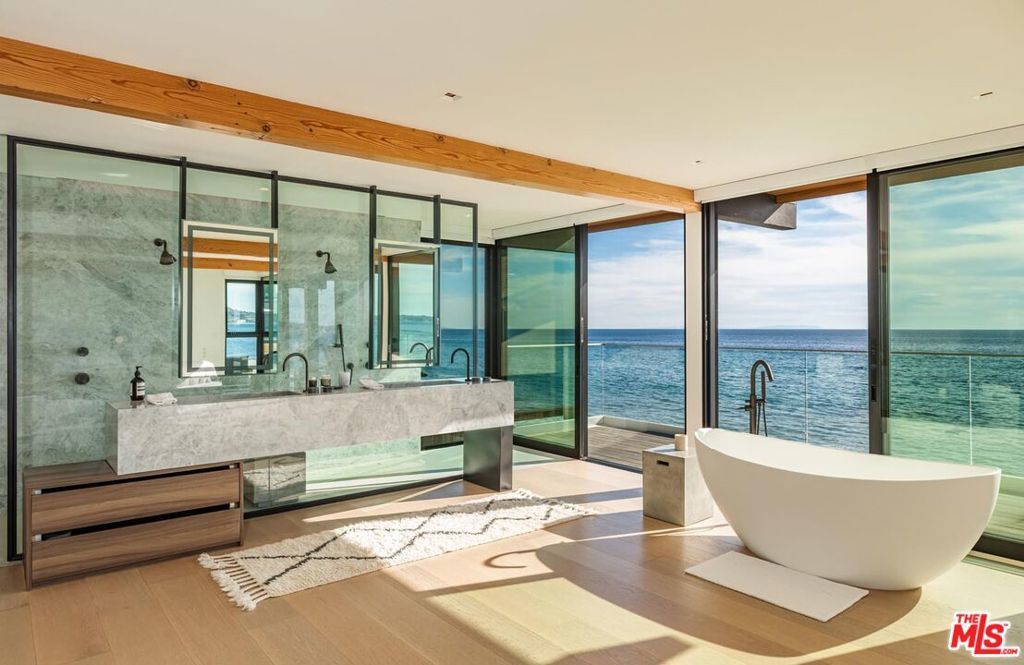 Fully remodeled in 2021, this oceanfront residence is set along a coveted sandy stretch of Malibu Road, offering the ultimate coastal lifestyle. Designed for effortless entertaining, the home is entered through a private courtyard into an expansive great room featuring a fireplace and a high-end chef's kitchen, all oriented toward sweeping ocean views. The entire second level is dedicated to the serene primary suite, complete with floor-to-ceiling sliders framing panoramic views from every angle - including the spa-like bath with a two-person shower and soaking tub. A secondary suite is conveniently located on the main level, ideal for guests. Additional highlights include a three-car garage and a generous driveway providing ample parking. Seller has fully permitted architectural plans to convert the downstairs suite into two bedrooms each with their own bathroom.
