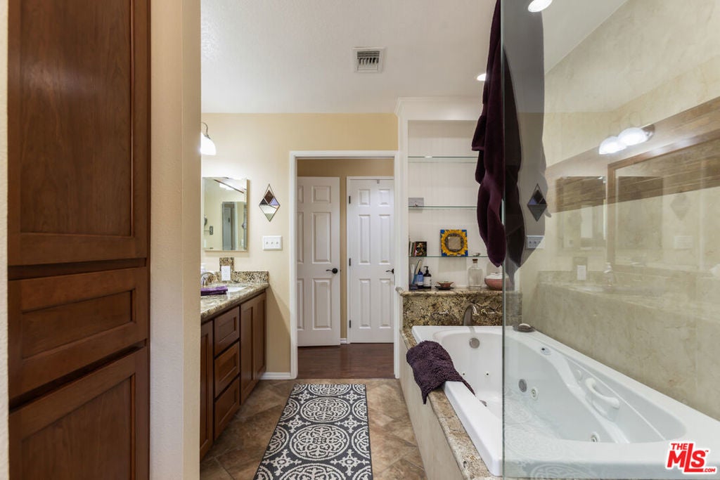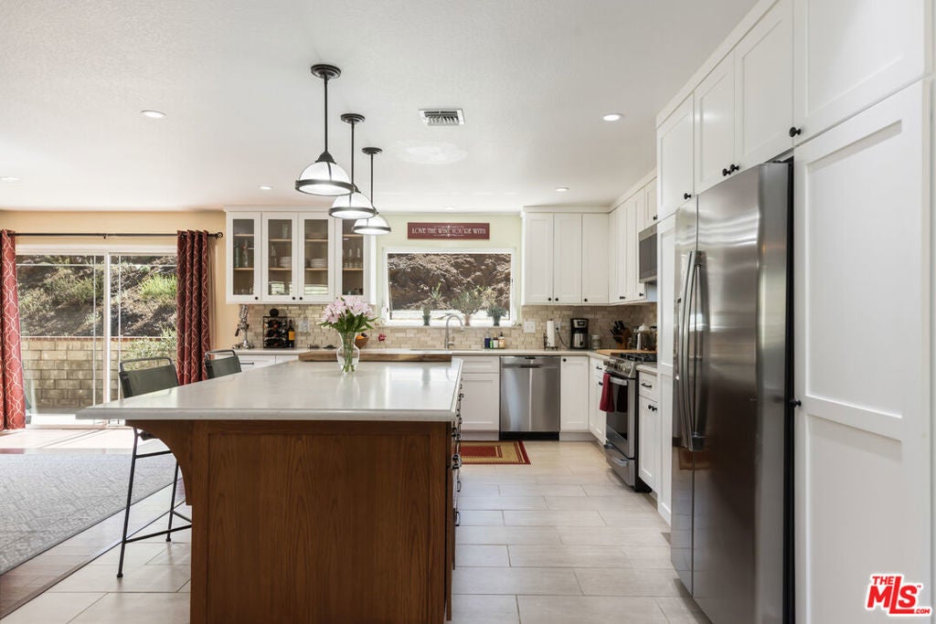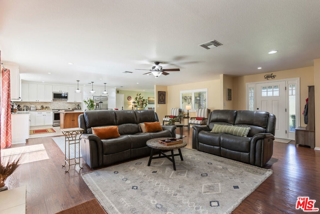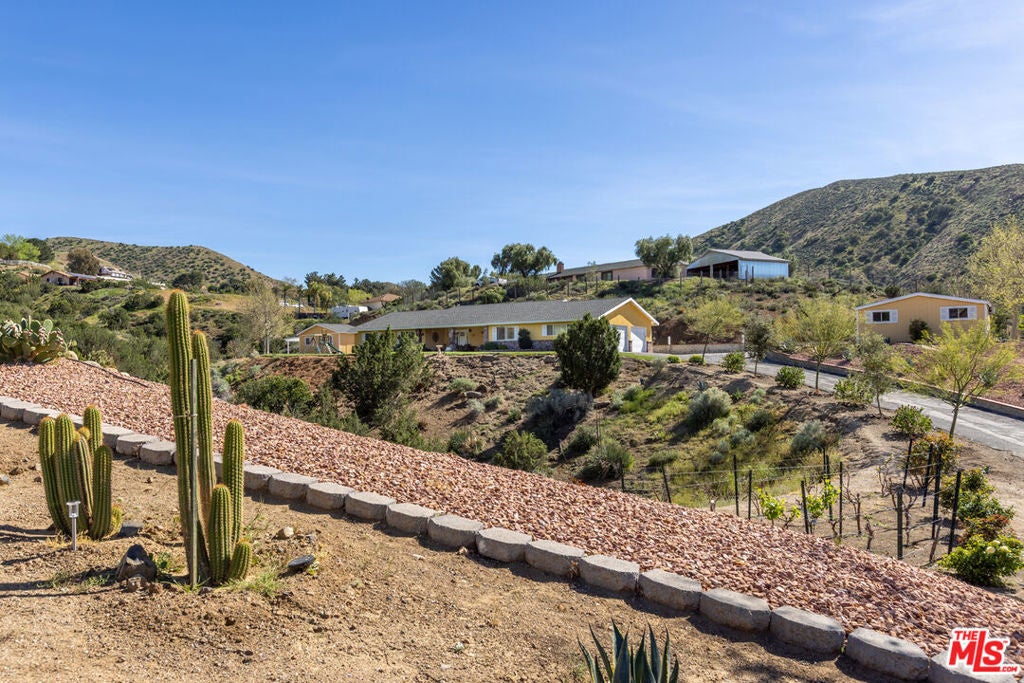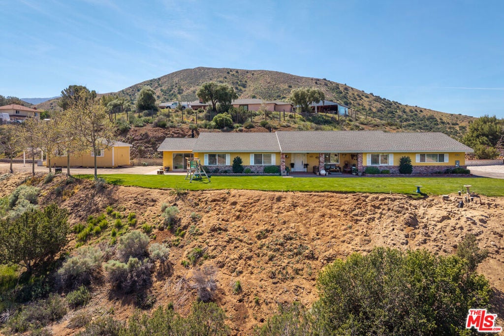 Get that peaceful easy feeling. Welcome to Acton living with plenty of space and stunning natural surroundings. This spectacular remodeled home sits on nearly two acres, tucked privately off its paved cul-de-sac street. The lush green lawn and charming brick pathway welcome you to your own oasis, complete with breathtaking canyon & mountain views. Solar lighting lines the driveway, creating an enchanting approach to this serene country retreat located in one of Acton's well-established & well-desired neighborhoods. Enter beneath the large, covered patio with lighting, ceiling fans, and heaters, perfect for relaxing day or night. Open the rain-glass embellished front door, into a grand great room where the eye is immediately drawn to the stunning stacked-stone fireplace and the gorgeous, totally remodeled kitchen. New Pergo laminate wood flooring flows throughout the home, enhancing the bright and open feel. The beautifully redesigned kitchen features quartz countertops, bright white cabinetry with soft-close drawers, new tile, new lighting, stainless steel appliances, and a large picture window that frames the outdoor scenery. A versatile bonus room just off the kitchen offers the perfect space for a formal dining room, office, playroom, or creative studio. Freshly painted, and truly move-in ready, the home offers four spacious bedrooms and three updated bathrooms, providing plenty of flexibility for family, guests, or work-from-home living. The remodeled primary suite feels like a private retreat with its own electric fireplace, double closets, and a sliding door that opens to its own brick patio with quiet views. The updated bathrooms feature granite countertops and shower/tub combinations, with one bathroom offering heated floors for added comfort. Outside, the meticulously landscaped grounds showcase mature trees, colorful annuals, and generous space for entertaining or simply enjoying the tranquility. The property also features RV parking with two sets of hookups, garage with its own workbench area, and bathroom with mud sink, multiple outbuildings for workshops or storage, and abundant outdoor parking. Additional highlights include city water, natural gas, underground utilities, septic system, water softener, and a 7.5 kW roof-mounted solar system (lease to be assumed or paid off in escrow). Classic Acton, "Of Course".