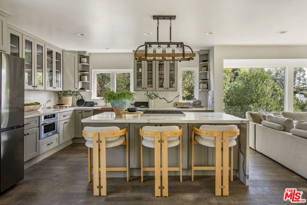 Perched in the lush section of the Hollywood Hills, this thoughtfully reimagined bungalow pairs timeless character with refined modern living. Expansive picture windows frame a tranquil, park-like canyon setting, filling the home with natural light and a quiet sense of privacy. Warm wood floors and a restrained contemporary palette create an atmosphere of sophistication. The thoughtfully designed kitchen features ample custom cabinetry, stone countertops, and premium stainless appliances. The primary suite serves as a peaceful retreat with a spa-inspired bath and serene private patio. The second bedroom also is equipped with its own living room/Den and a secluded outdoor patio, perfect for morning coffee and meditation. A versatile bonus room offers flexibility as a home office, creative studio, or potential third bedroom. The backyard terrace functions as a venue for entertaining guests or enjoying relaxed family barbecues beneath the trees. Just moments from the Hollywood Reservoir, The Hollywood Bowl, and incredible hiking and horseback riding trails, this residence delivers the rare balance of vibrant city access and the serenity of hillside living.