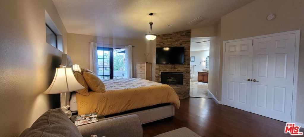 This spectacular fully furnished resort-style home is situated on a "large corner lot" in the desirable Starlight Dunes Gated Community. You will step into a beautiful open floor plan as you enter the main level through double lead glass doors. The living room, formal dining room, and family room have marble flooring and views of the resort-style saltwater pool and spa. The kitchen overlooks the family room and offers granite countertops and breakfast bar seating. The Extra Large Master Suite is located on the second level and offers a double door entry, two king-size beds, a lounge chair, an ottoman, a romantic stone fireplace, a large walk-in closet, a jacuzzi tub, a separate shower, double vanity sinks, a bidet toilet, and a private balcony with gorgeous mountain views. There are two additional bathrooms and bedrooms upstairs that have Queen size beds. The spacious fourth bedroom is on the main level and has a built-in office and a Queen size bed. All bedrooms are equipped with wall-mounted smart TVs. The family room also has a smart t.v. A half bath and laundry room are also located on the main level. The large beautifully landscaped yard has covered and uncovered dining areas, five chaise lounges, a granite bar that seats six, and a built-in BBQ. Close to championship golf courses. Please call for seasonal rates. No subletting.