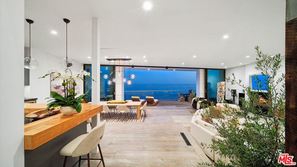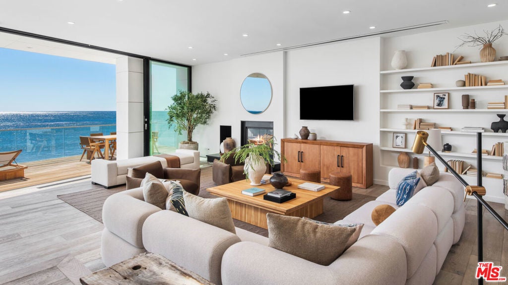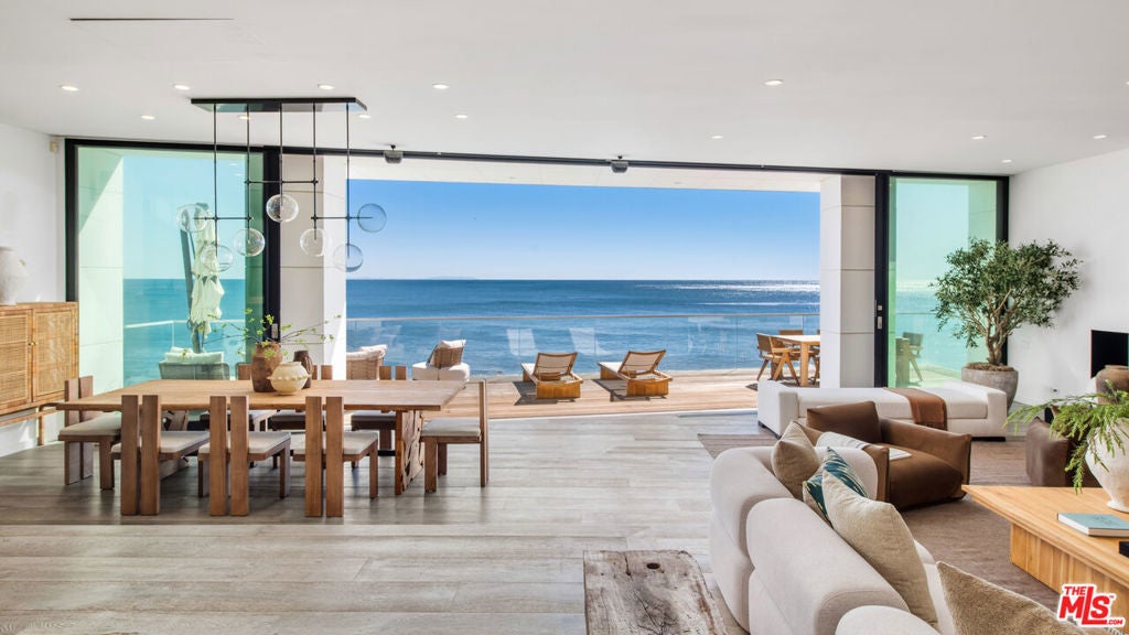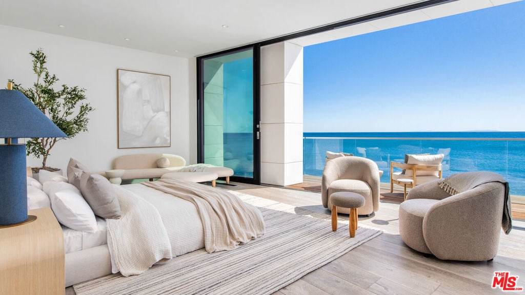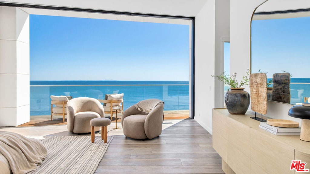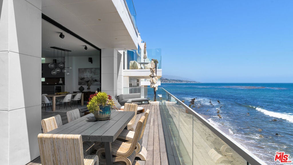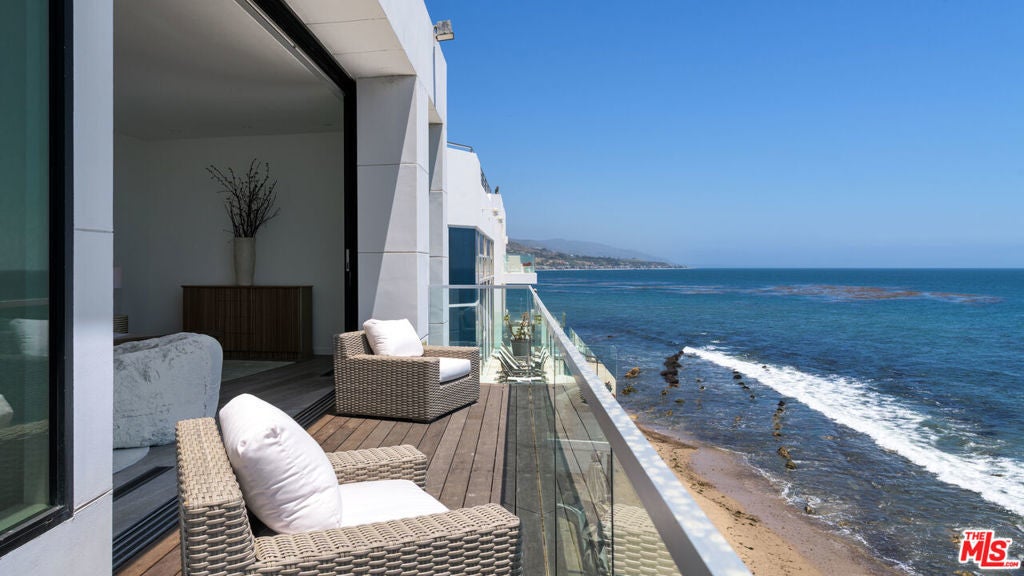 Set within the prestigious, guard-gated enclave of Malibu Cove Colony, this masterfully reimagined oceanfront estate offers an exquisite fusion of refined luxury and relaxed coastal elegance. With sweeping, unobstructed views of the Pacific and a design that celebrates seamless indoor-outdoor living, every element of this residence reflects sophisticated comfort and meticulous craftsmanship.A serene, stone-tiled courtyardframed by sleek built-in seating and lush landscapingwelcomes you through elegant French doors, offering a tranquil prelude to the retreat within. Inside, the home unfolds to reveal breathtaking ocean vistas, rich European oak flooring, and an interior palette curated for warmth, modernity, and timeless grace.The main level is thoughtfully composed, featuring two spacious guest suiteseach with en-suite bathrooms adorned in natural stoneand a refined powder room. The two-car garage is equally considered, equipped with custom cabinetry, a whole-home water filtration system, and a 220V EV charger.Anchoring the home is a spectacular open-concept living area with soaring ceilings, gallery-inspired recessed Lutron lighting, and floor-to-ceiling glass sliders that invite the ocean breeze and endless horizon indoors. Designed for both relaxed lounging and elevated entertaining, the living room is centered around a sleek contemporary fireplace and can be effortlessly transformed into a private home cinema, complete with a hidden recessed projector, dropdown screen, built-in surround sound, and electric blackout blinds. Custom electric shades and blackout blinds provide comfort and privacy throughout the main living space, adapting the ambiance at the touch of a button.This space flows seamlessly into the oceanfront dining area and out to an expansive full-length terracecrafted for sophisticated entertaining and everyday indulgence. Set beneath a cantilevered canopy, the deck offers multiple zones for al fresco lounging and dining with the Pacific as a breathtaking backdrop.The chef's kitchen is as stunning as it is functional. Anchored by a stone-topped island with bar seating and commanding ocean views, it features custom cabinetry and top-tier appliances including a Samsung smart refrigerator, Sub-Zero wine cooler, Sharp drawer microwave, and a professional-grade six-burner range with griddle. Dual sinks and a walk-in pantrycomplete with additional Sub-Zero refrigeration and extensive storageensure the kitchen is ready for both everyday meals and large-scale entertaining.Ascend beneath a dramatic glass-vaulted ceiling to the upper level, where the primary suite awaitsan extraordinary sanctuary with panoramic ocean views, a private beachfront terrace, wide-plank wood floors, and a tranquil sitting area. The spa-inspired bath evokes the essence of a luxury resort, with a freestanding soaking tub, rainfall shower, pebble-inlaid stone floors, private water closet, and an expansive custom walk-in closet featuring an island and tailored built-ins. For ultimate serenity, both the bedroom and bathroom are outfitted with automated blackout blinds.The upper level also includes a charming bunk room with a cozy reading nook and two additional guest suiteseach enhanced with skylights, elegantly renovated en-suite baths, and bespoke cabinetry.On the lower level, a versatile bonus room offers the perfect space for a gym, home office, playroom, or studiodesigned to meet your evolving needs with comfort and privacy.Throughout the home, intelligent design and modern convenience reignfrom central air conditioning and whole-home Lutron lighting to designer finishes and architectural statements at every turn. At once elegant and effortless, this residence offers an extraordinary opportunity to experience the very best of Malibu beachfront living.