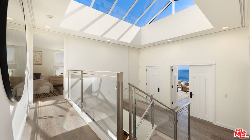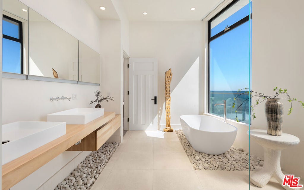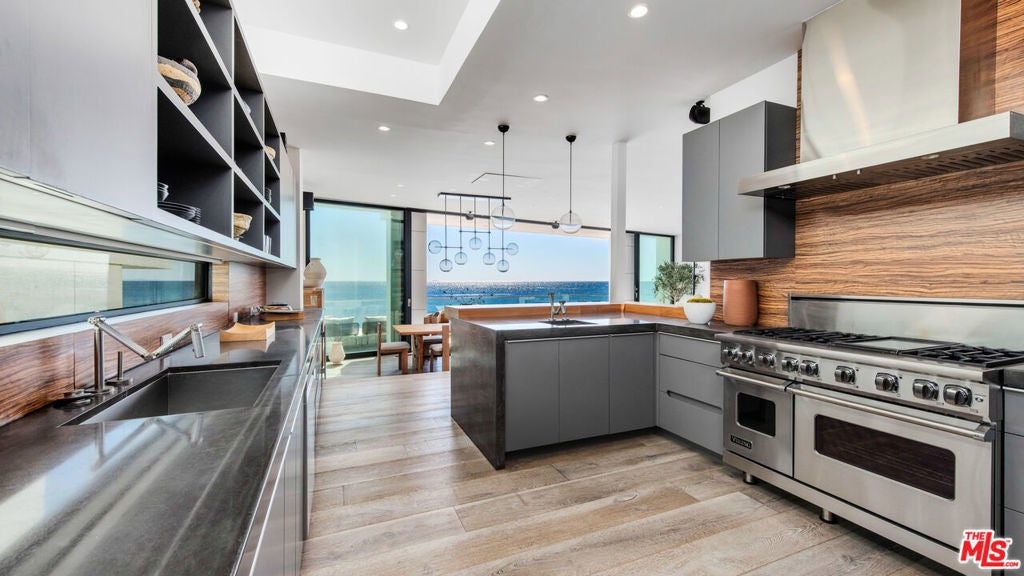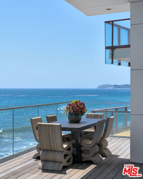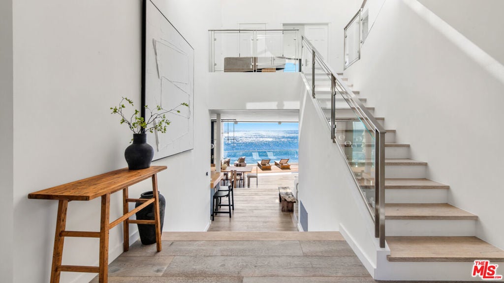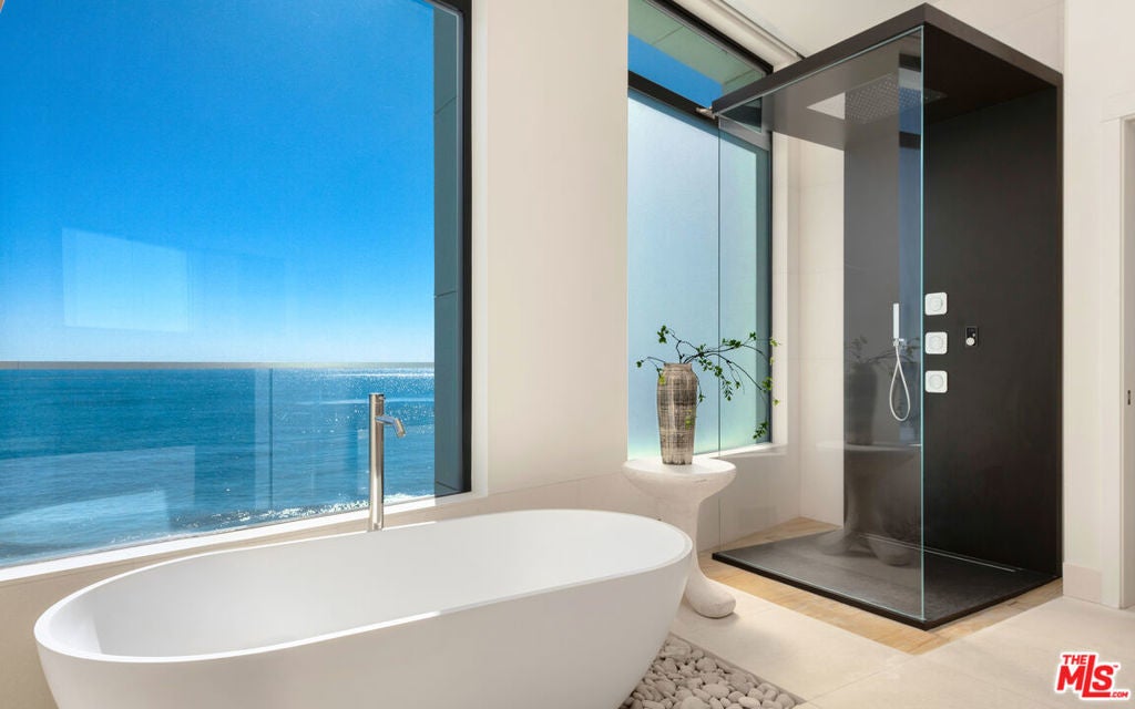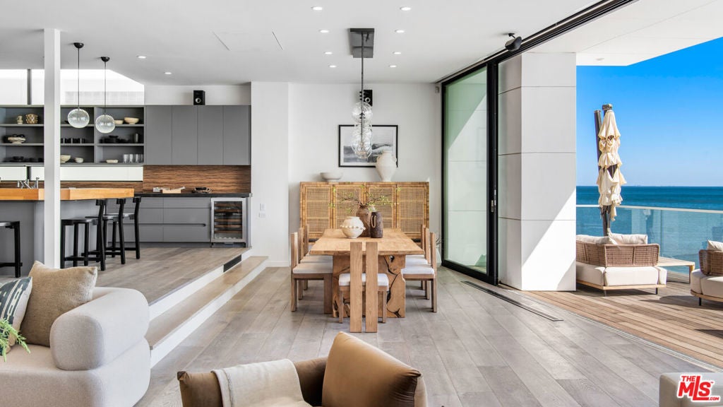 Set within the prestigious, guard-gated enclave of Malibu Cove Colony, this masterfully reimagined oceanfront estate offers an exquisite fusion of refined luxury and relaxed coastal elegance. With sweeping, unobstructed views of the Pacific and a design that celebrates seamless indoor-outdoor living, every element of this residence reflects sophisticated comfort and meticulous craftsmanship.A serene, stone-tiled courtyardframed by sleek built-in seating and lush landscapingwelcomes you through elegant French doors, offering a tranquil prelude to the retreat within. Inside, the home unfolds to reveal breathtaking ocean vistas, rich European oak flooring, and an interior palette curated for warmth, modernity, and timeless grace.The main level is thoughtfully composed, featuring two spacious guest suiteseach with en-suite bathrooms adorned in natural stoneand a refined powder room. The two-car garage is equally considered, equipped with custom cabinetry, a whole-home water filtration system, and a 220V EV charger.Anchoring the home is a spectacular open-concept living area with soaring ceilings, gallery-inspired recessed Lutron lighting, and floor-to-ceiling glass sliders that invite the ocean breeze and endless horizon indoors. Designed for both relaxed lounging and elevated entertaining, the living room is centered around a sleek contemporary fireplace and can be effortlessly transformed into a private home cinema, complete with a hidden recessed projector, dropdown screen, built-in surround sound, and electric blackout blinds. Custom electric shades and blackout blinds provide comfort and privacy throughout the main living space, adapting the ambiance at the touch of a button.This space flows seamlessly into the oceanfront dining area and out to an expansive full-length terracecrafted for sophisticated entertaining and everyday indulgence. Set beneath a cantilevered canopy, the deck offers multiple zones for al fresco lounging and dining with the Pacific as a breathtaking backdrop.The chef's kitchen is as stunning as it is functional. Anchored by a stone-topped island with bar seating and commanding ocean views, it features custom cabinetry and top-tier appliances including a Samsung smart refrigerator, Sub-Zero wine cooler, Sharp drawer microwave, and a professional-grade six-burner range with griddle. Dual sinks and a walk-in pantrycomplete with additional Sub-Zero refrigeration and extensive storageensure the kitchen is ready for both everyday meals and large-scale entertaining.Ascend beneath a dramatic glass-vaulted ceiling to the upper level, where the primary suite awaitsan extraordinary sanctuary with panoramic ocean views, a private beachfront terrace, wide-plank wood floors, and a tranquil sitting area. The spa-inspired bath evokes the essence of a luxury resort, with a freestanding soaking tub, rainfall shower, pebble-inlaid stone floors, private water closet, and an expansive custom walk-in closet featuring an island and tailored built-ins. For ultimate serenity, both the bedroom and bathroom are outfitted with automated blackout blinds.The upper level also includes a charming bunk room with a cozy reading nook and two additional guest suiteseach enhanced with skylights, elegantly renovated en-suite baths, and bespoke cabinetry.On the lower level, a versatile bonus room offers the perfect space for a gym, home office, playroom, or studiodesigned to meet your evolving needs with comfort and privacy.Throughout the home, intelligent design and modern convenience reignfrom central air conditioning and whole-home Lutron lighting to designer finishes and architectural statements at every turn. At once elegant and effortless, this residence offers an extraordinary opportunity to experience the very best of Malibu beachfront living.
