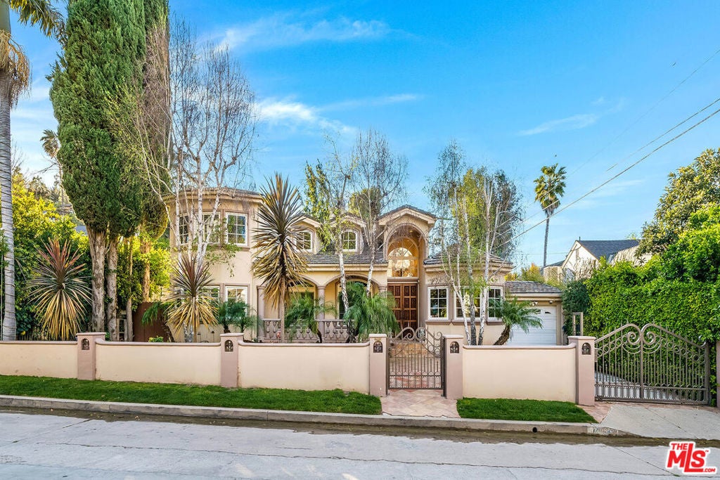 Behind private gates in one of Sherman Oaks' most coveted South of Ventura enclaves, this exceptional Mediterranean estate offers 4 bedrooms and 4.5 bathrooms across approximately 3,687 sq ft of living space on a 7,403 sq ft lot, blending timeless architecture with refined luxury. A dramatic two-story living room with exposed wood beams, skylights, and a statement fireplace creates an impressive sense of scale and natural light, while arched passageways, custom millwork, and rich finishes add warmth and character throughout. Designed for both elegant entertaining and everyday comfort, the formal dining room and expansive chef's kitchen showcase granite countertops, custom cabinetry, premium stainless appliances, a Viking six-burner range with double ovens, and a generous center island, all flowing seamlessly into the breakfast area and inviting family room with fireplace, built-in bar, and wine refrigeration. Two ensuite bedrooms are conveniently located on the main level, including a private guest suite with French doors opening to the grounds. Upstairs, the luxurious primary suite offers soaring ceilings, a romantic balcony, spa-inspired bath with soaking tub and oversized shower, dual vanities, a dressing area, and a spacious walk-in closet. The lush backyard evokes a private resort with tropical landscaping, a sparkling pool and spa, multiple covered entertaining areas, a fully equipped outdoor kitchen with built-in BBQ, bar, and manicured lawn creating the ultimate indoor-outdoor lifestyle in a secure and beautifully designed South of Ventura residence.