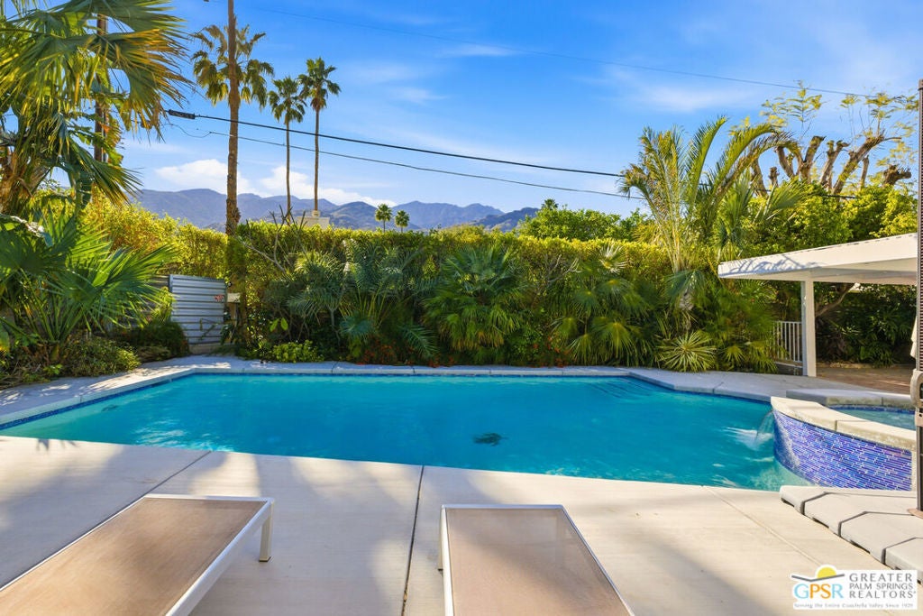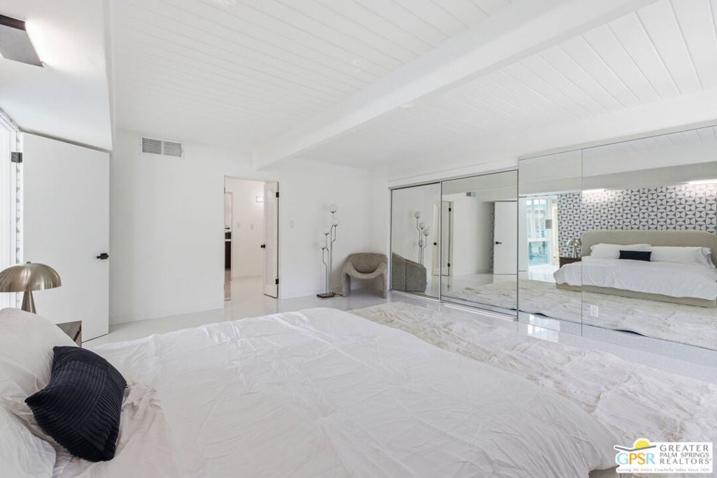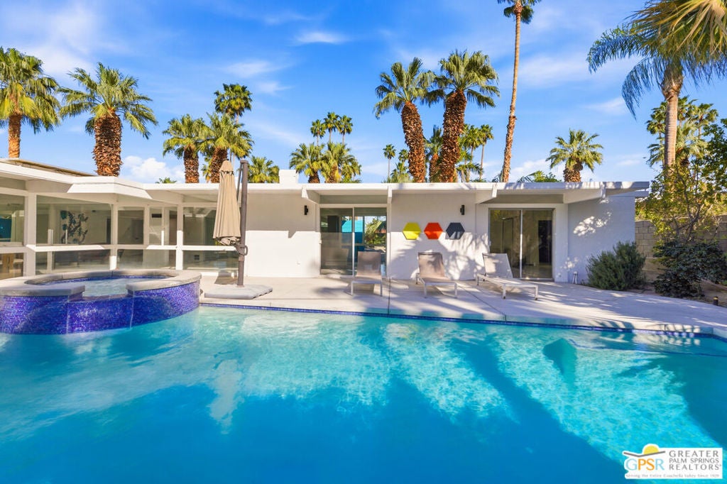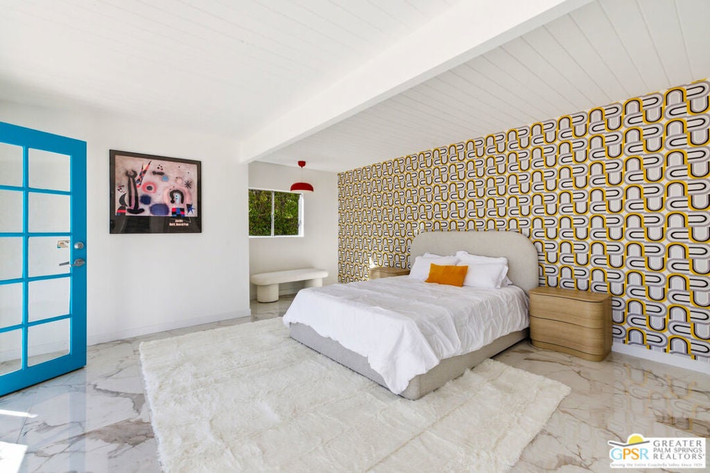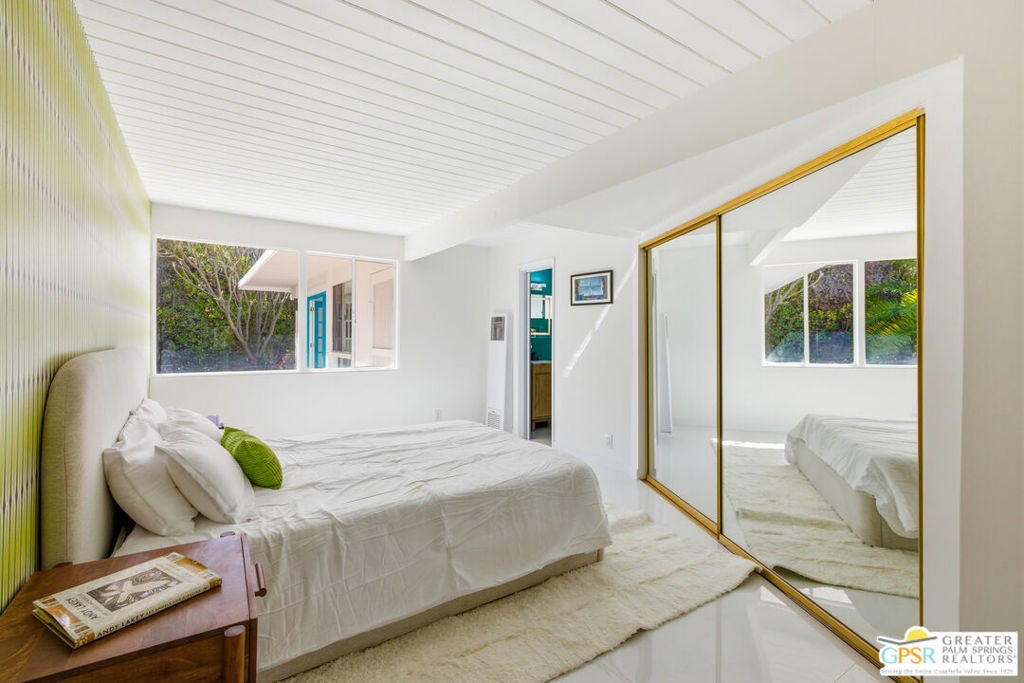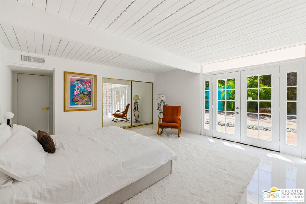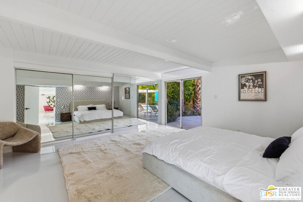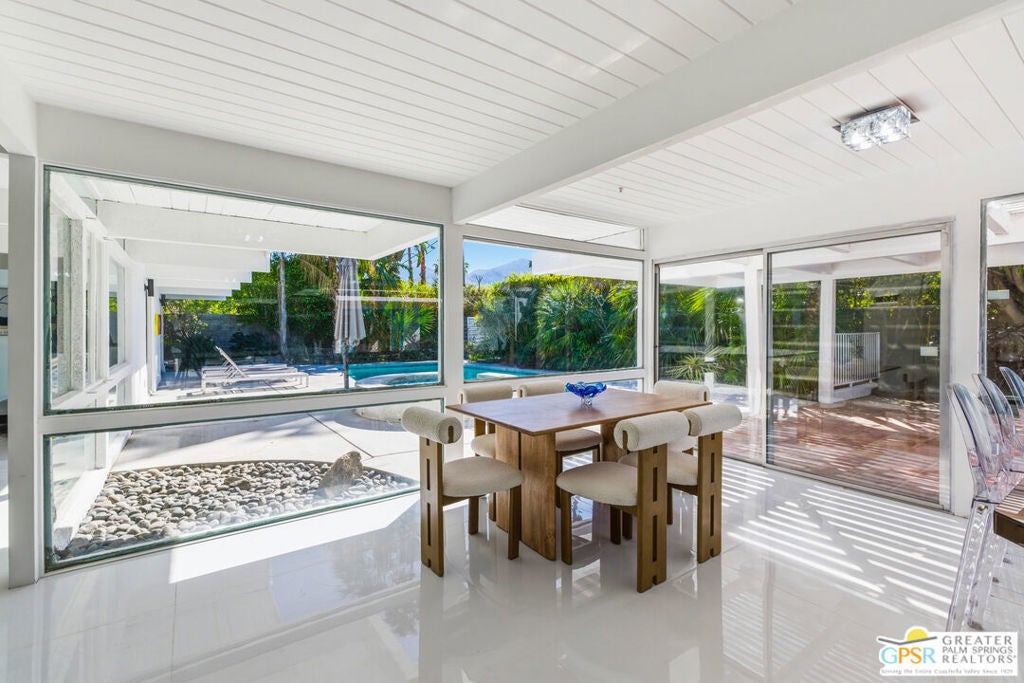 Smashing! Mid Century at its finest. Huge (3743 square foot) amazing home. Built in 1956, it features the most quintessential elements of Mid Century Modern Architecture; post and beam construction, tongue and groove ceilings, walls of glass allowing pool and mountain views, 4 beds, 4 ensuite baths, kitchen, living room, fireplace, dining room, bar, office, breakfast room. Newly and beautifully refurbished. The seller has made every attempt to retain as much of the original features as possible e.g. original bathroom tile and sourcing period Kohler low boy toilets from the 1960s. Home is located in Deepwell one of the most desired areas in all of Palm Springs. Deepwell, a private, non windy enclave, close to all amenities without the hustle and bustle. It has long been the home to celebrities and movie stars and generally features elegant homes with manicured lawns on large lots. Property is huge and perfect as single family home, can be used for family gatherings, parties and can also be rented short or long term. Similar size house in the area earned over $100,000 in rental income in 2025. There are still permits available as of this writing but check with city of Palm Springs for current status re short term permits. This lovely residence is alleged to be the former home of a Radio City Rockette built for her by a generous indulgent boyfriend. The perfect place for the new owner to kick up his/her heels! Property is exquisitely furnished and decorated featuring classic modern furnishings and artwork with pieces by Jonathan Adler, Kartell, Milo Baughman, Jens Rison, Ernst Moeckle, Gitzberg, Gruen, Howard, Reggiani, Miro, Sciolari, Murano, Risley and Tretchikoff.