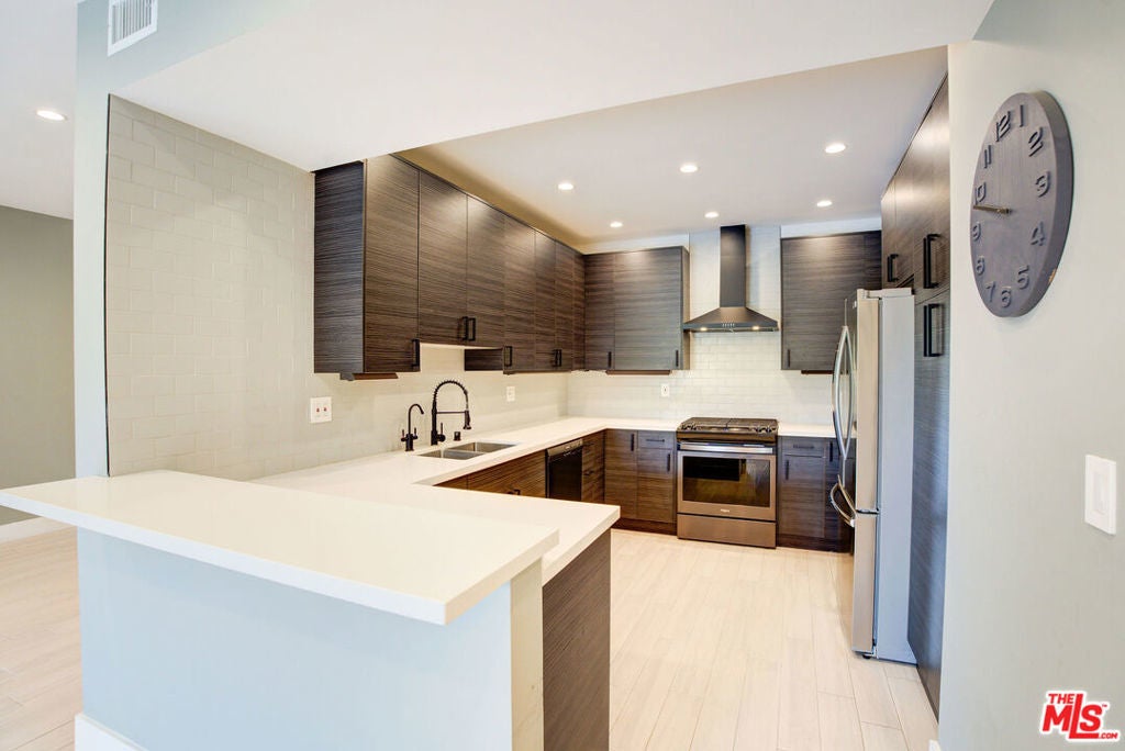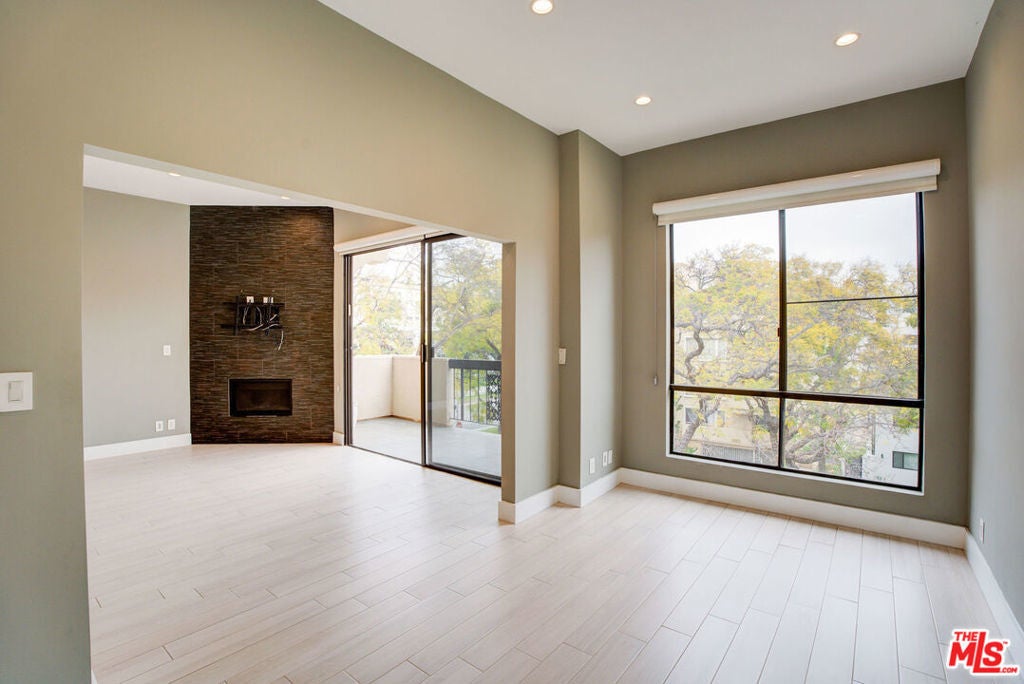 Modern Luxury at the much-desired Beverly Palm. Absolutely Fabulous location in the heart of Beverly Hills that is walking distance to Famed Rodeo Drive with upscale shopping and dining. Amazing spacious top floor, front-facing unit with serene views of beautiful Jacaranda trees that line the street. This recently remodeled 1 bed + den unit is move-in ready and features smooth ceilings, recessed lighting, designer tile flooring, and a gourmet kitchen with solid surface counter tops, soft-close cabinetry, breakfast bar and quality appliances. Light-filled living room is warmed by a cozy fireplace with deco glass rocks, and has a sliding glass door that leads to a large balcony. A roomy master suite features a custom walk-in closet, and adjacent bathroom with marble dual sink vanity, custom shower and tons of storage cabinets. The den could easily be converted to a 2nd bedroom if need be and has bathroom attached to it. This unit is just steps from the elevator, in a secure complex with community swimming pool, spa, sauna, gym, plus tandem 2 car parking and storage in the gated garage. NO SHOWINGS TILL APRIL 7th. Earliest move-in May 11th.